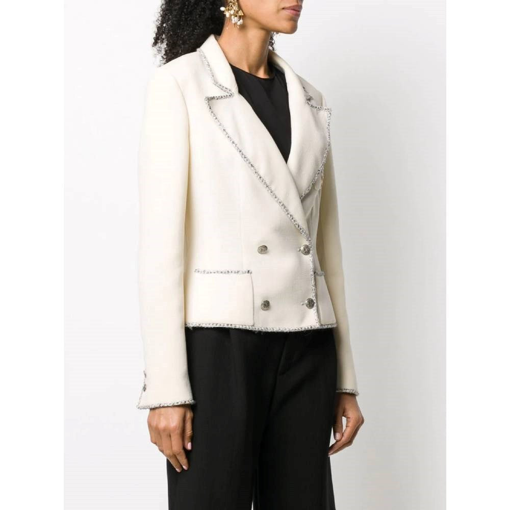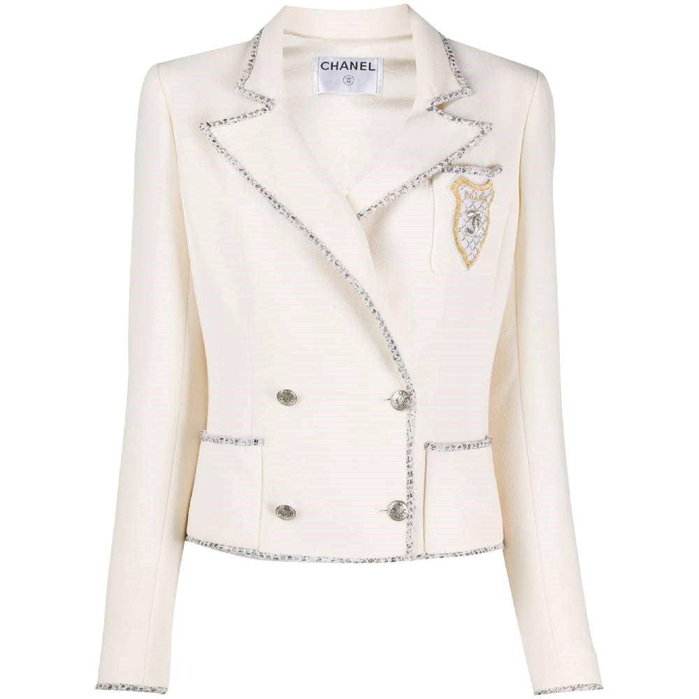 Chanel Limited Edition ivory silk double-breasted jacket with beige and grey bouclé wool edges. Classic lapel collar, silver-tone metal logoed buttons fastening and buttoned cuffs. Two patch pockets and a chest pocket with emboidered logoed coat of arms.