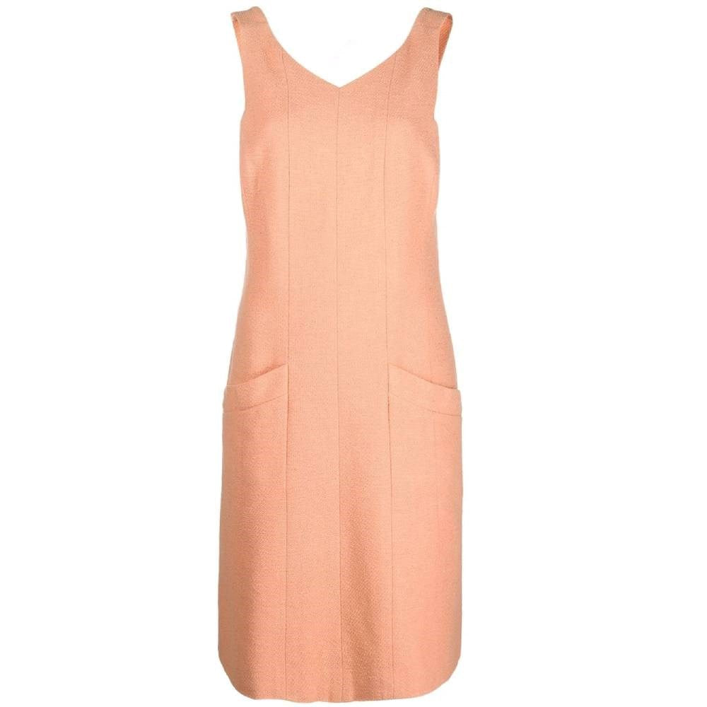 Chanel peach orange cotton sleeveless dress with buttoned shoulder straps. Lightly flared. Two patch front pockets and rear zip fastening. - Year: 1998