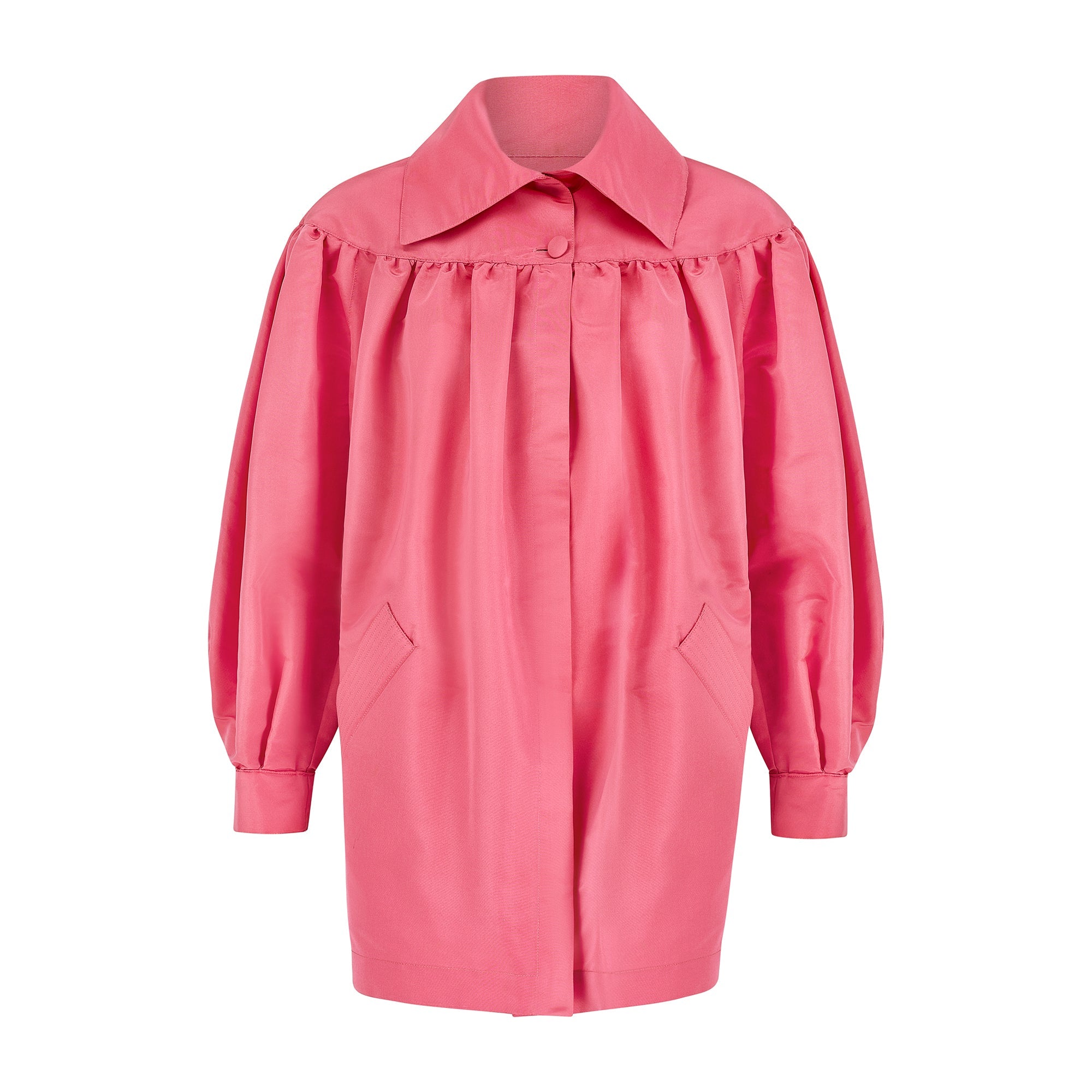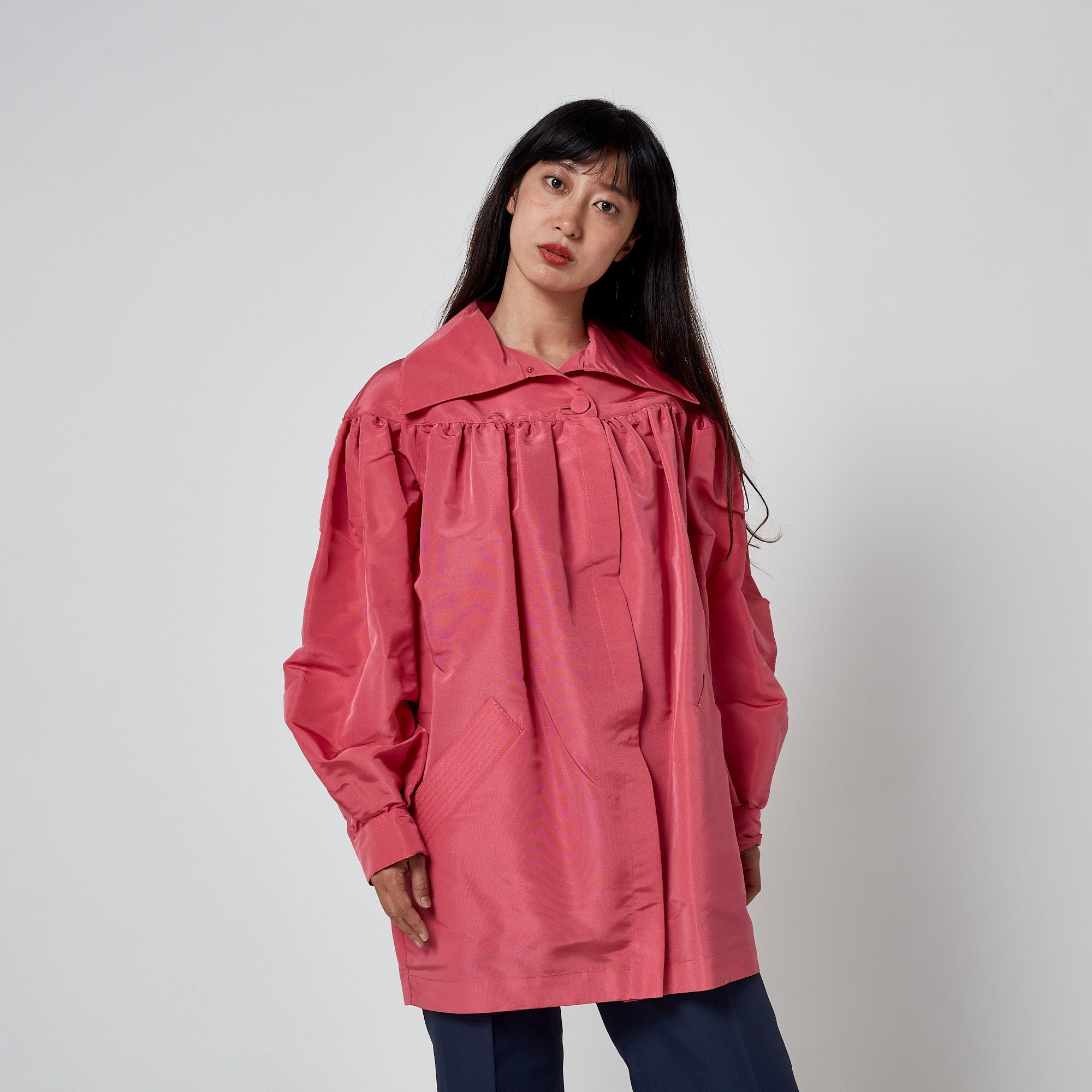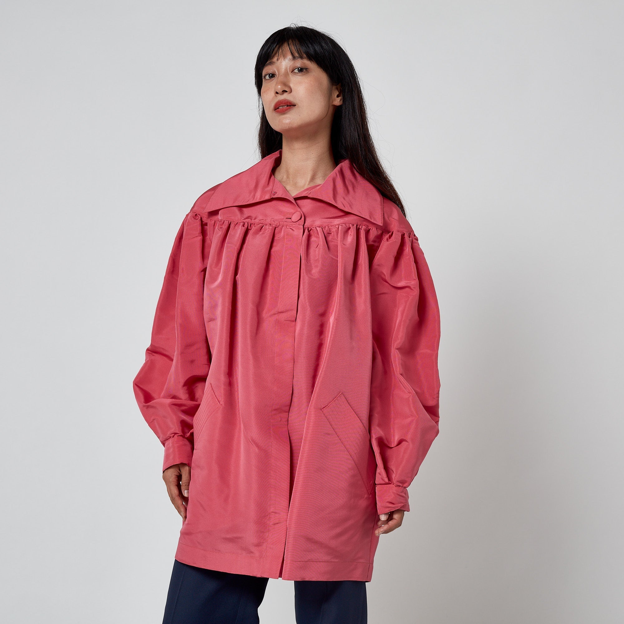 This voluminous pink elongated jacket is a typically vivacious design by the French couturier Christian Lacroix. It dates to the brand's Spring 1991 collection and features the pink “Christian Lacroix Luxe” which was a very high end and expensive ready-to-wear line that was made to near couture standards. Crafted in Italy from pure silk in this eye-catching peachy fuchsia tone, it is tailored to a cocooning silhouette which encircles the body and has a large open-collar with wide lapels which stretch out over the shoulders. The fabric is ruched and gathered just below the shoulders and across the top of the arms, resulting in a bell-sleeve shape to the sleeve. Two slit pockets sit aside the waist, detailed with rows of tonal running stitch which make it appear quilted. A large pink silk-covered button closes this jacket at the centre of the neck and the four hidden snap closures secure the length of it. This jacket is unlined.