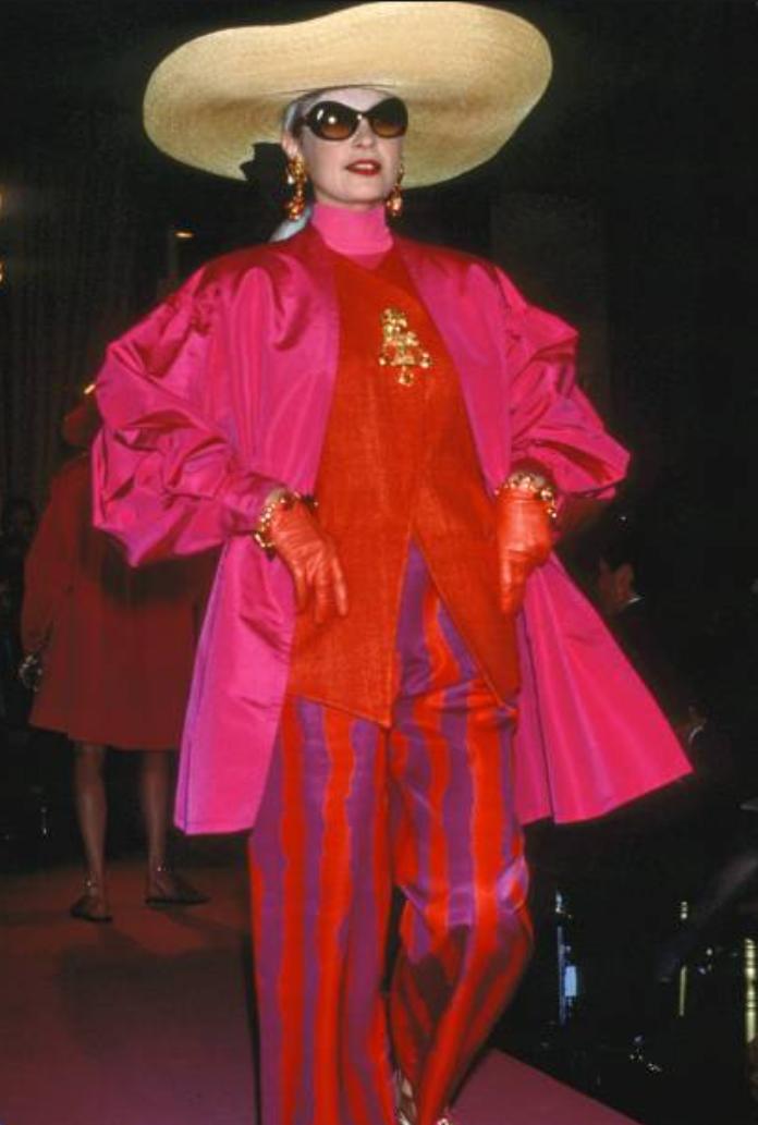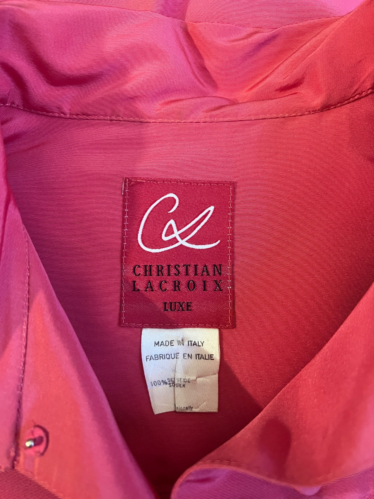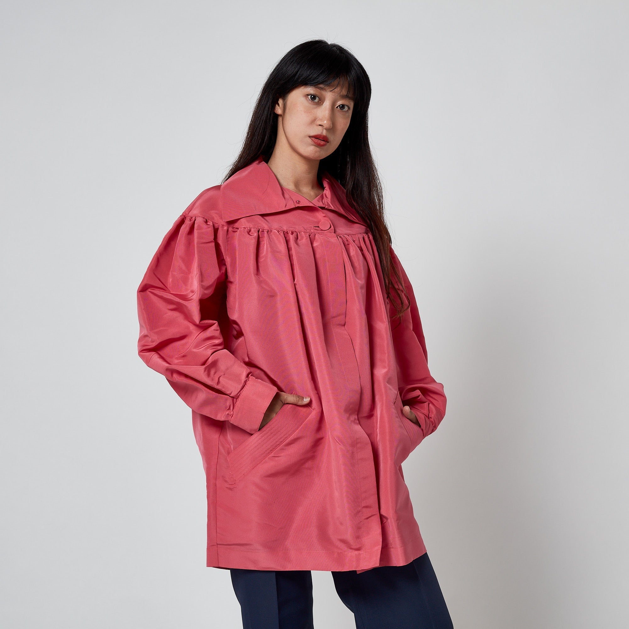 This voluminous pink elongated jacket is a typically vivacious design by the French couturier Christian Lacroix. It dates to the brand's Spring 1991 collection and features the pink “Christian Lacroix Luxe” which was a very high end and expensive ready-to-wear line that was made to near couture standards. Crafted in Italy from pure silk in this eye-catching peachy fuchsia tone, it is tailored to a cocooning silhouette which encircles the body and has a large open-collar with wide lapels which stretch out over the shoulders. The fabric is ruched and gathered just below the shoulders and across the top of the arms, resulting in a bell-sleeve shape to the sleeve. Two slit pockets sit aside the waist, detailed with rows of tonal running stitch which make it appear quilted. A large pink silk-covered button closes this jacket at the centre of the neck and the four hidden snap closures secure the length of it. This jacket is unlined.