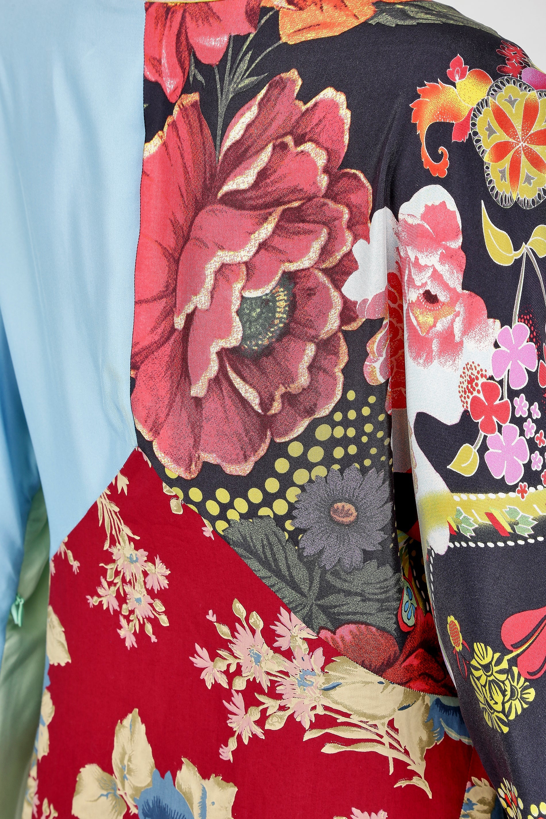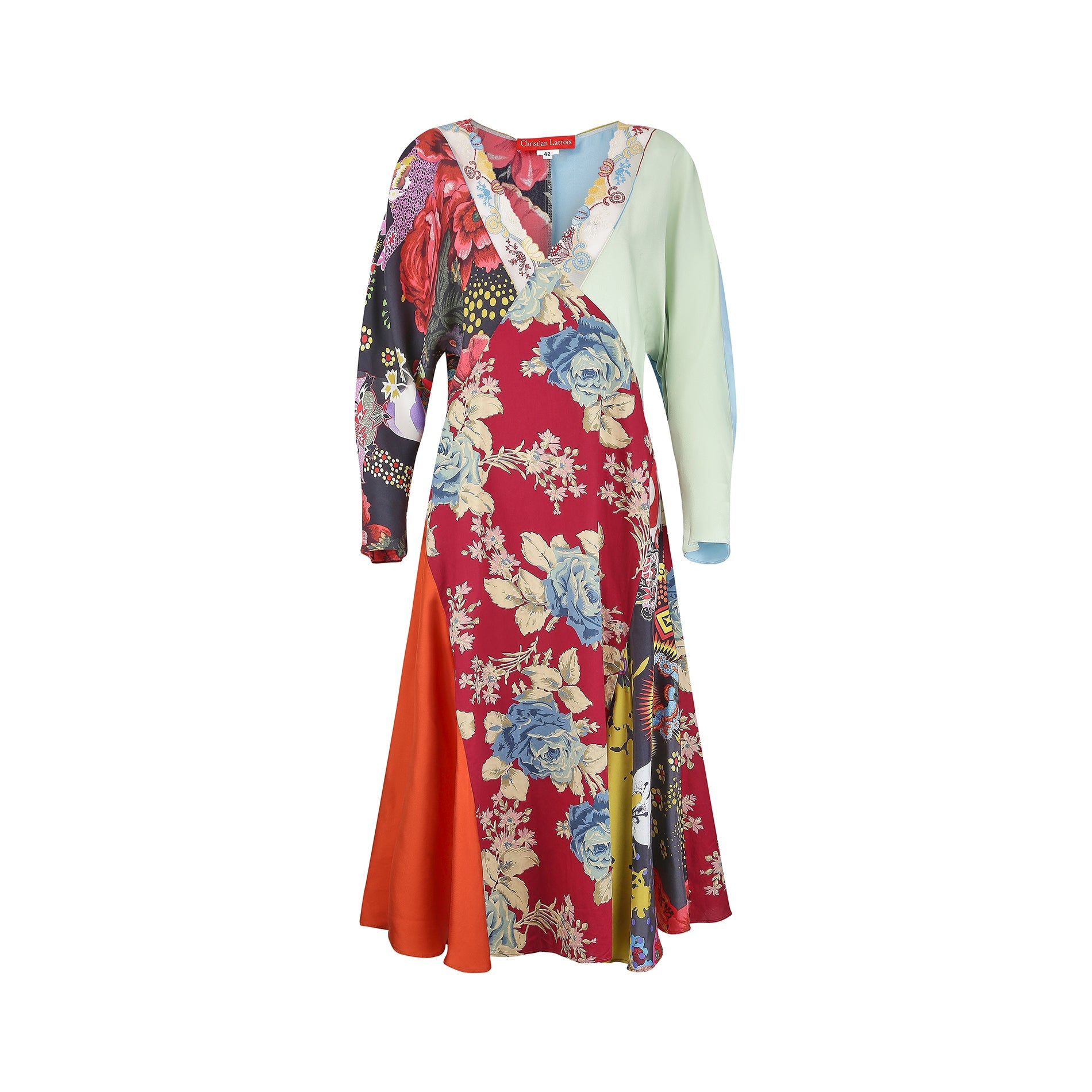 The dress has dolman sleeves and a deep V-neck, trimmed with a colourful embroidered lace in primary colours. The bias-cut patchwork design features a variety of silk panels, and a larger floral cotton panelled piece that makes up the front portion of the dress. This is also repeated in a panel to the reverse. The floral prints are contrasted with blocks of colour in seafoam, green, turquoise, and orange.
