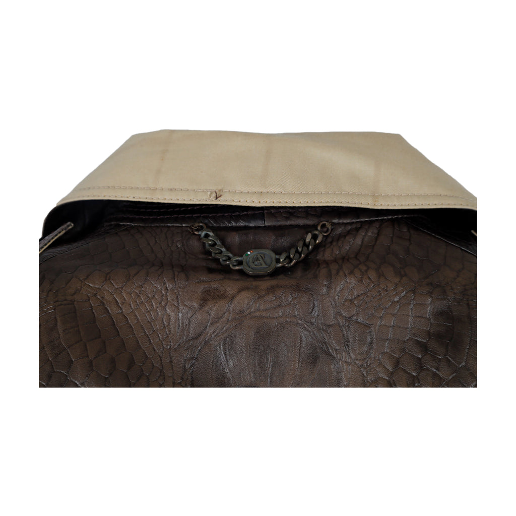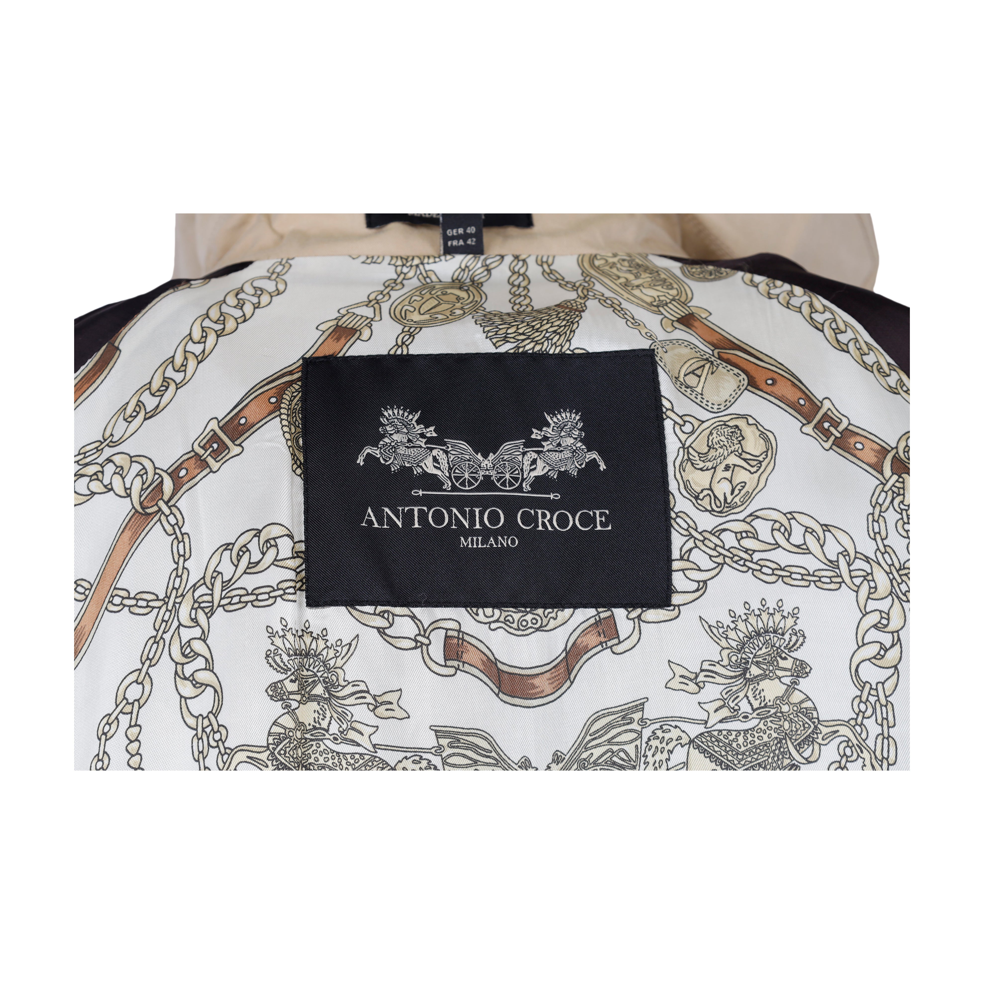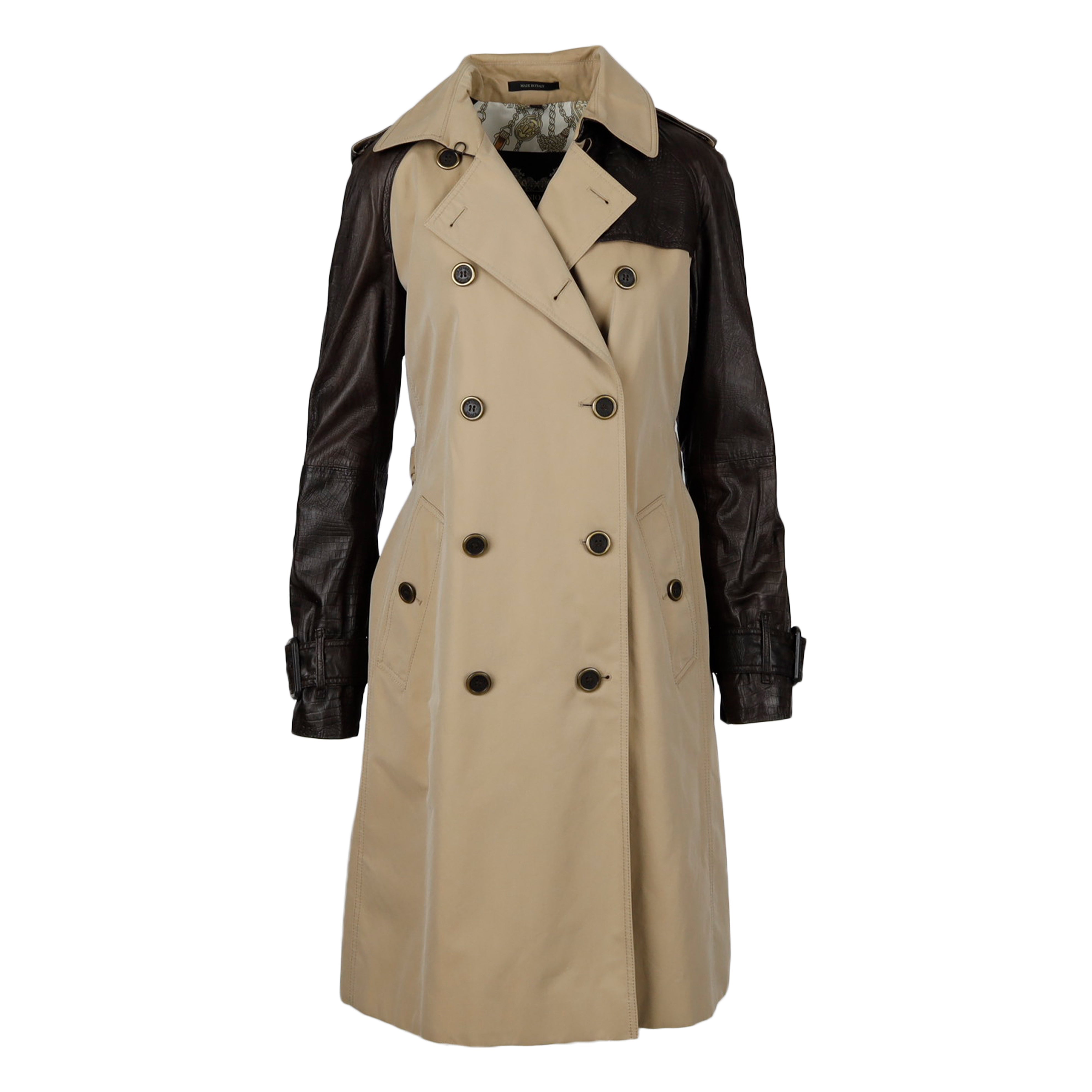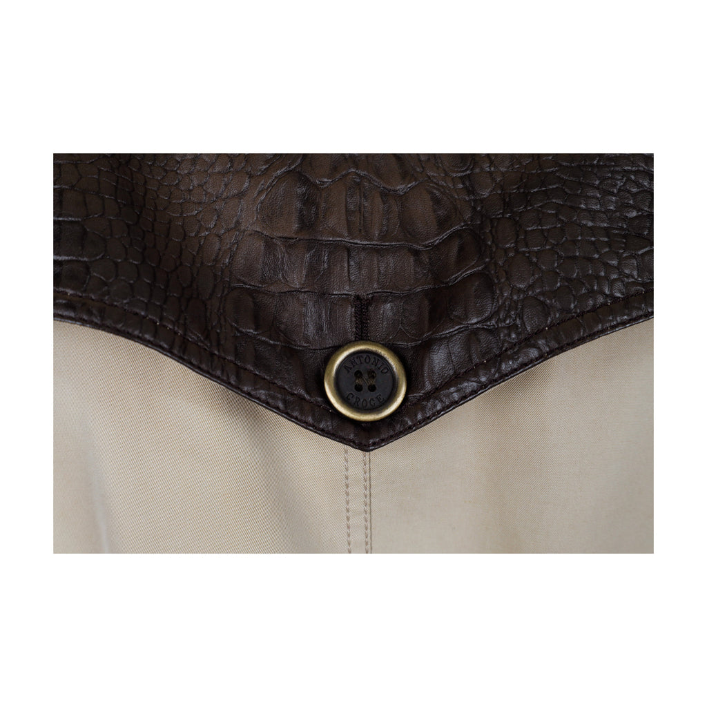 This classic Antonio Croce leather sleeve trench coat is crafted from water-resistant cotton and lined with luxurious viscose fabric. The textured leather arms are detailed with leather-lined buckles, and the chain with a brand logo on the back adds a simple, sophisticated touch. Metal buttons top off the look.