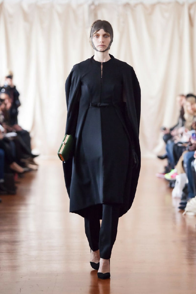 Cocoon Coat A/W 2014: Bias cut cocoon coat is draped into a three dimensional cocoon shape, starting from the back draping over the shoulders which joins to the front sides. The centre front panels are shaped into an "S" shape, and are joined by the seams to the front side panels, starting above the chest, down the bust, then to the waist and straight down to the bottom hem of the coat creating a shape in the centre front. Back sides are cut into a curved shape starting from the top of the shoulders down to hem. Coat has a waist tie. The centre front of coat has hook and eye closures for opening and closing. Fabric:100% wool in black. Size 10 LAST ONE