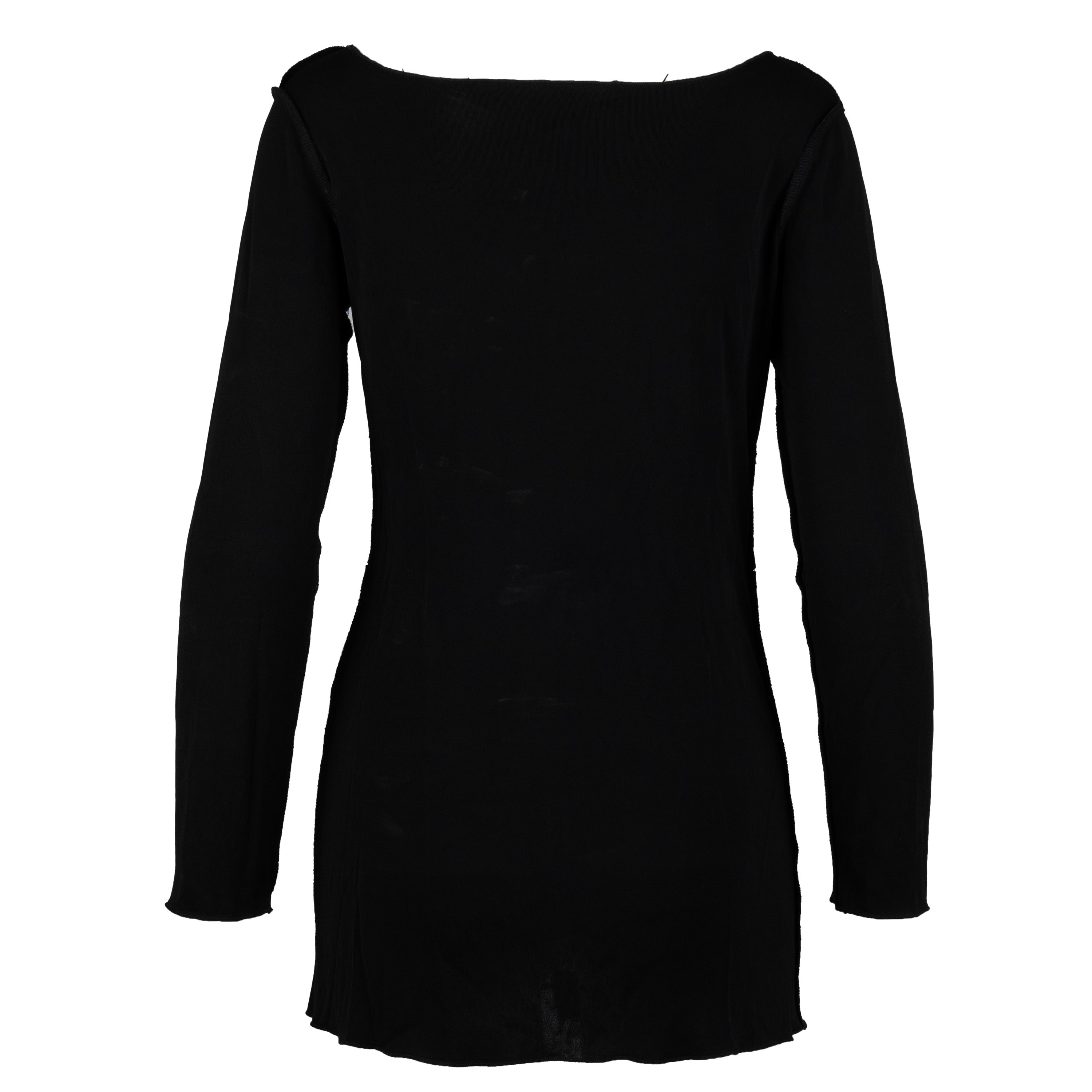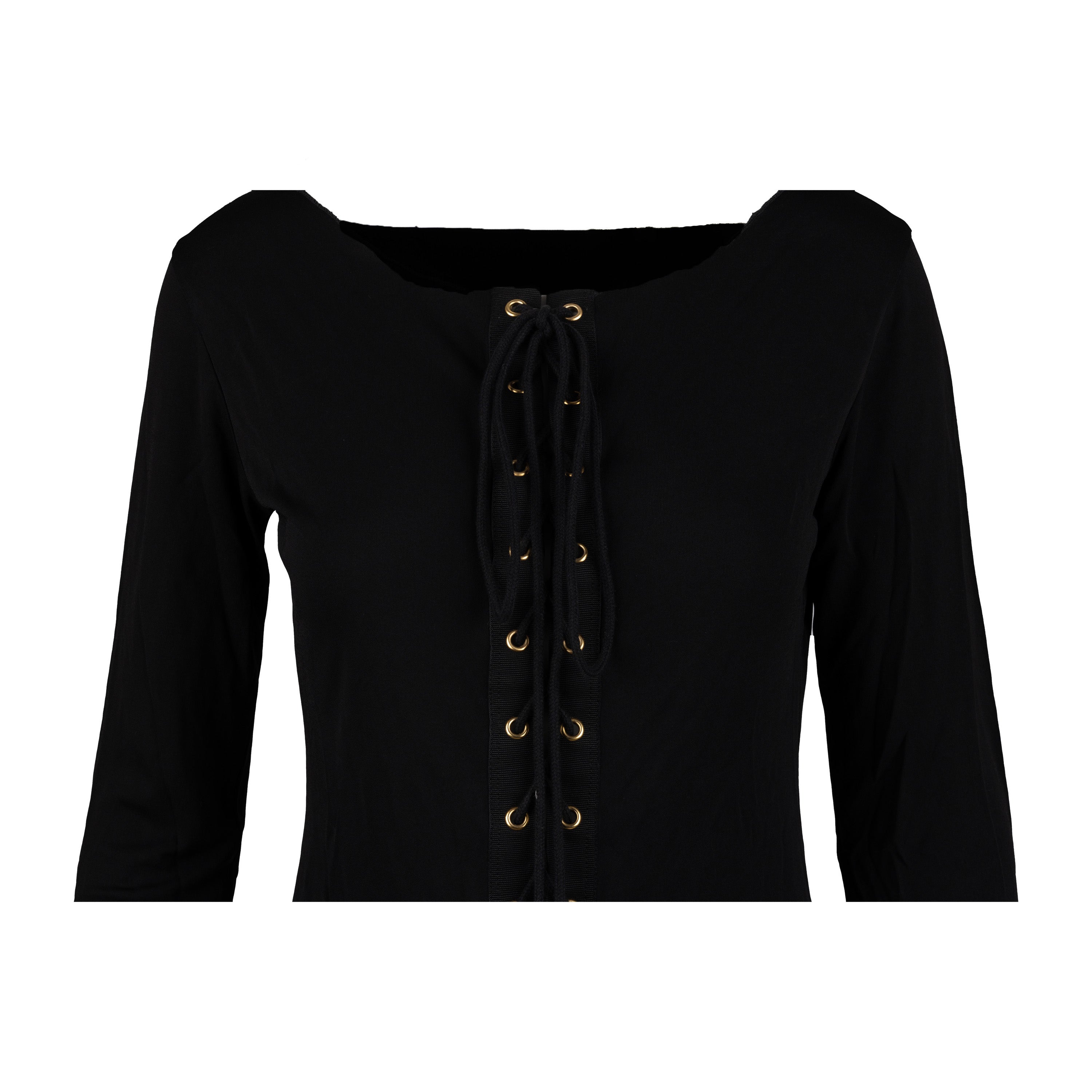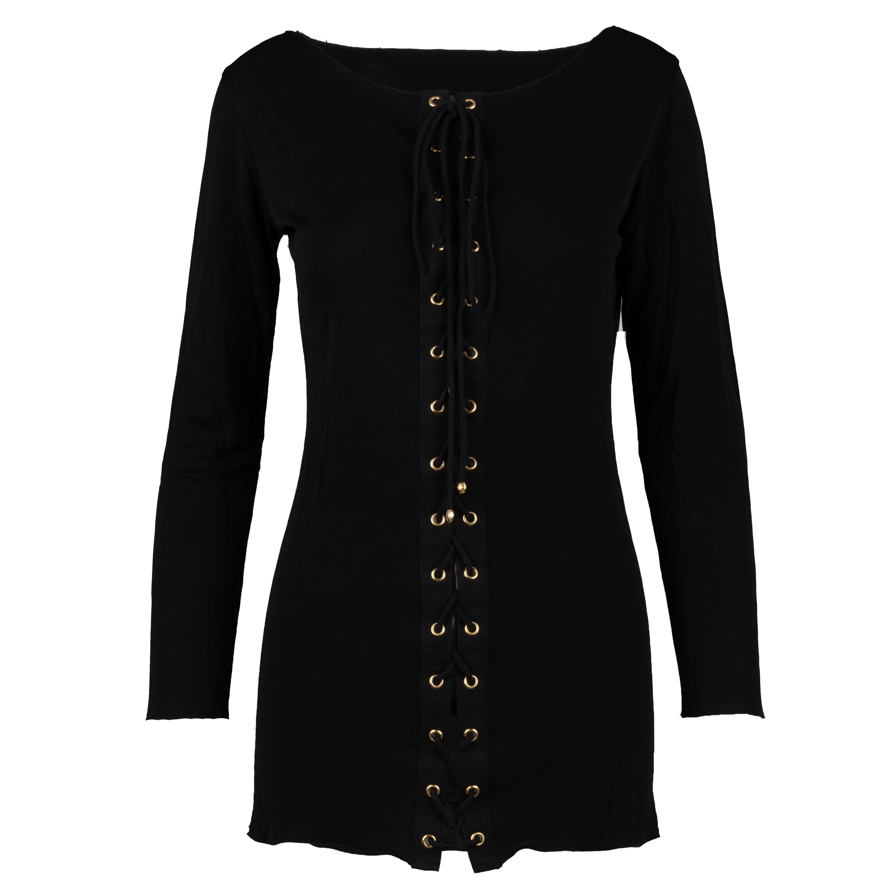 This Collection Privée top features an on-trend boat neck and long fitted sleeves. Crafted from a lightweight black fabric, this long top features a gold tone eyelet lace-up closure along the front for a unique twist.