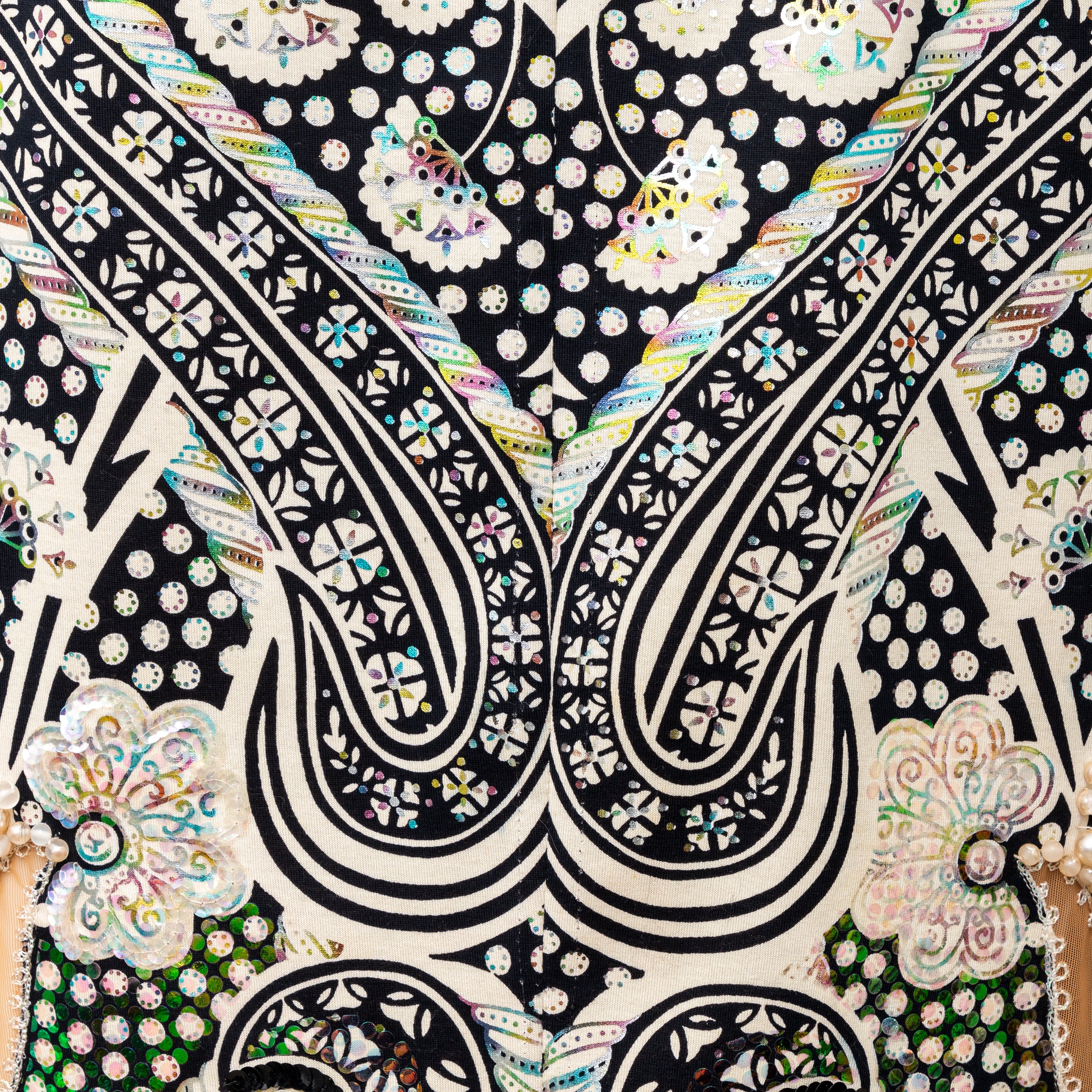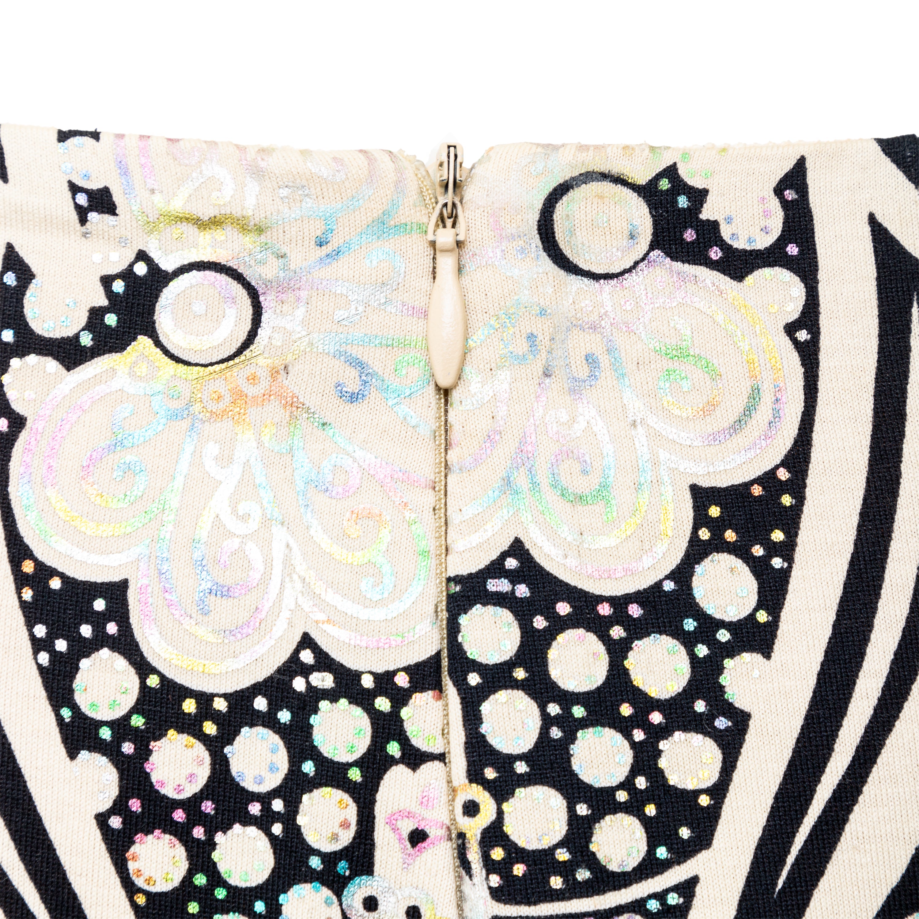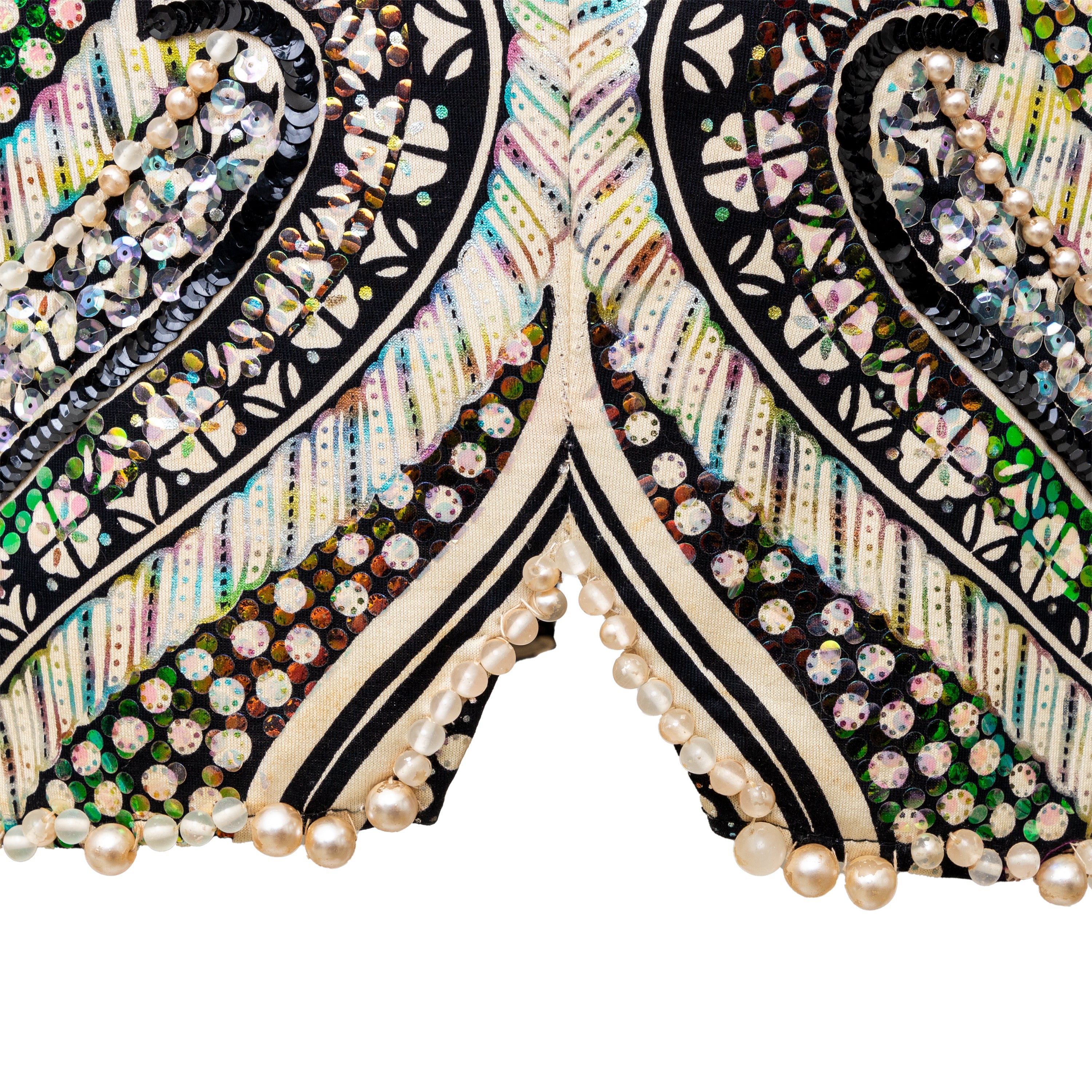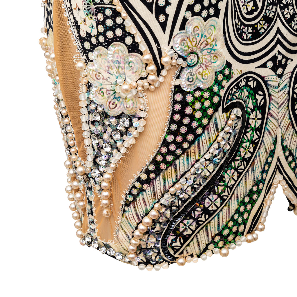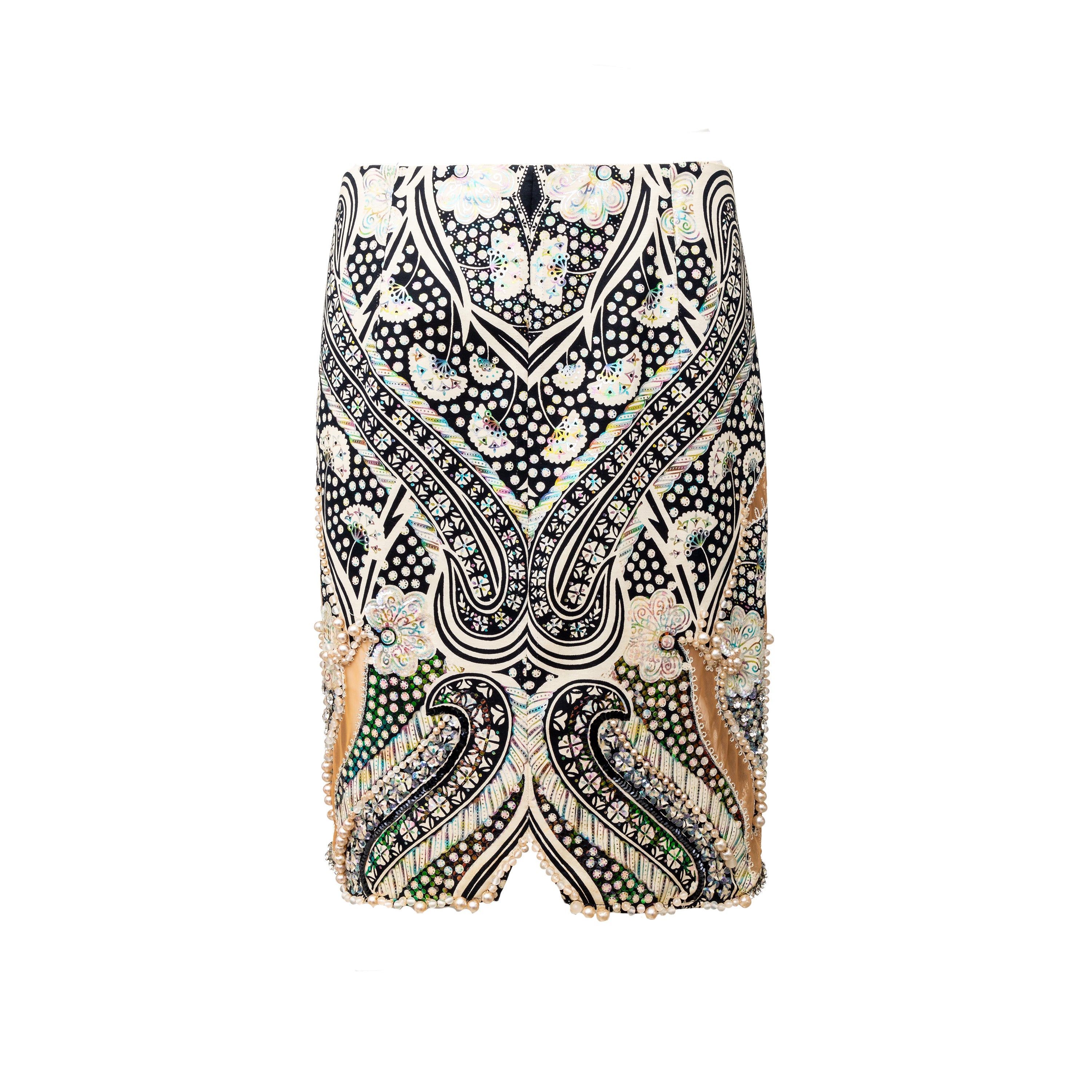 Make a retro statement with this Collection Privée printed skirt. It features a black and white paisley print, embellished with iridescent beads, faux pearls, and crystals. Lined with mesh for added comfort and style.