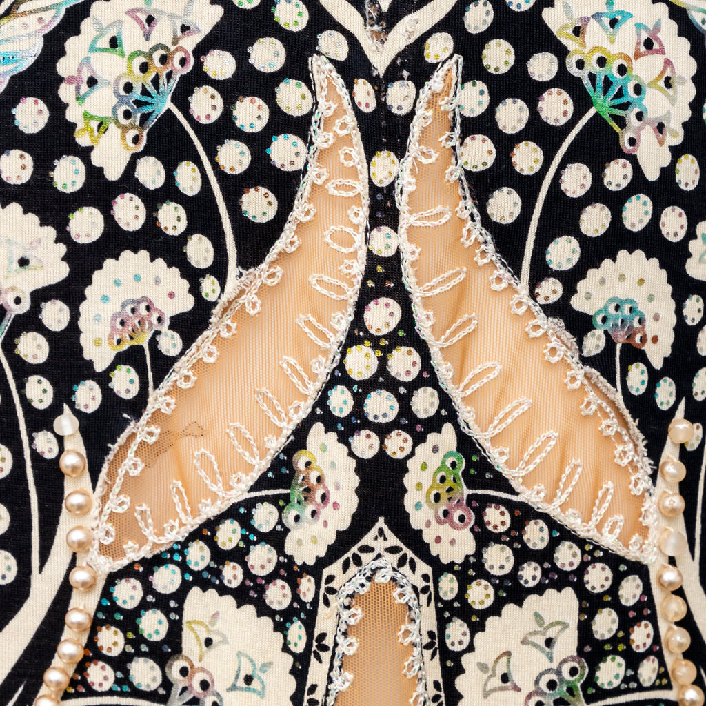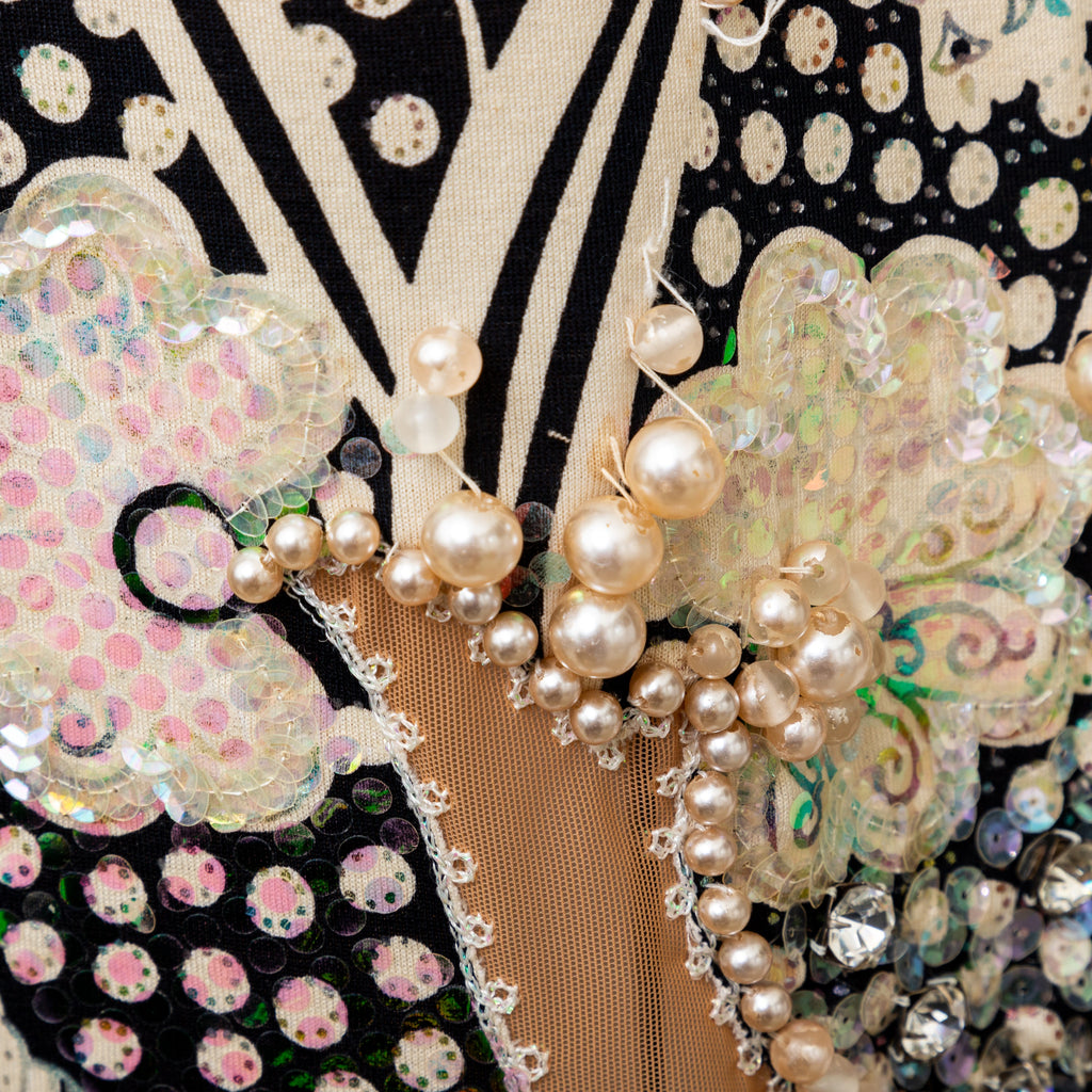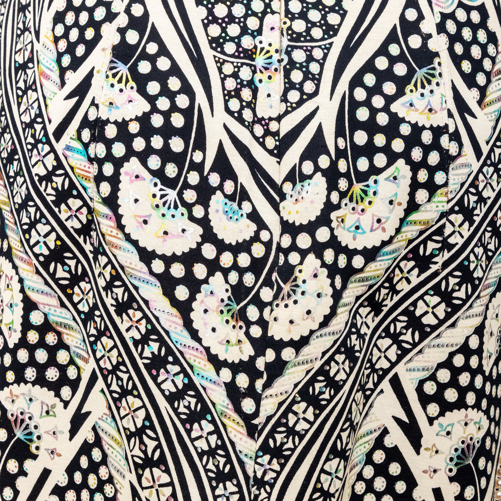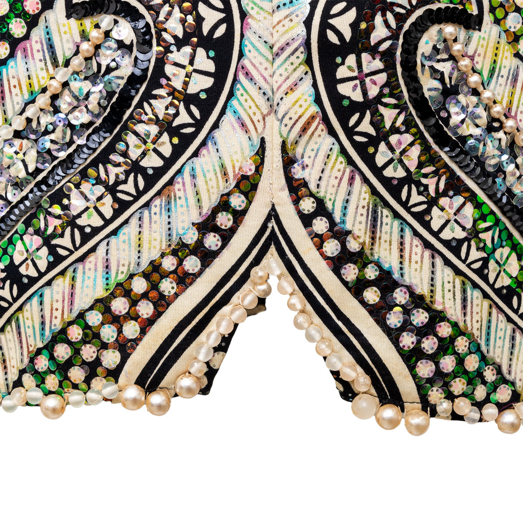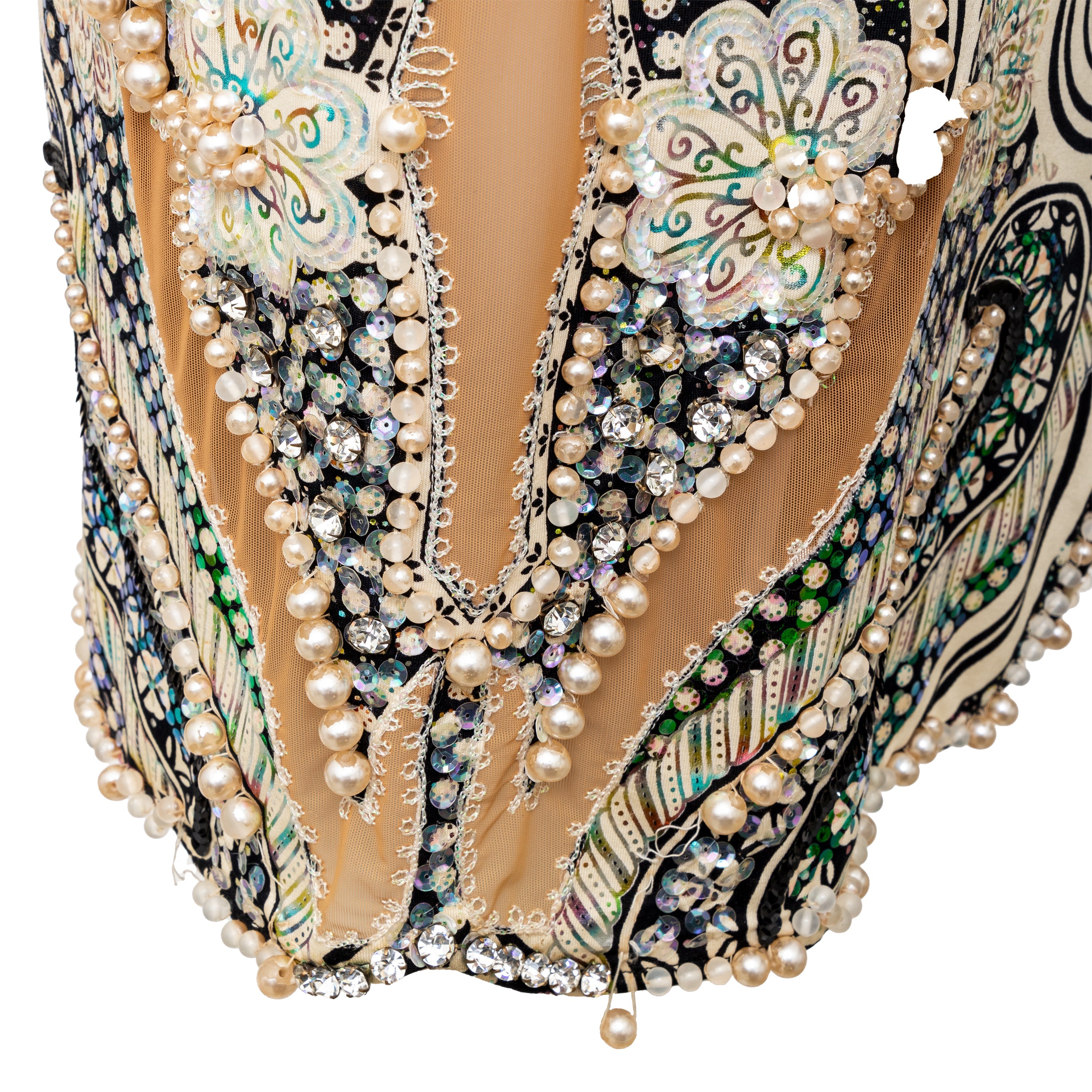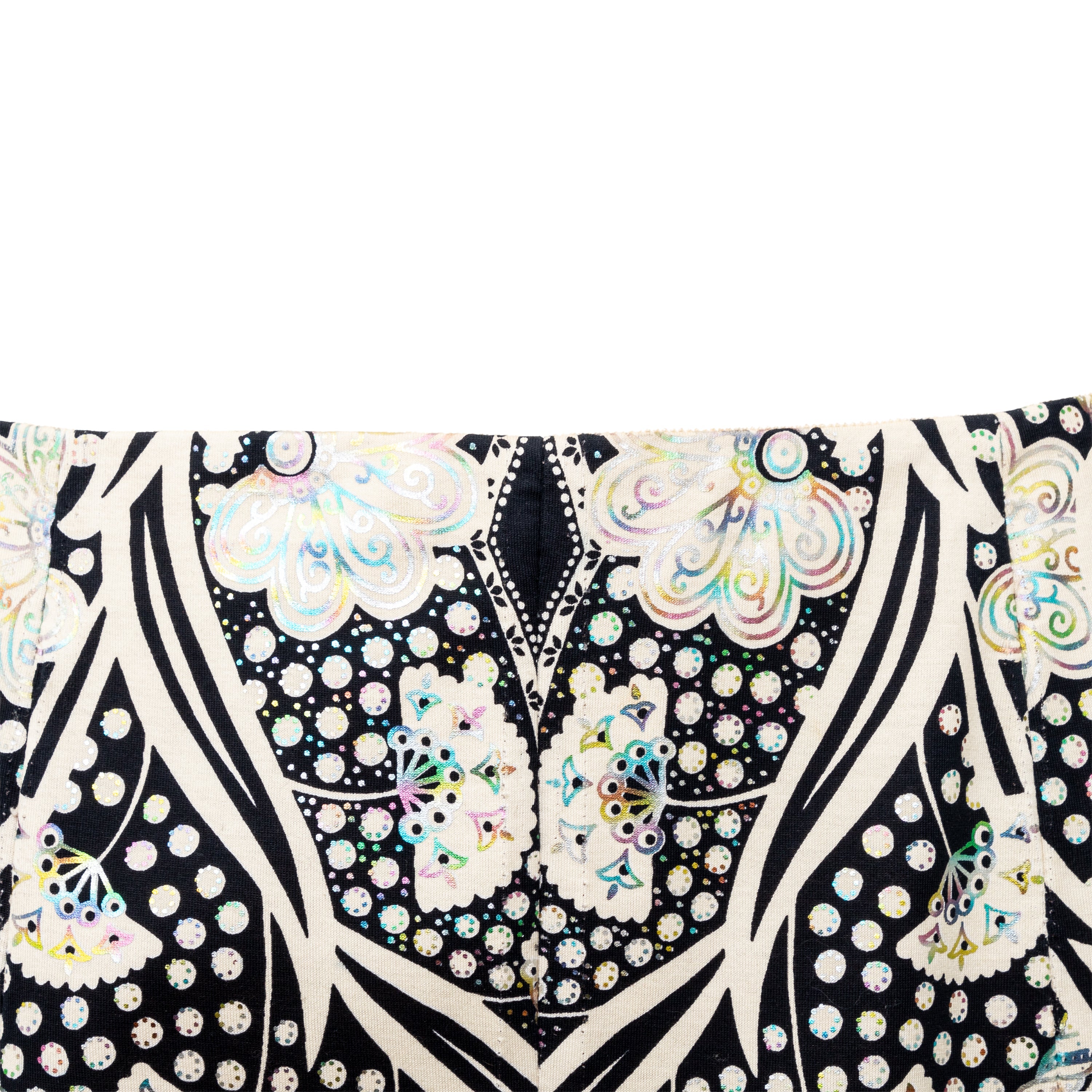 Make a retro statement with this Collection Privée printed skirt. It features a black and white paisley print, embellished with iridescent beads, faux pearls, and crystals. Lined with mesh for added comfort and style.