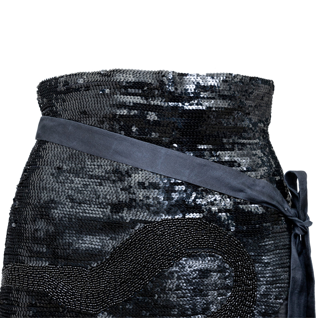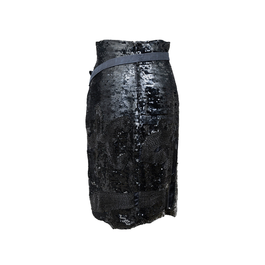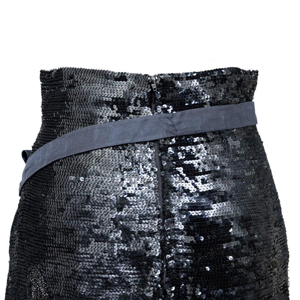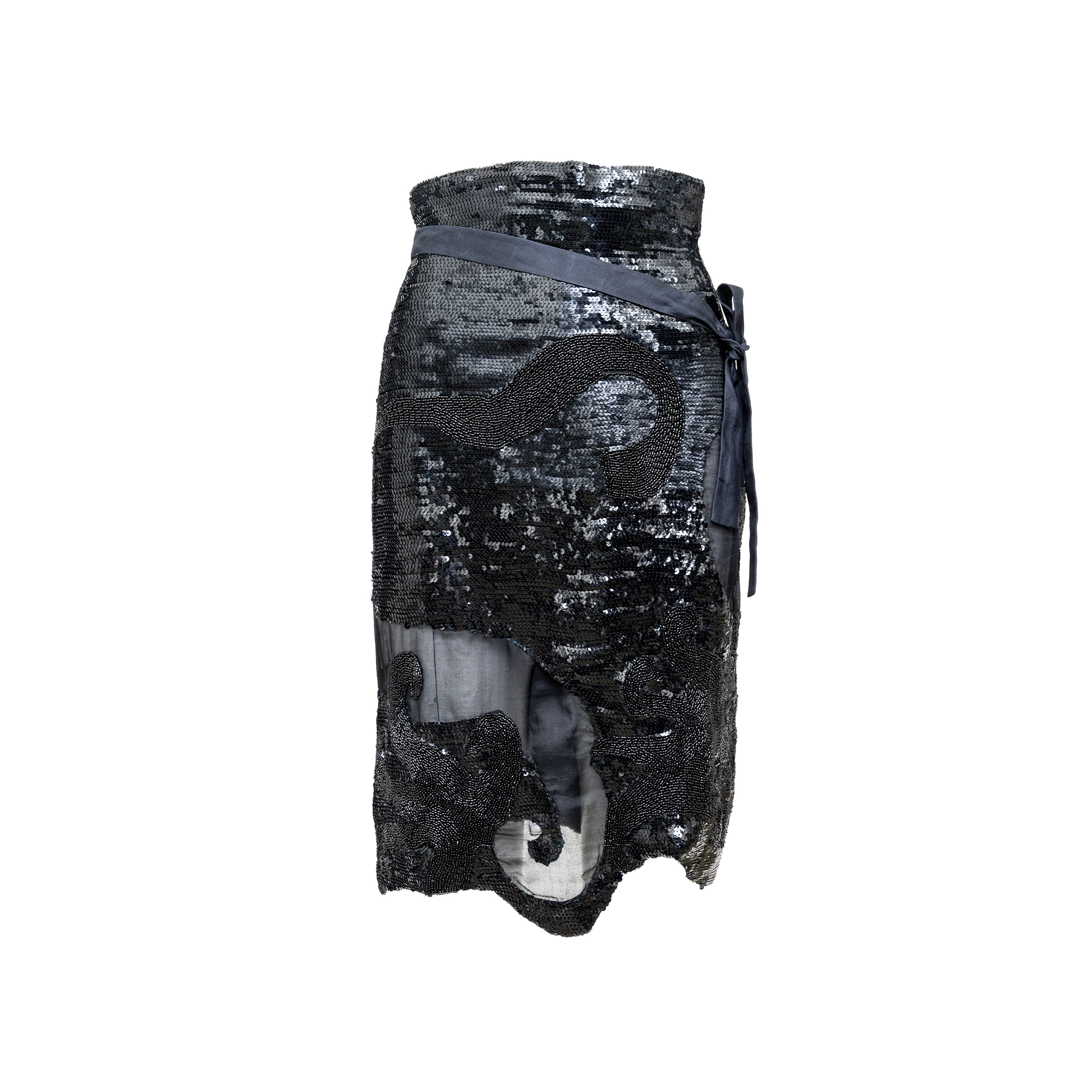 Elevate your wardrobe with the Collection Privée Sequined Skirt. This stunning black skirt is adorned with shimmering sequins and elegant tone-on-tone embroidery. The sheer detailing adds a touch of intrigue, while bead embellishments complete the look.