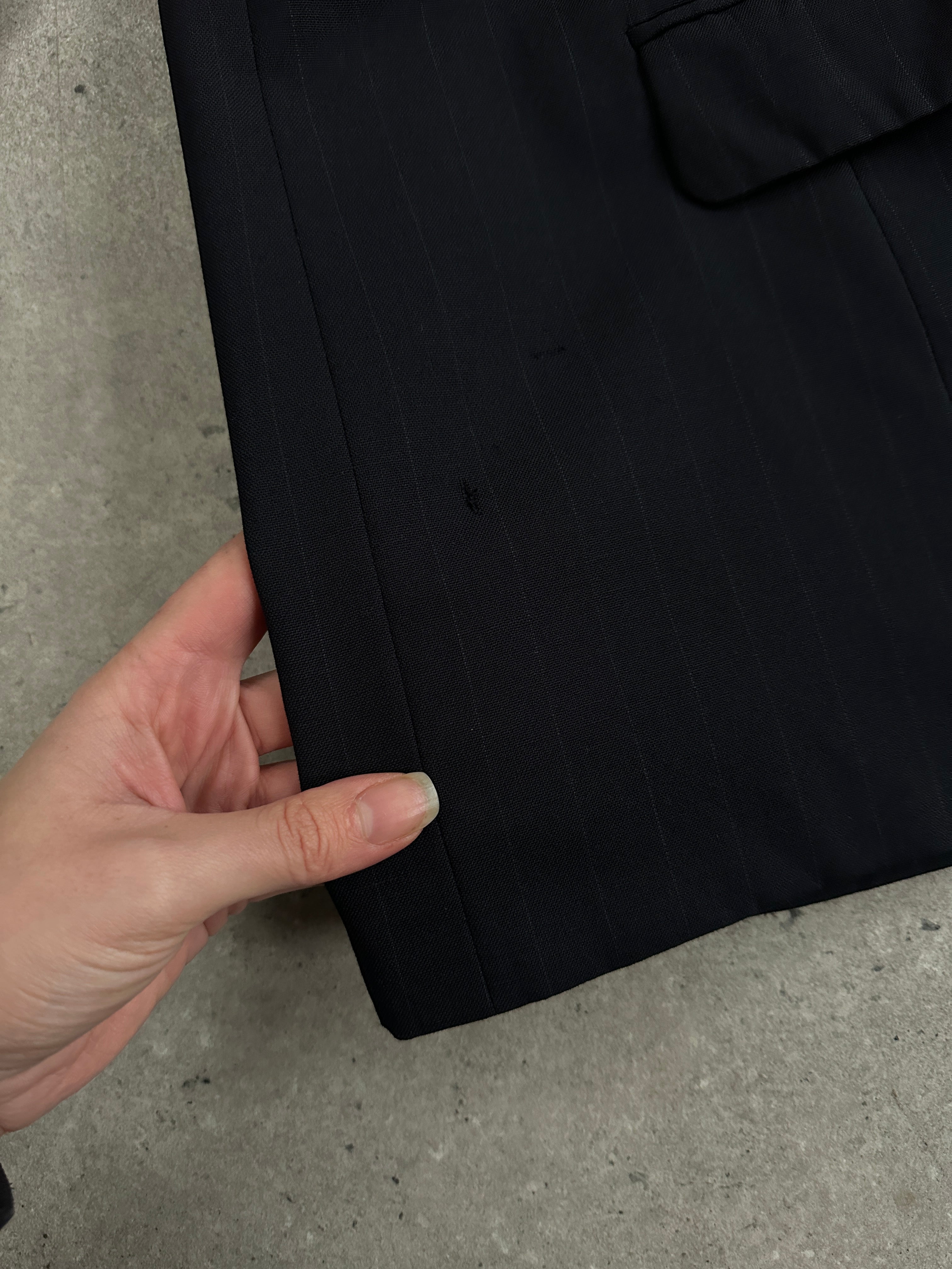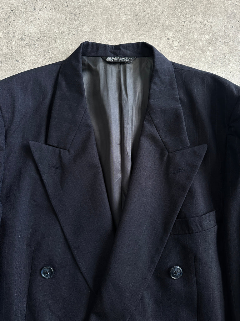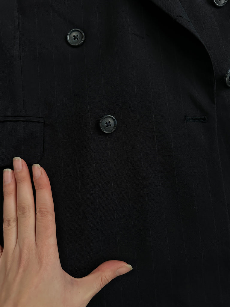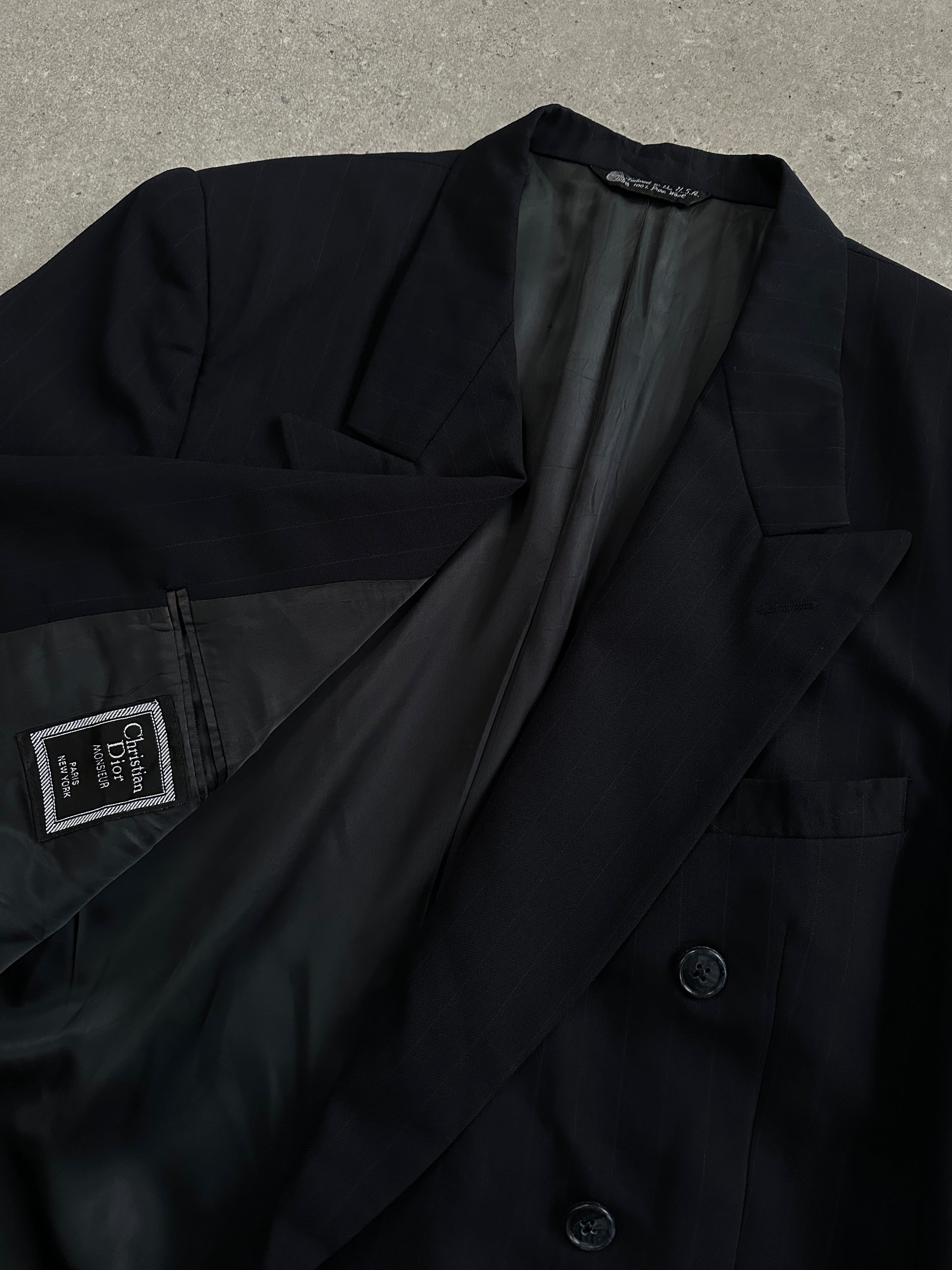 Vintage 1980s navy pinstripe Christian Dior Monsieur blazer in a double breasted cut with a structured silhouette and subtle sheen. Finished with classic peak lapels and a full CD-monogram lining for a refined tailored feel.