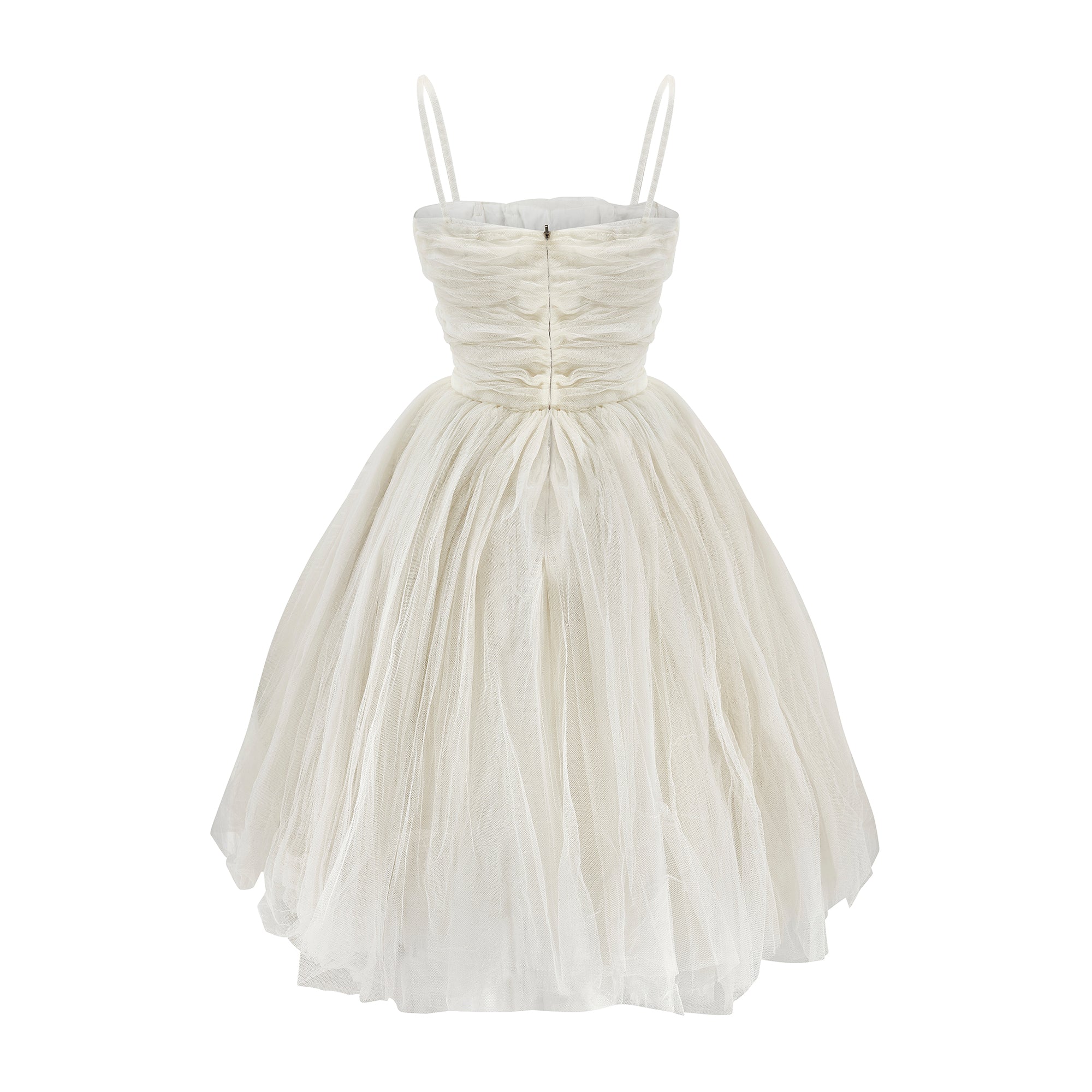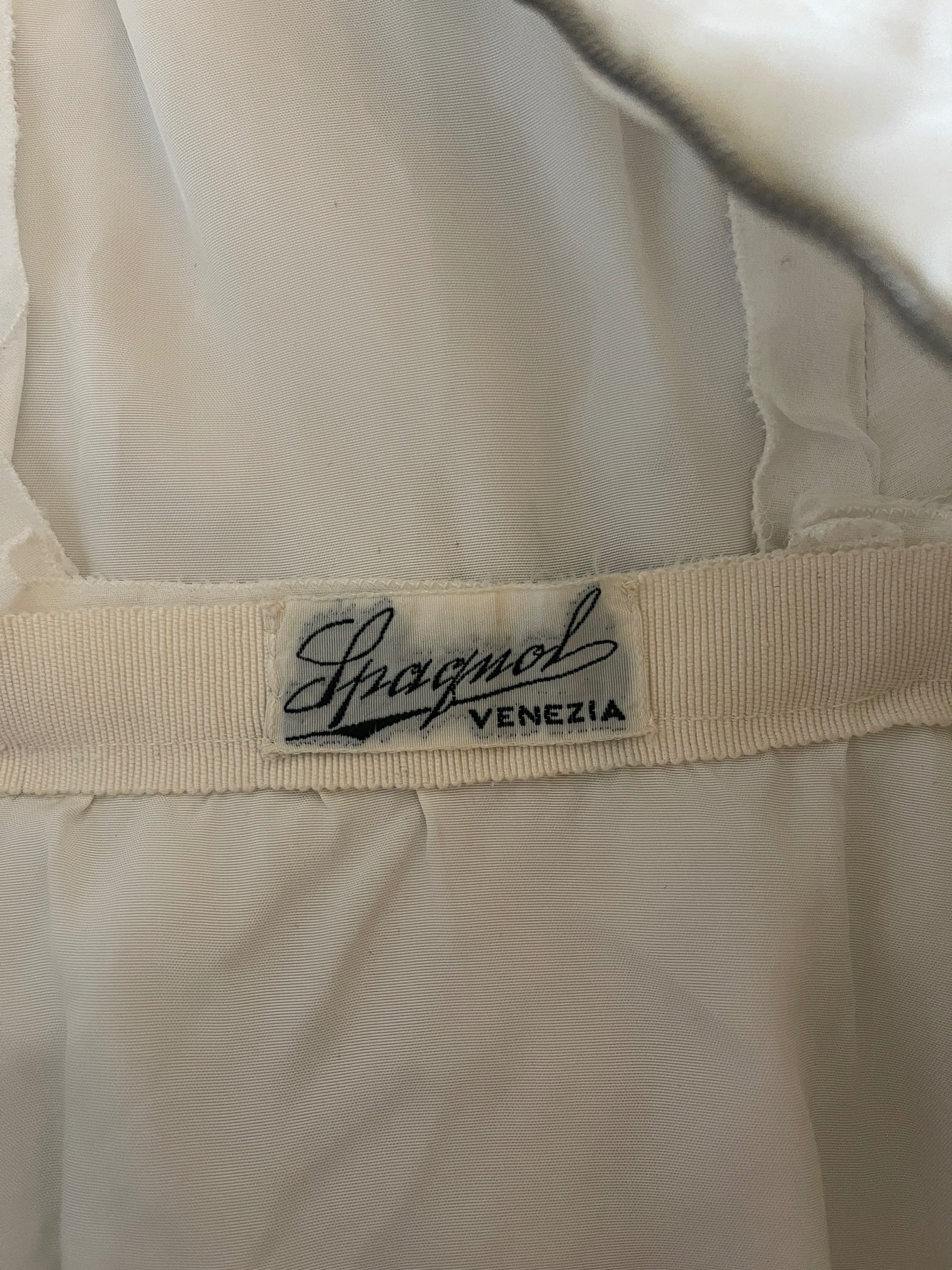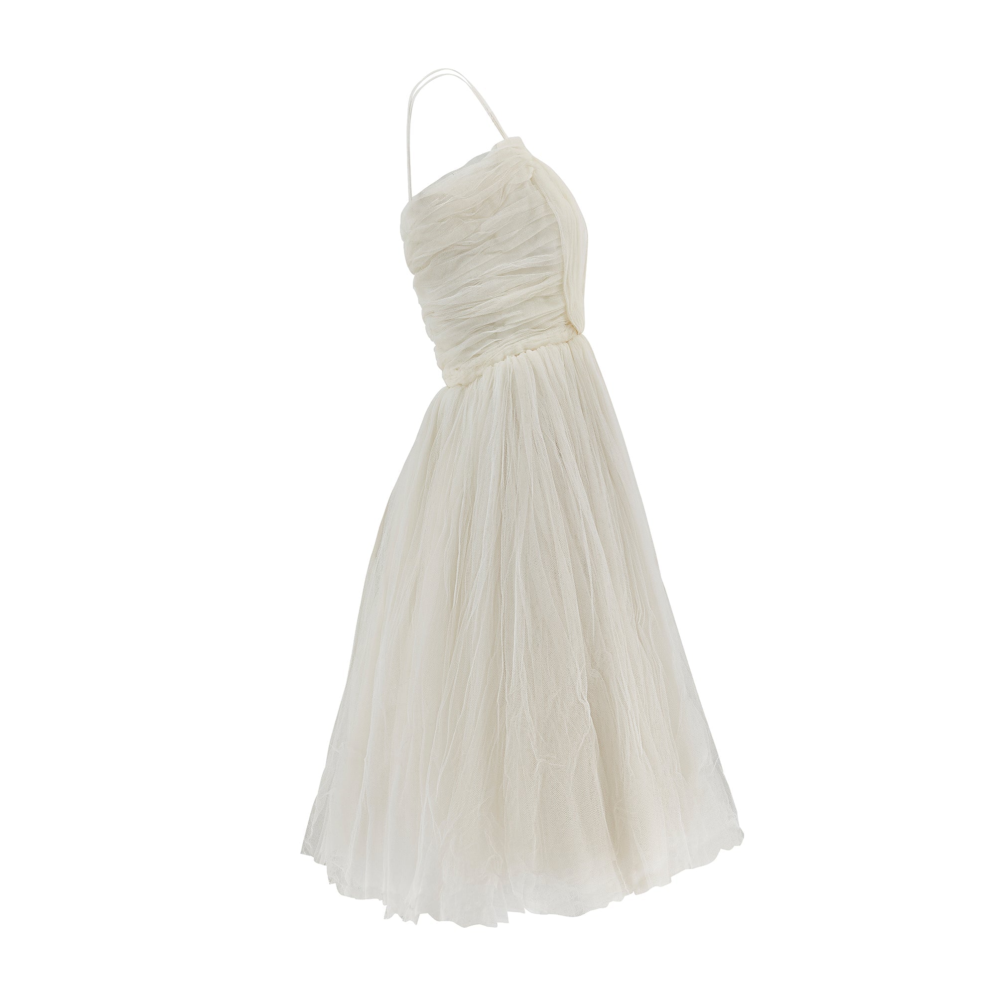 An exquisite example of 1950s bridalwear and made in Italy using alta moda (haute couture) craftsmanship. Reflecting the decade’s romantic ideal of femininity, this charming mid 1950s wedding dress is crafted from layers of stiffened white tulle, creating a voluminous, ballerina-like silhouette. The dress falls just below the knee and follows the classic 1950s line of a fitted bodice, nipped-in waist, and full skirt. The sweetheart neckline is overlaid with a sheer tulle panel for modesty and is held by delicate spaghetti straps. The bodice is beautifully ruched and pleated down the sides, giving a textured, airy finish, while the centre front is adorned with a vertical lace panel that continues through the skirt. The skirt itself is composed of a remarkable eight layers of tulle, a cotton organza underskirt and lastly, a white synthetic petticoat for comfort and structure. The dress fastens at the centre back with a tonal zip and hook-and-eye. The original label reads “Spagnol Venezia”.