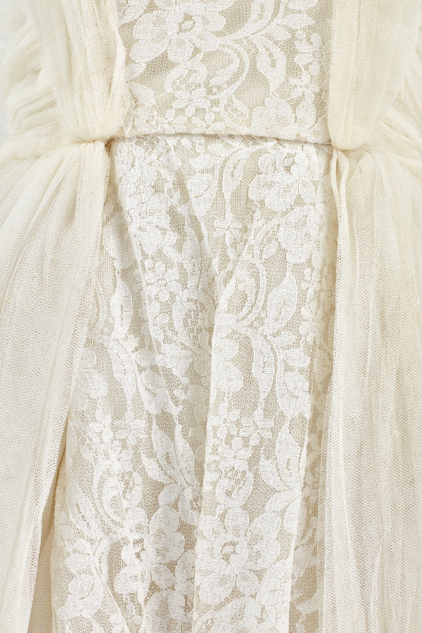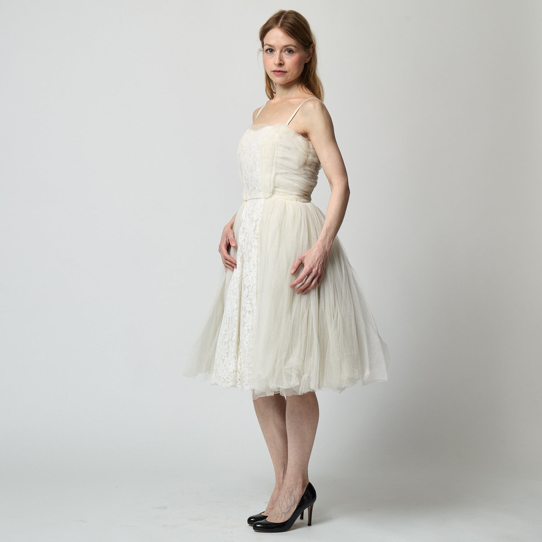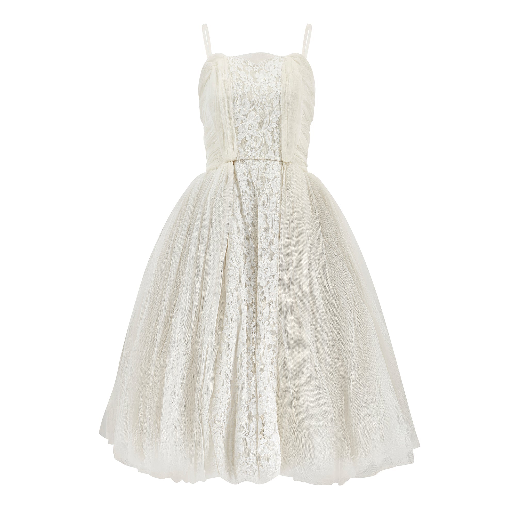An exquisite example of 1950s bridalwear and made in Italy using alta moda (haute couture) craftsmanship. Reflecting the decade’s romantic ideal of femininity, this charming mid 1950s wedding dress is crafted from layers of stiffened white tulle, creating a voluminous, ballerina-like silhouette. The dress falls just below the knee and follows the classic 1950s line of a fitted bodice, nipped-in waist, and full skirt. The sweetheart neckline is overlaid with a sheer tulle panel for modesty and is held by delicate spaghetti straps. The bodice is beautifully ruched and pleated down the sides, giving a textured, airy finish, while the centre front is adorned with a vertical lace panel that continues through the skirt. The skirt itself is composed of a remarkable eight layers of tulle, a cotton organza underskirt and lastly, a white synthetic petticoat for comfort and structure. The dress fastens at the centre back with a tonal zip and hook-and-eye. The original label reads “Spagnol Venezia”.