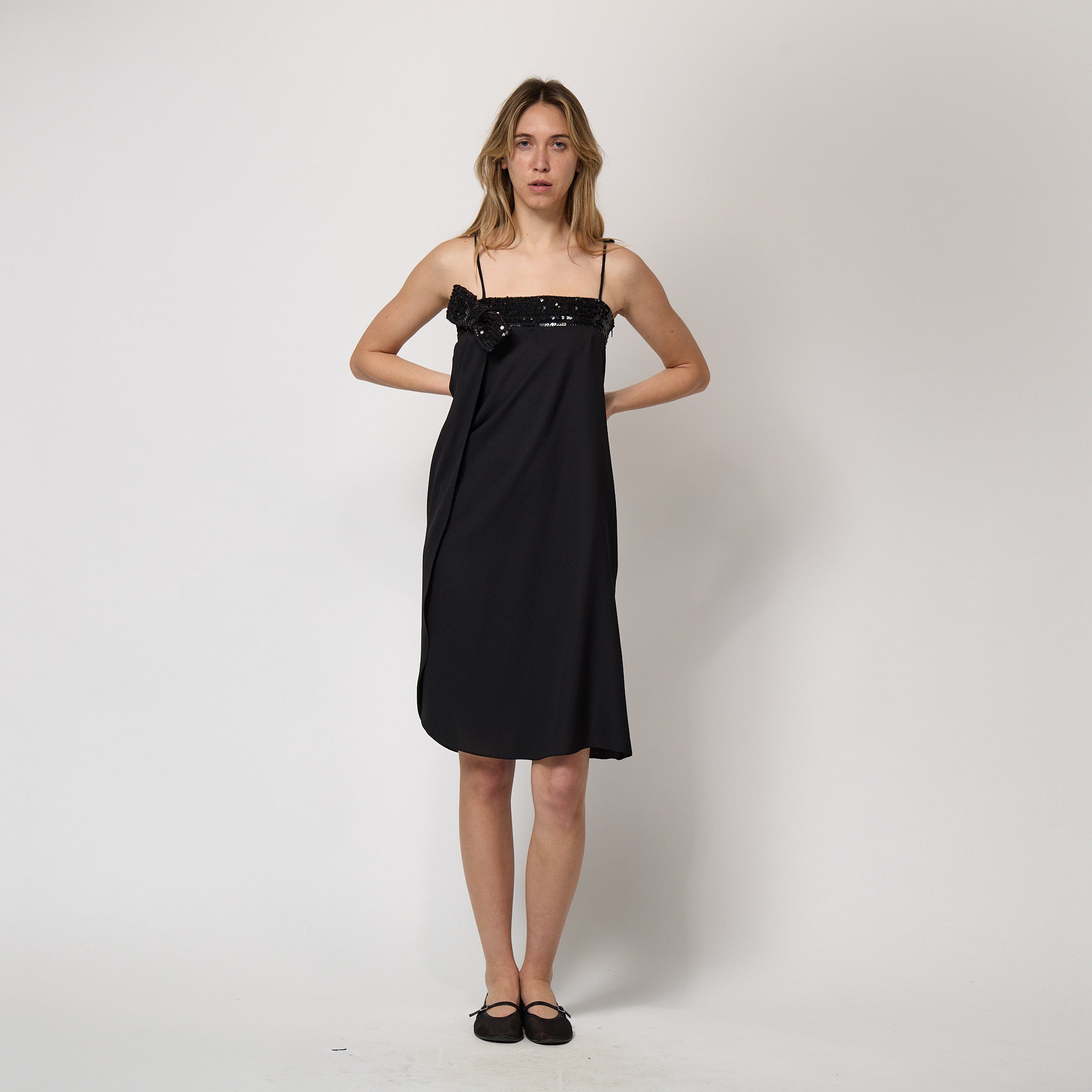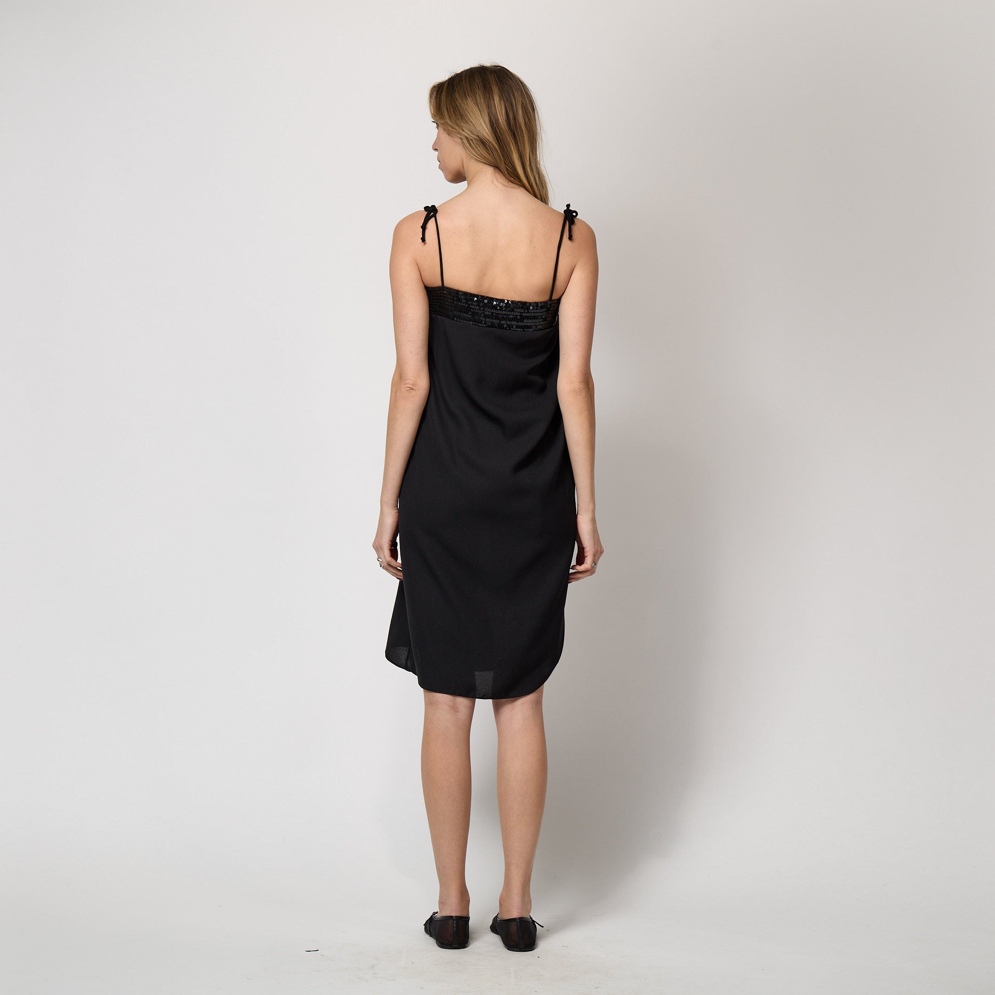 This glamorous cocktail dress was designed by American dressmaker Beginnings during the 1970s. Tailored from black crepe, the fabric falls in a column style which curves and wraps around the body. It has delicate black spaghetti straps which are adjustable and tie at the shoulder. Around the top of the dress is a panel of embellished fabric, detailed with rows of glistening black sequins. At the front of the dress, where the draped fabric meets the top of the dress, there is a large sequin-covered bow. The dress fastens under the left arm with a hidden zip and hook-and-eye clasp. Unlined, except where the sequins sit to ensure a comfortable wear.