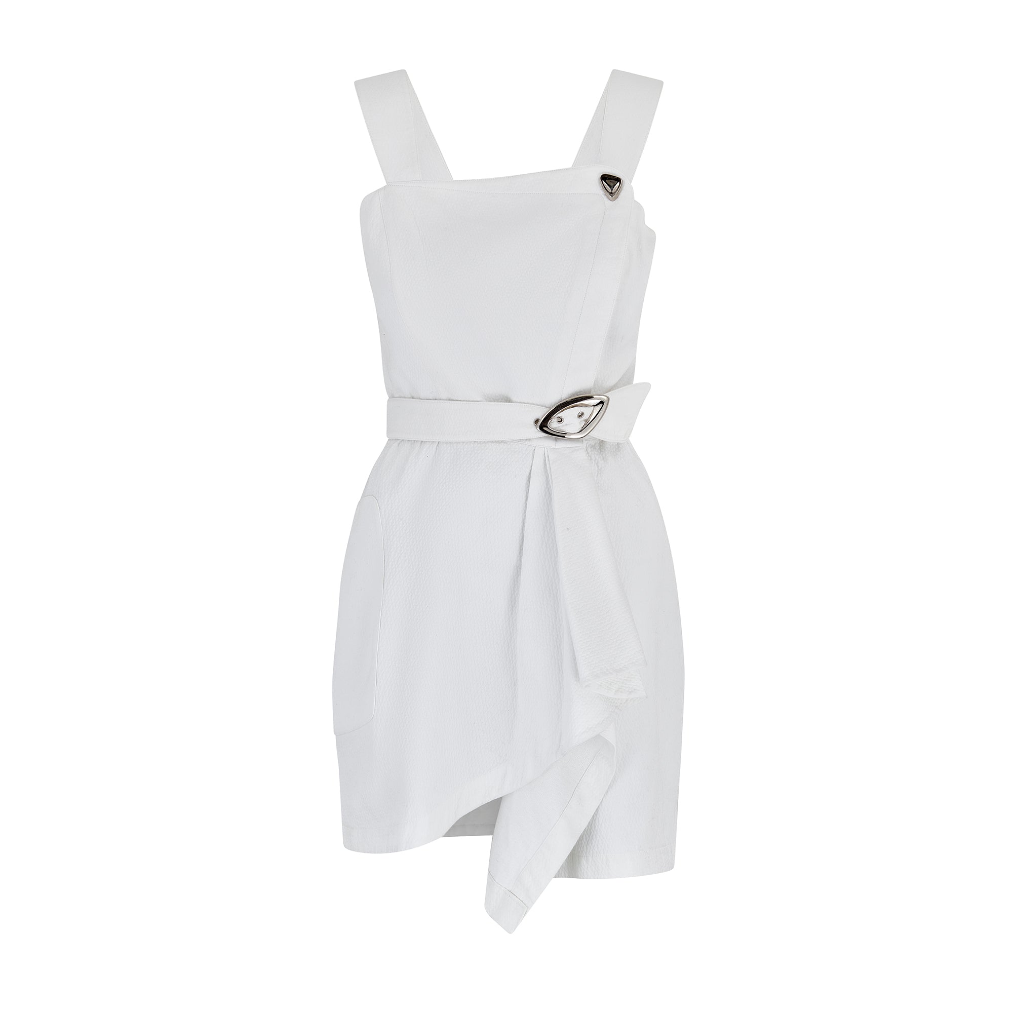 The dress is tailored from white pique cotton with the pebble-grain texture usually found on leather. It has two wide straps in the same fabric. It has a nipped-in waist and cocooning sarong type skirt which is finished with two oversized patch pockets. The front of the top of the dress has an off-centre fastening that closes with seven hidden silver-tone metal snap closures. A futuristic silver-tone brooch sits above the top snap closure. At the waist, there is a wide belt which closes with a chunky, sculptural silver-tone buckle. The top of the dress is lined in white satin. The skirt is unlined.