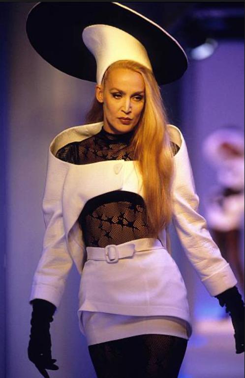 This 1990s white mini-dress was made in France by Thierry Mugler and after much research we are attributing to the S/S 1996 collection. Mugler would design different 'hardware' each season, especially buttons and belt buckles, and these irregular 3-sided polygon designs were featured on several of the runway looks. Commercial collections often incorporated runway looks but made them more wearable; we have selected a few of the designs which closely much this dress.