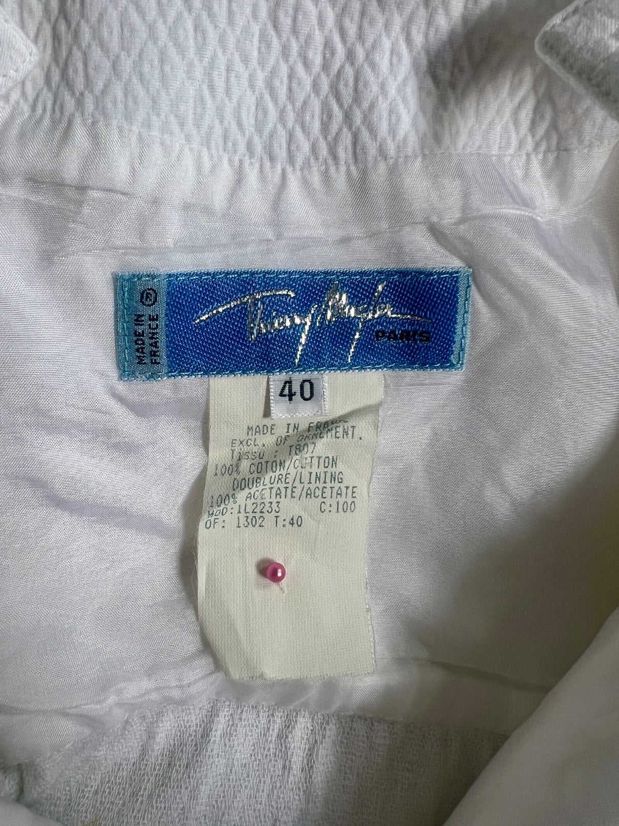 Made in France, this piece is in truly excellent vintage condition with no flaws of any note. We have cleaned the 100% cotton fabric to perfect white. Labelled a vintage French size 40, Mugler runs very small by today's standards and the dress has no stretch. We believe it would best fit a size UK 8, US 4 on account of the small waist. Our model's sizes are: Bust: 33" (84cm), Waist 26" (66cm), Hips: 34" (86cm) and 5' 7" (170cm) and she's a size UK 6-8, US 2-4. This dress was slightly roomy on her.
