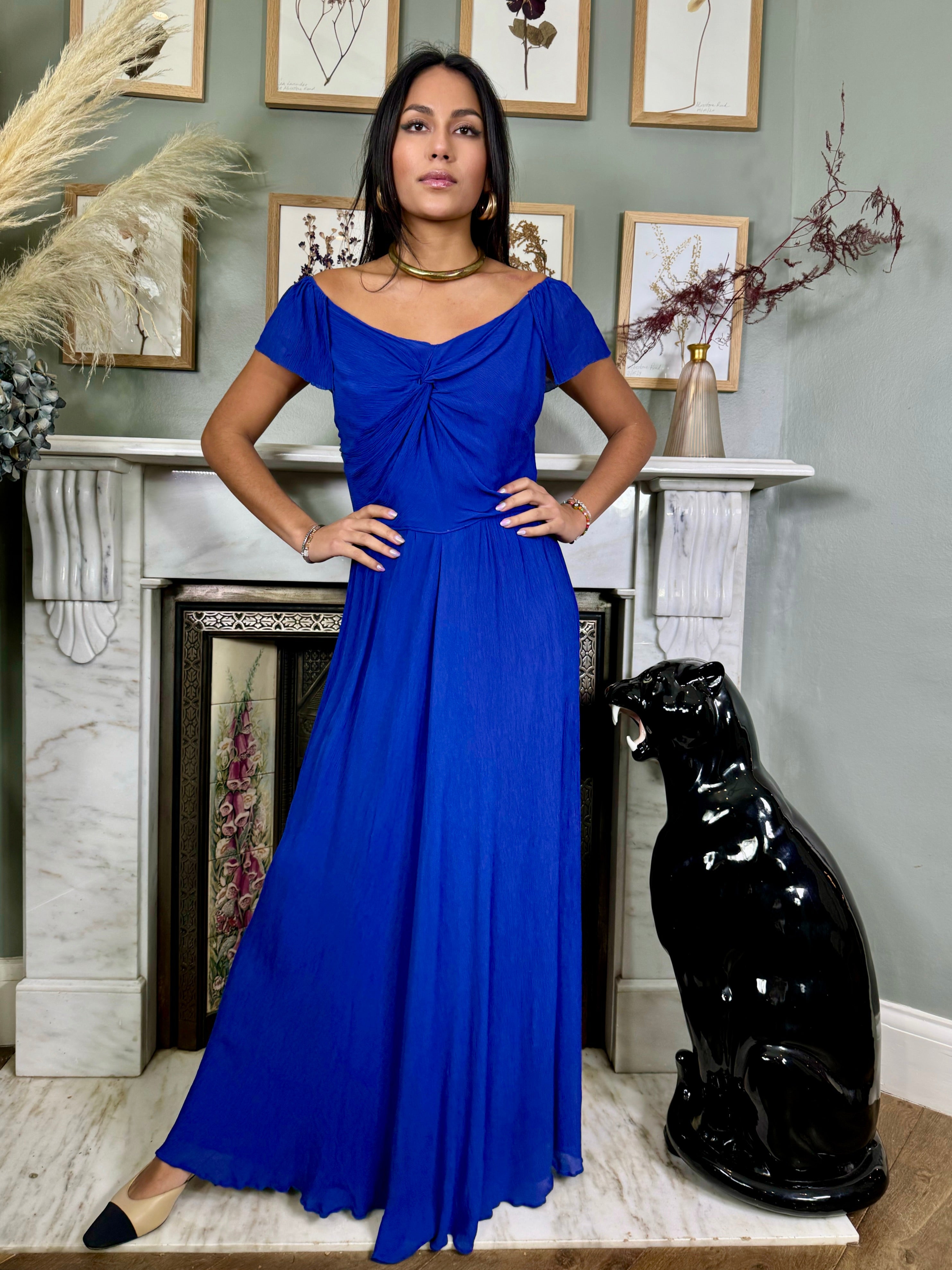 Absolutely gorgeous 40s cobalt blue chiffon dress. Has a soft round neckline with a shoulder frill that covers the top of the arm, a chest knot design and a long floaty skirt. A zip has been added to the back for a better fit. Fully lined. Looks fab belted too.