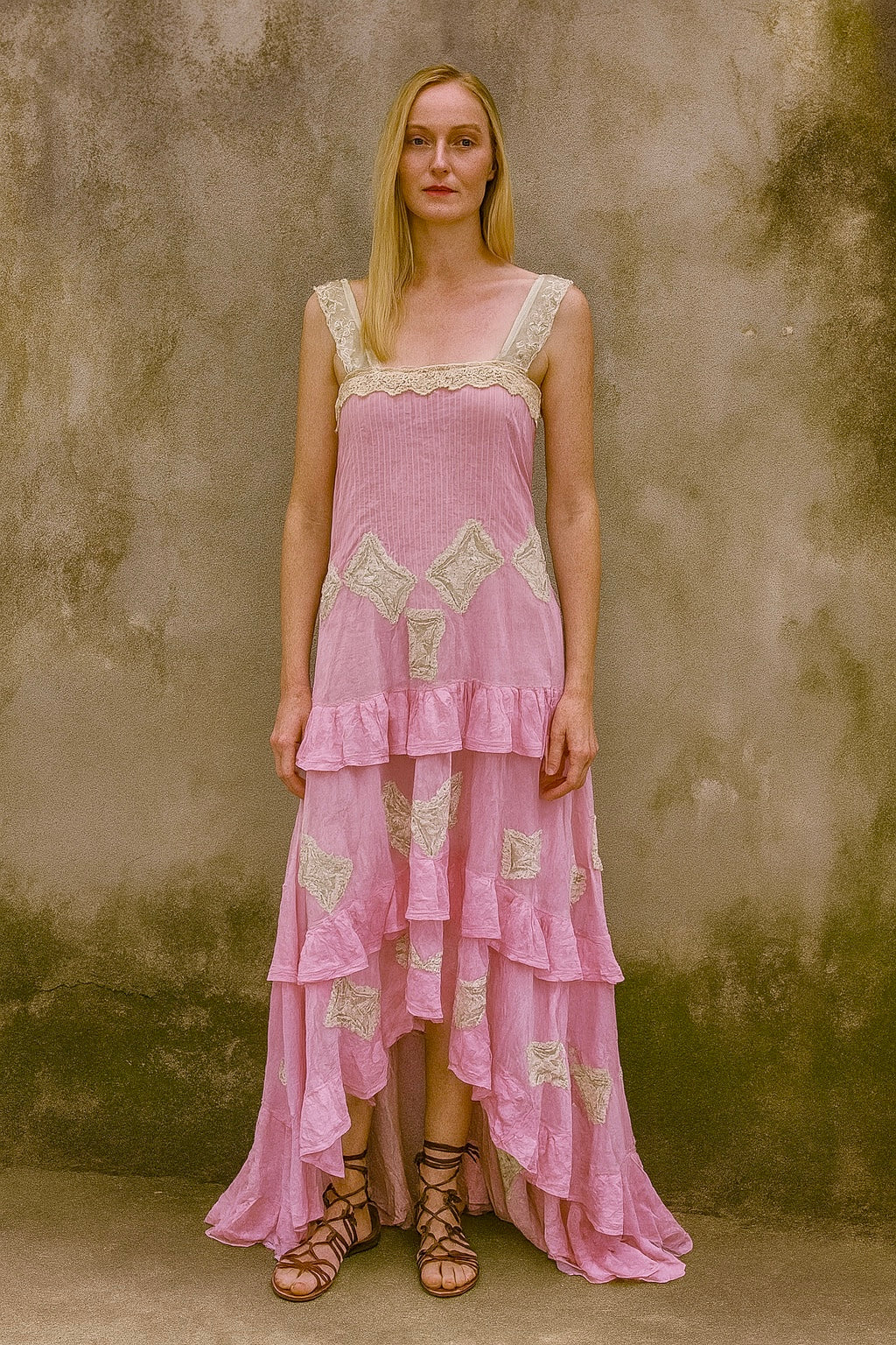 Expertly reworked from a rare Victorian cotton pink skirt dress, the Laurenna dress is a collectible piece that exudes elegance. Featuring three layers of pink cotton and lace cream inserts, the dress fastens at the back with three hooks. The delicate lace straps add a touch of femininity to this unique and asymmetrical dress.