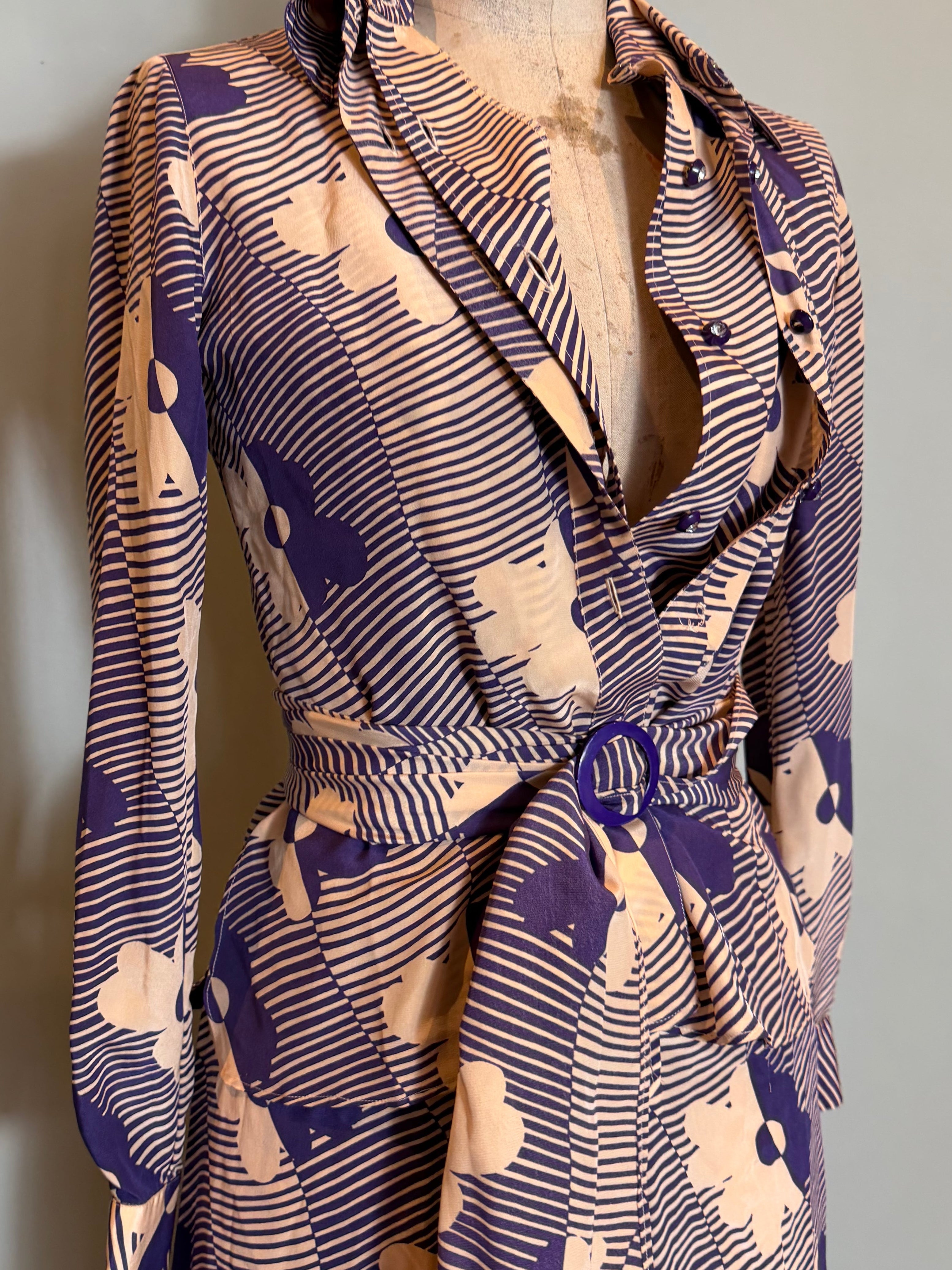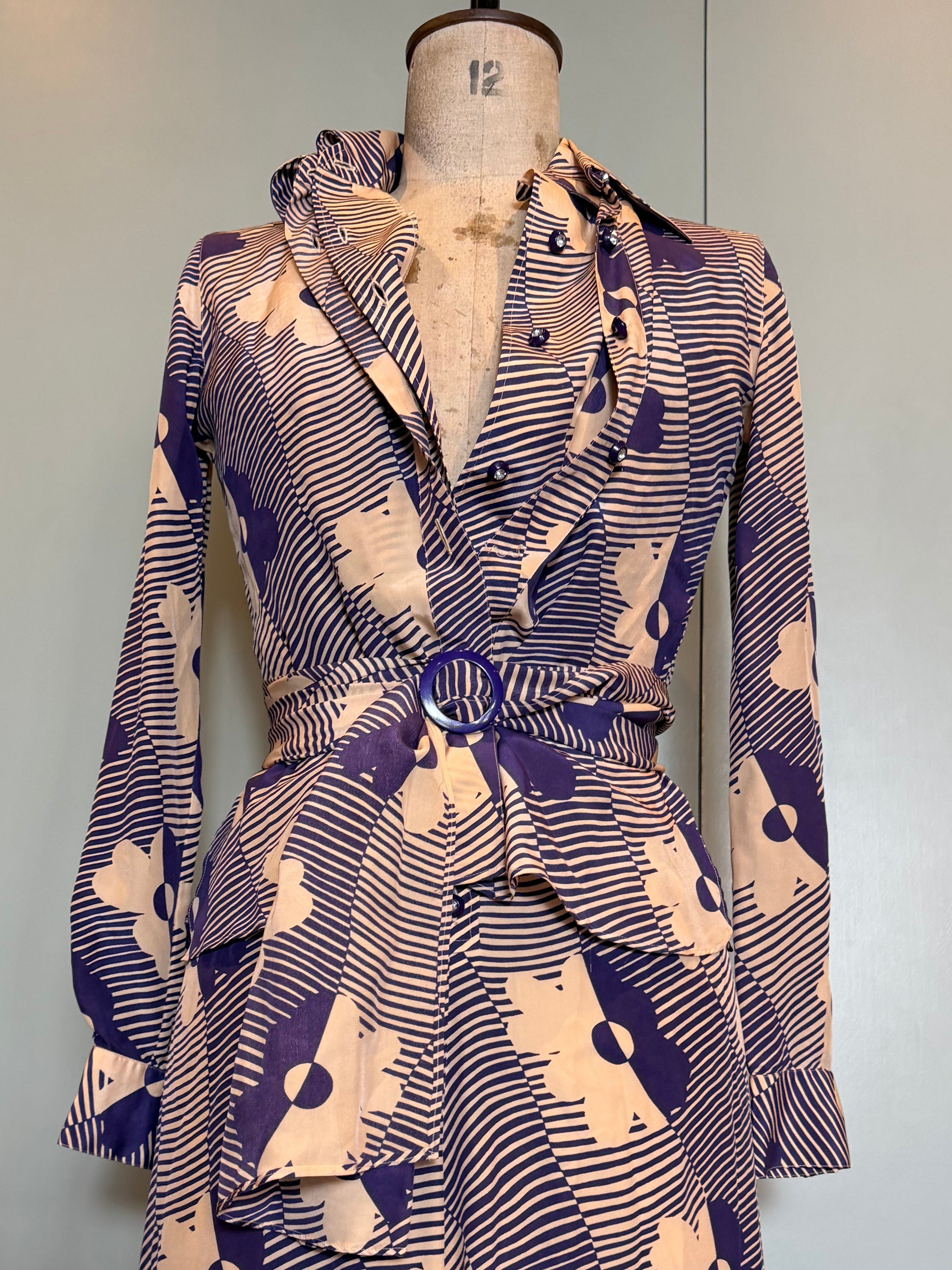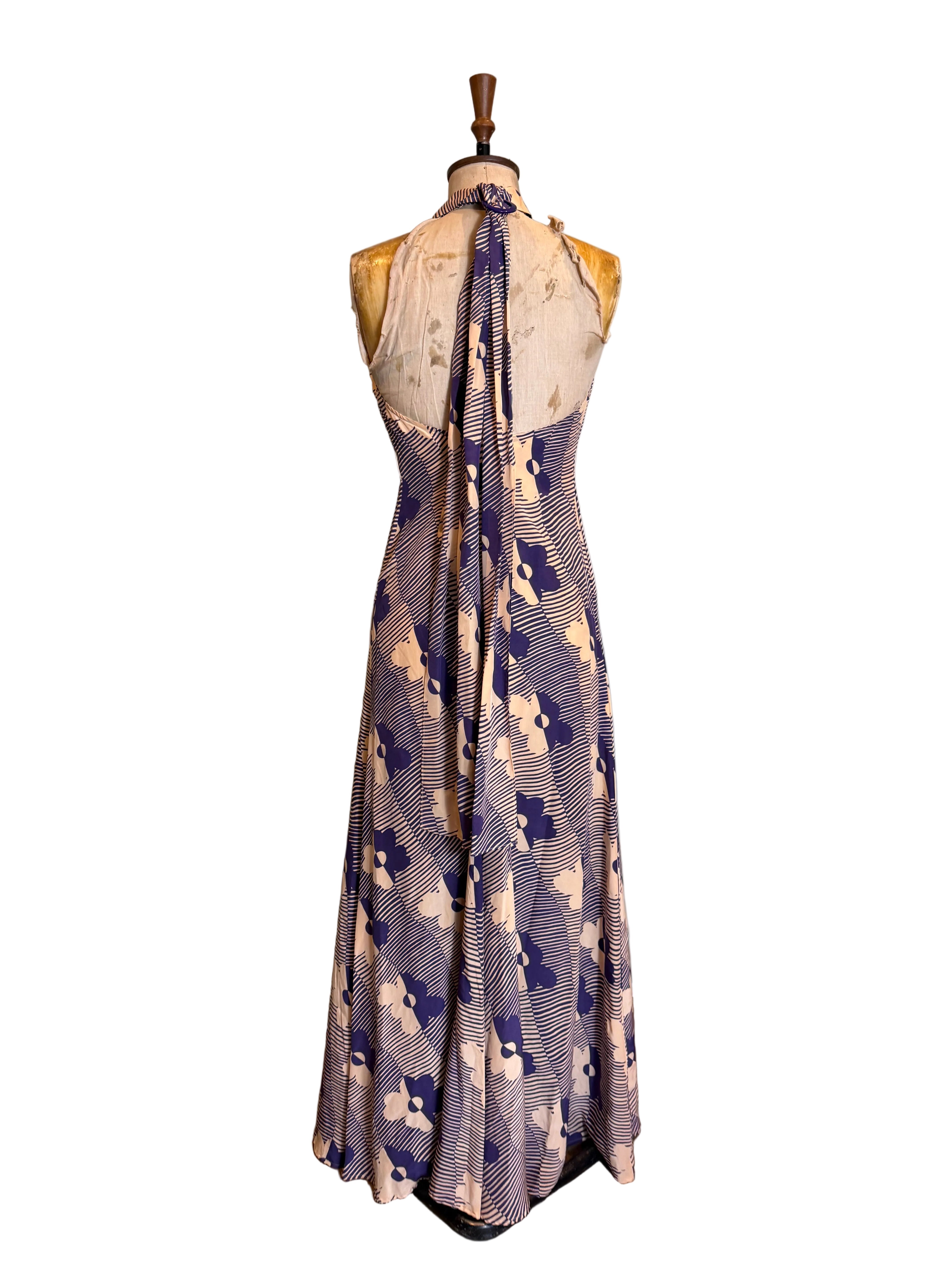 Embrace the elegance of a bygone era with this fab 70s does art deco silk floral print ensemble, a three-piece masterpiece that includes a halterneck dress with a sophisticated lapel, an alluring A-line silhouette, and a matching bolero jacket. Delicate buttons adorned with rhinestone motifs and a charming Bakelite-buckled belt elevate this luxurious creation, inviting the wearer into a realm of timeless sophistication.