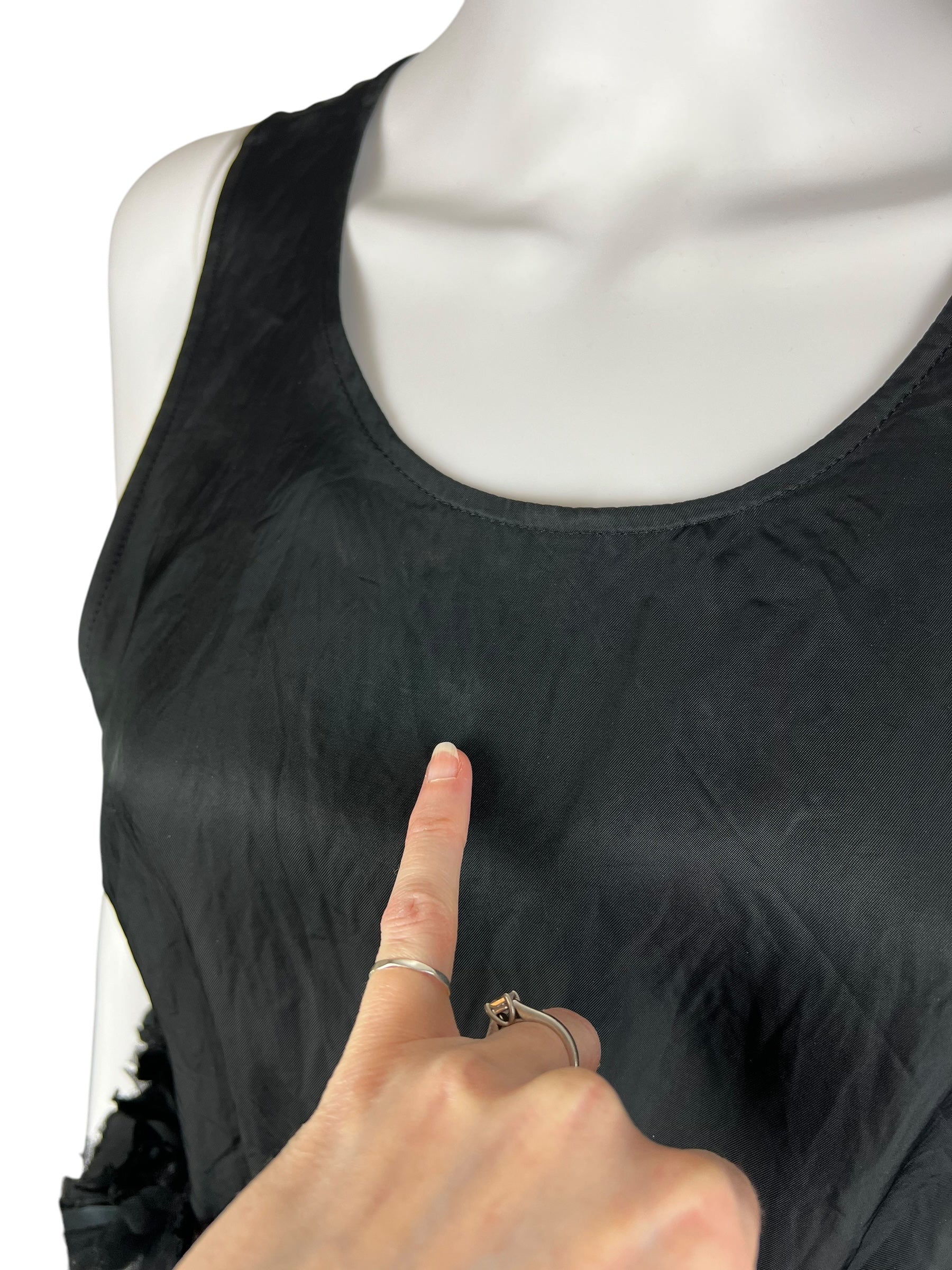 🫶 Condition is good. One small tear in tulle near bottom hem at the back but you’d never notice due to the folds of fabric. Armpits are clean and stain-free. Some slight colour variation to the upper body part but not very noticeable. The edges of the ruffles around the waistband have some bobbling. 100% cupra body, 100% nylon tulle. Dry clean only.