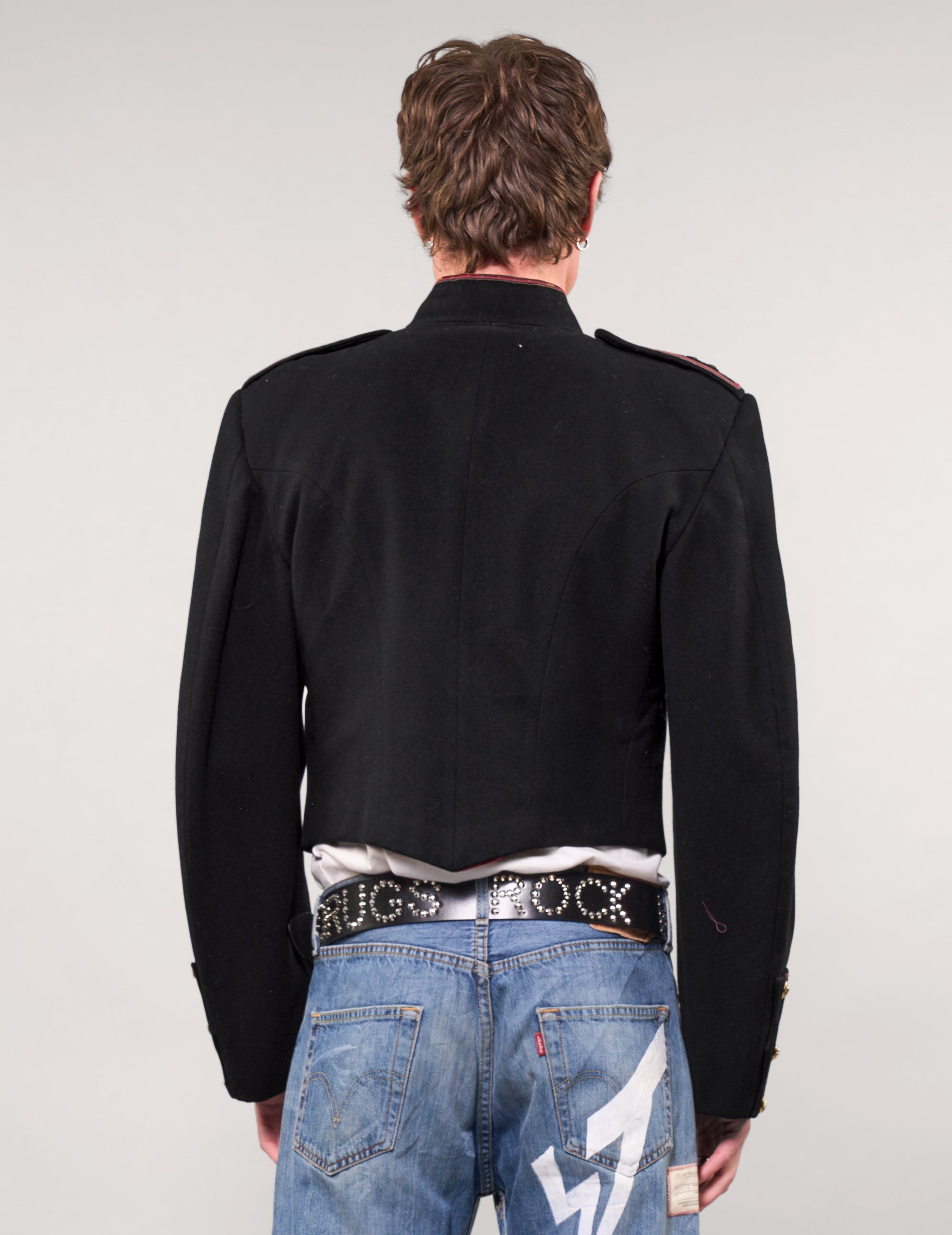 Gold metal button fastening front and loop on collar. Ideal for rockstars who dress to impress.
