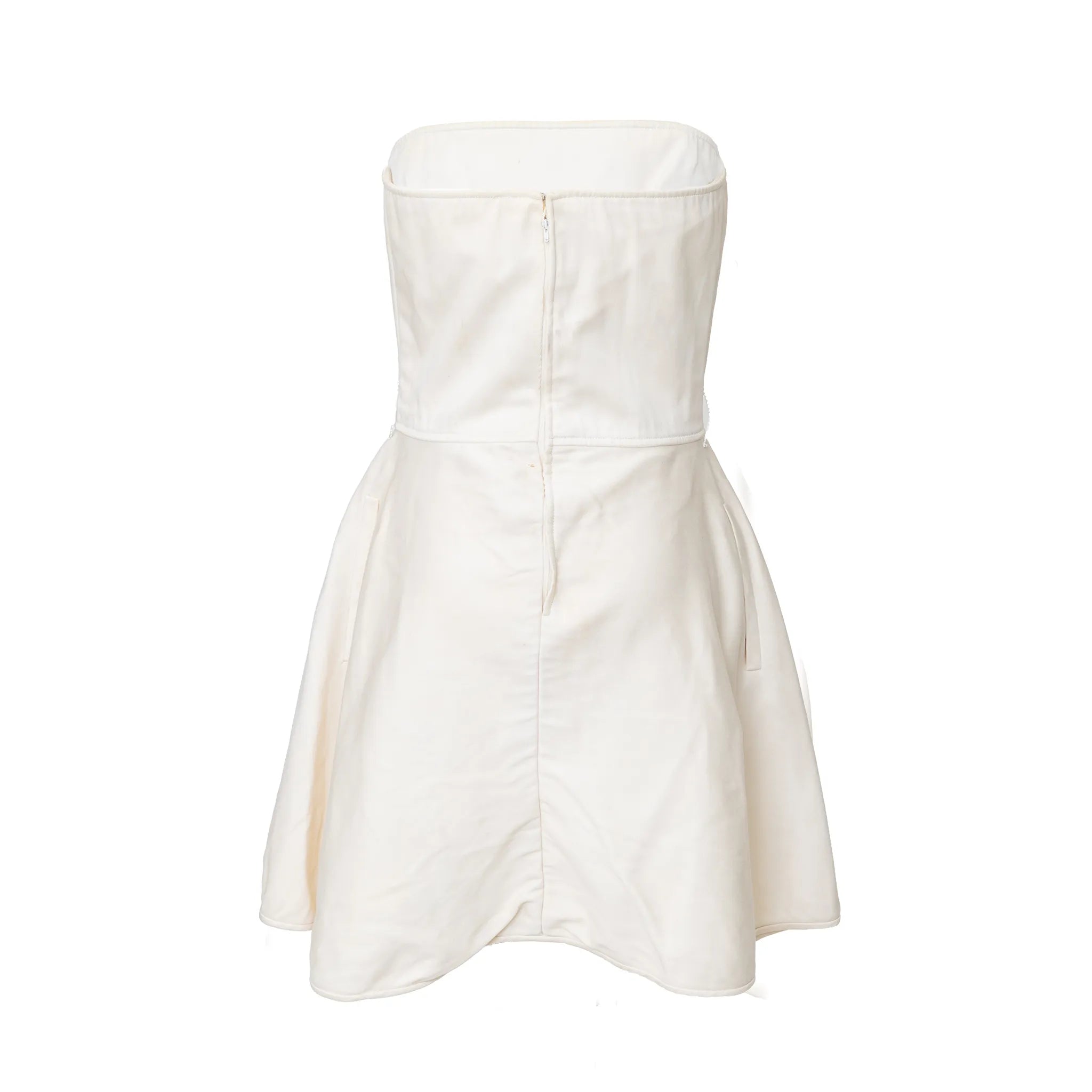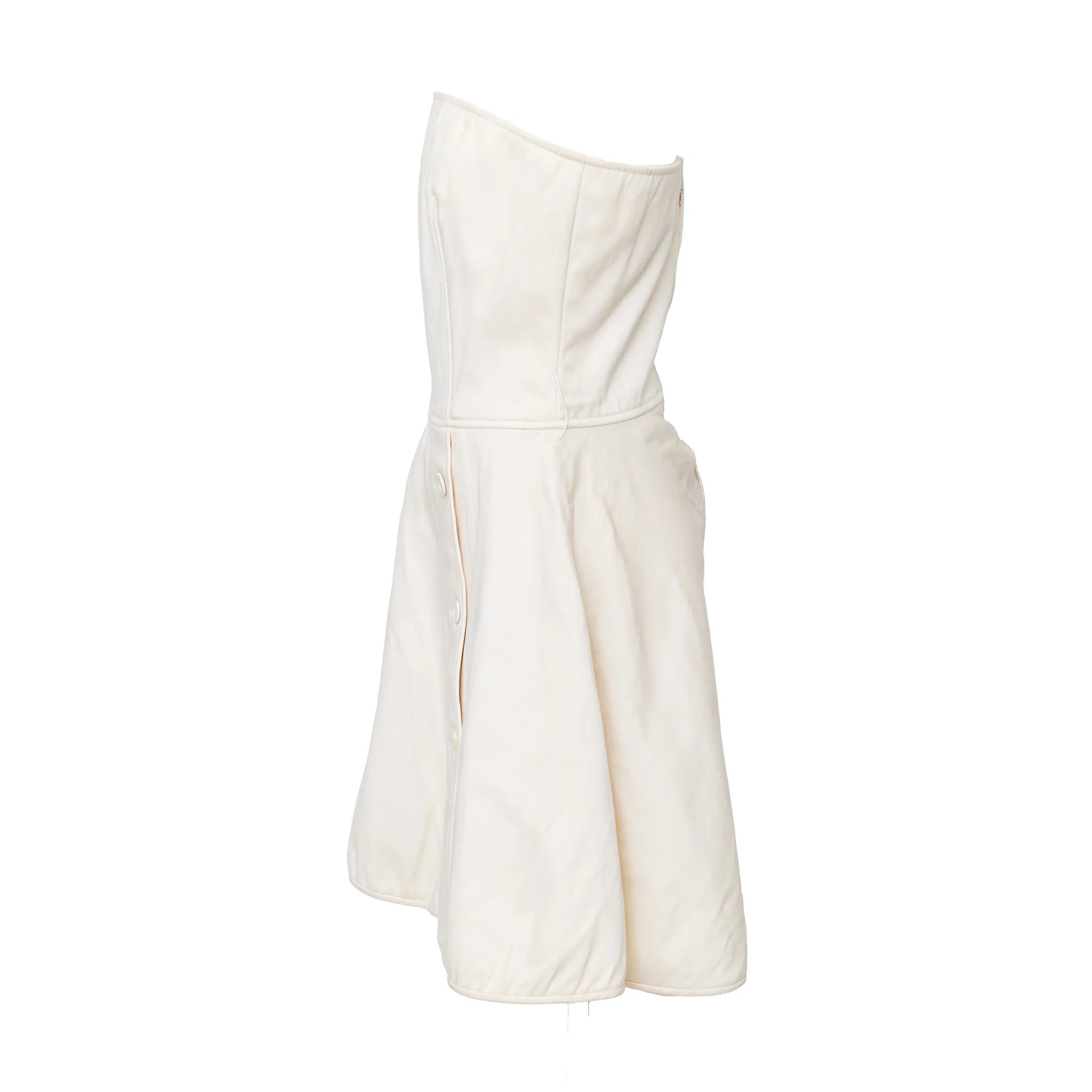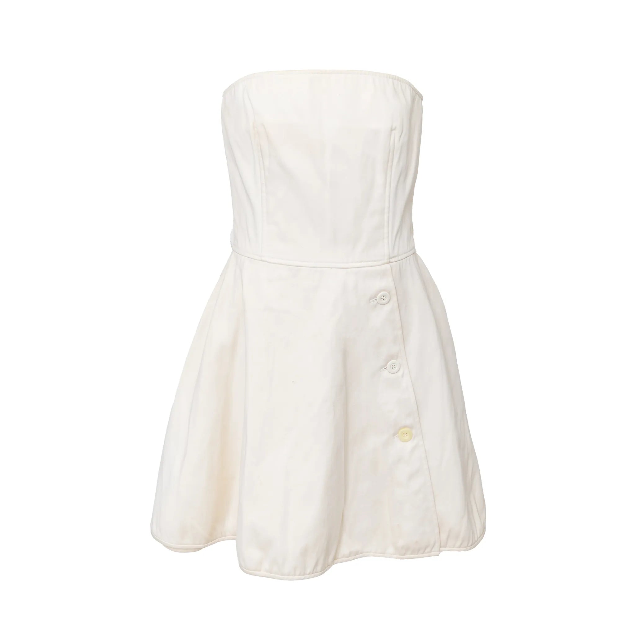 Valentino Boutique mini dress with internal boning corset, strapless tube bodice, A-line silhouette with button details, side pockets & hidden back zip.