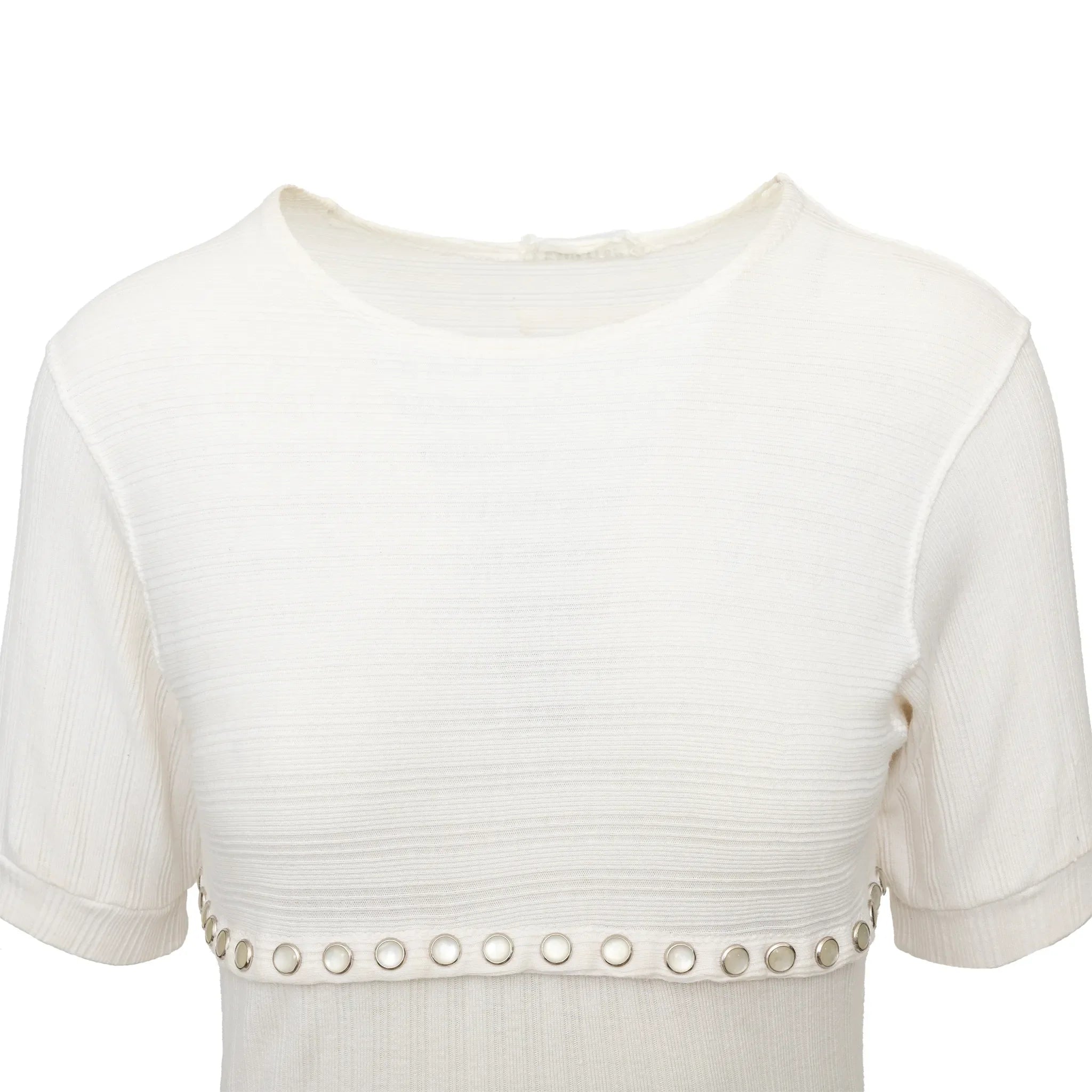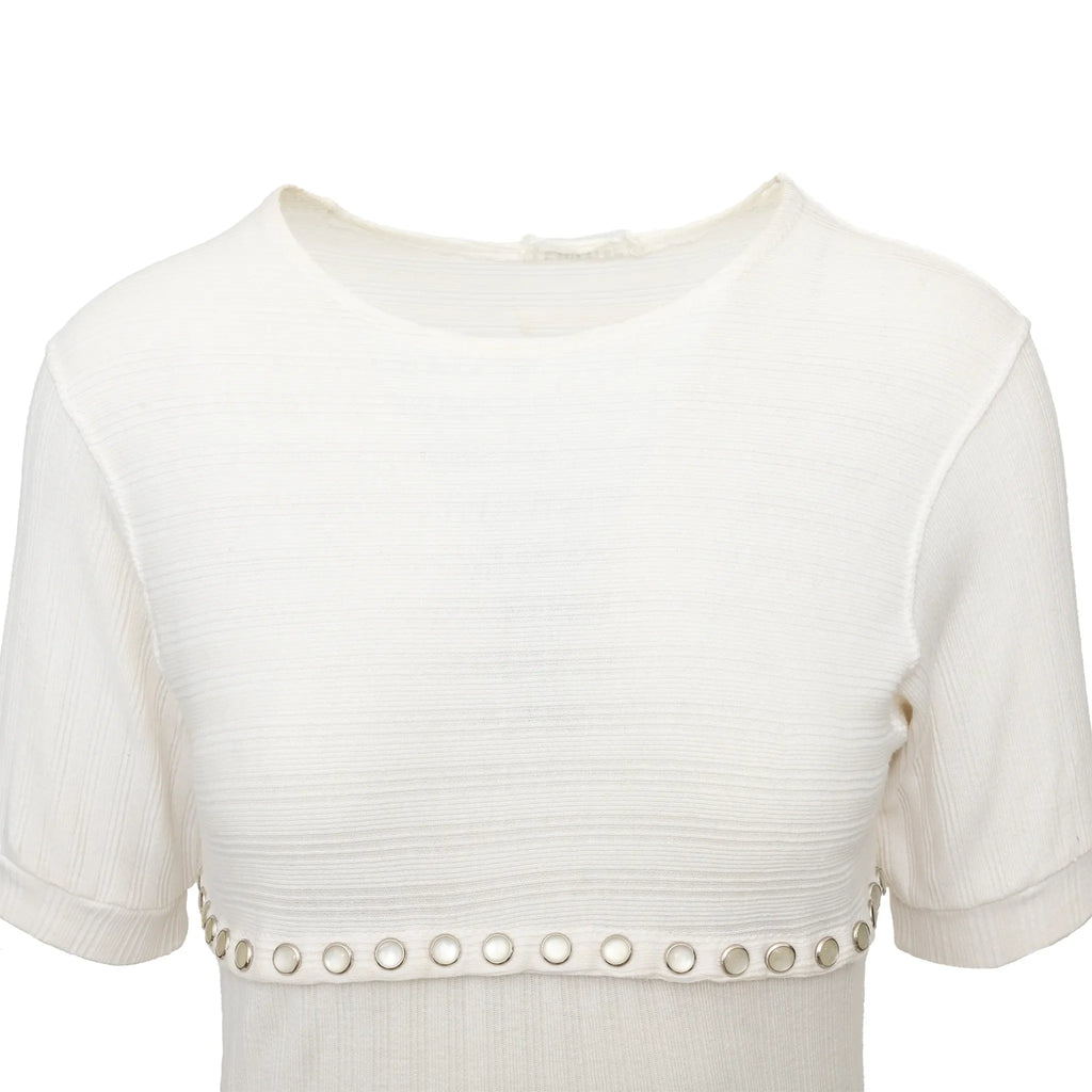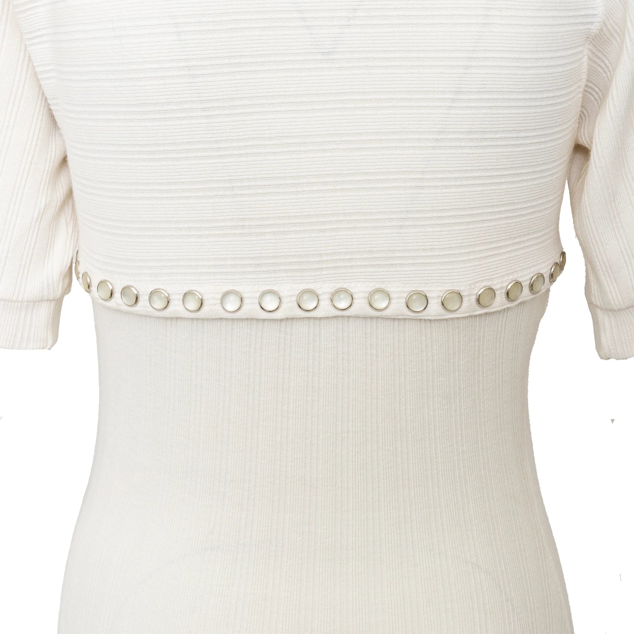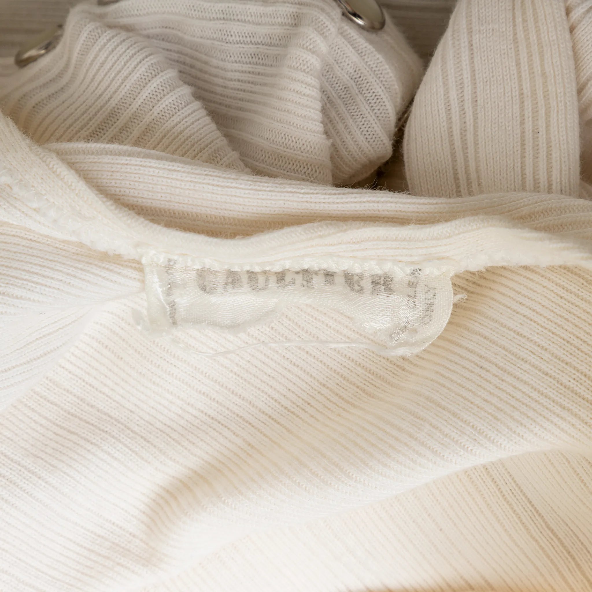 Inventive and versatile, this Gaultier cotton rib knit dress features silver snaps at the empire waist—wear it as a full dress or as a crop top and tubular dress or skirt.