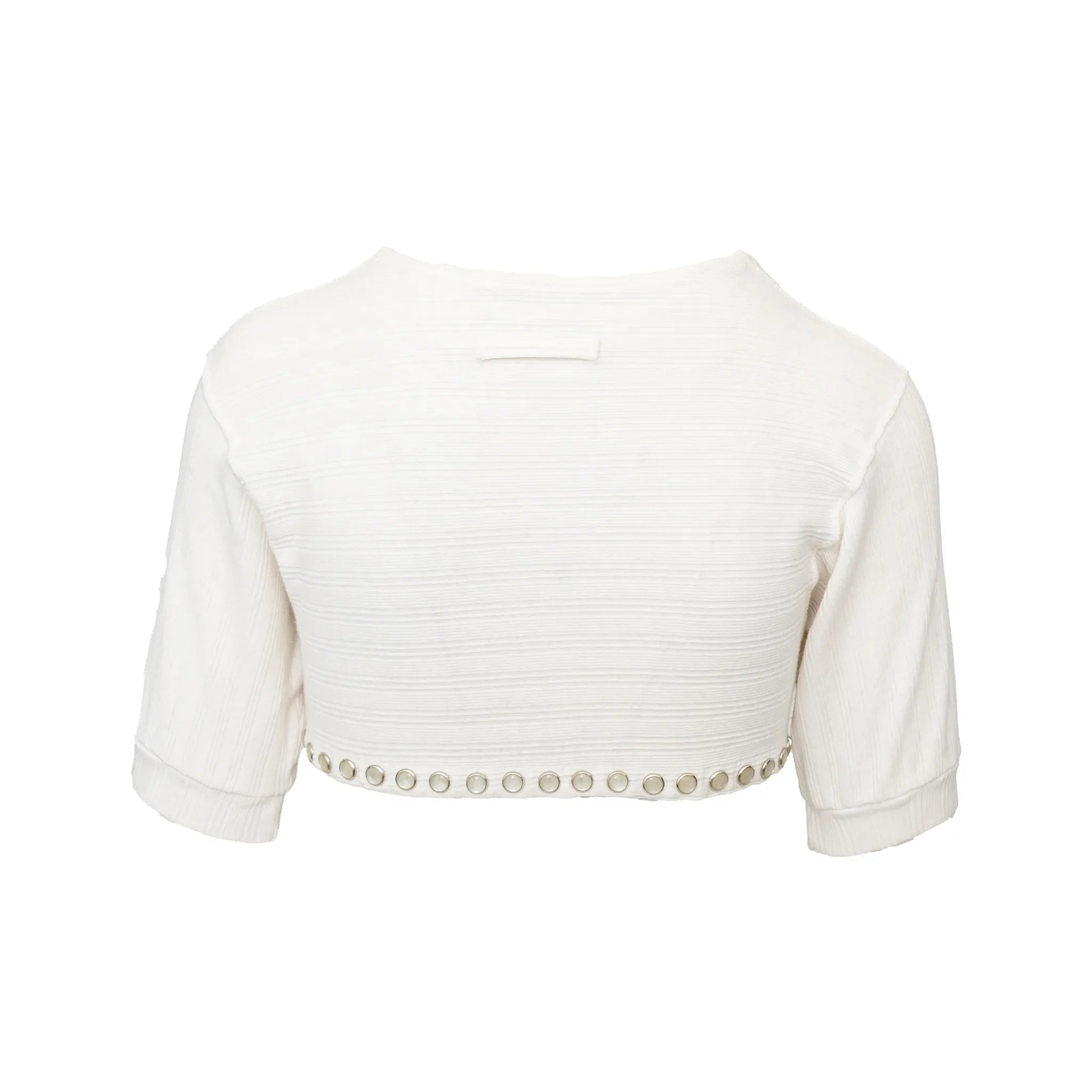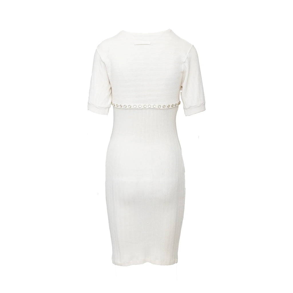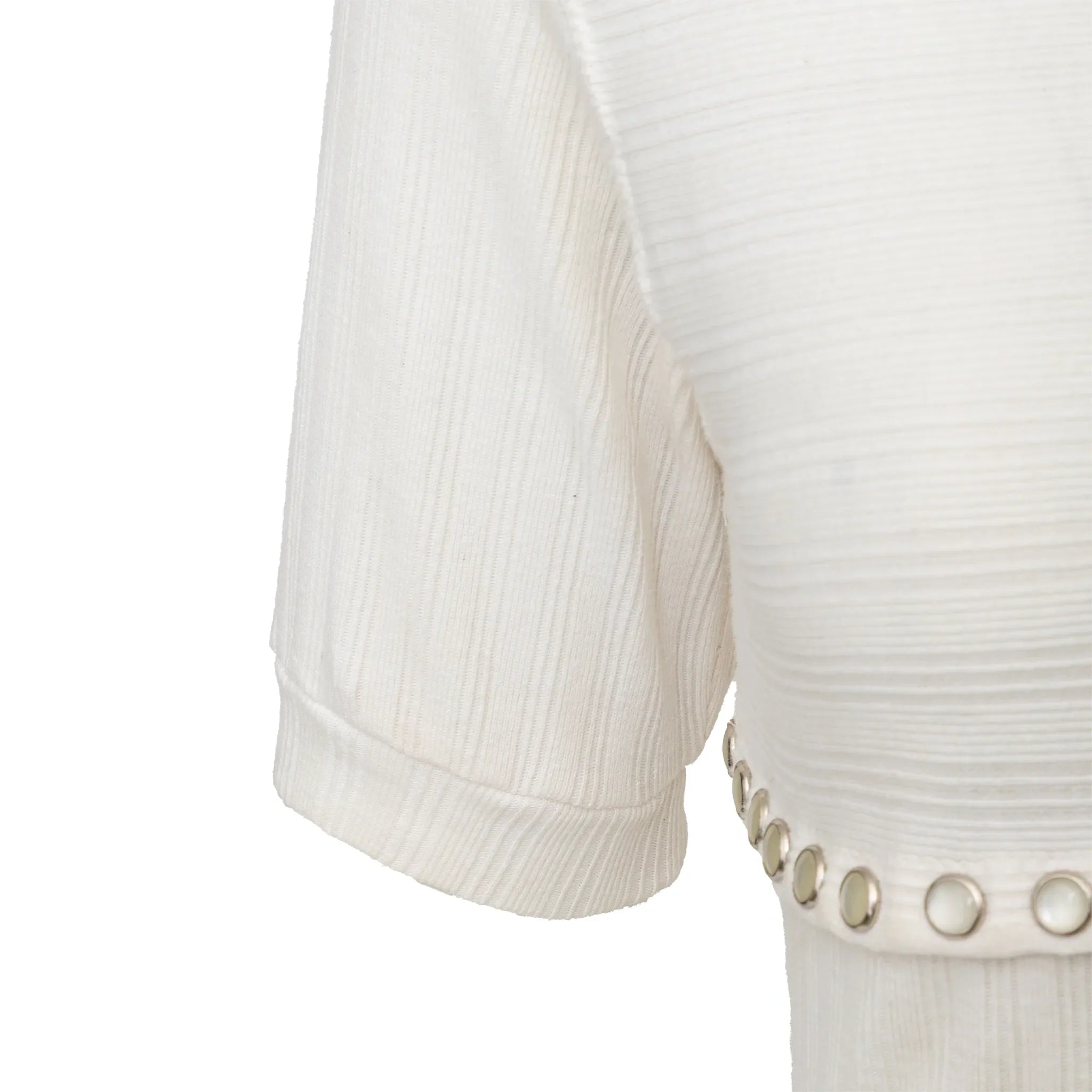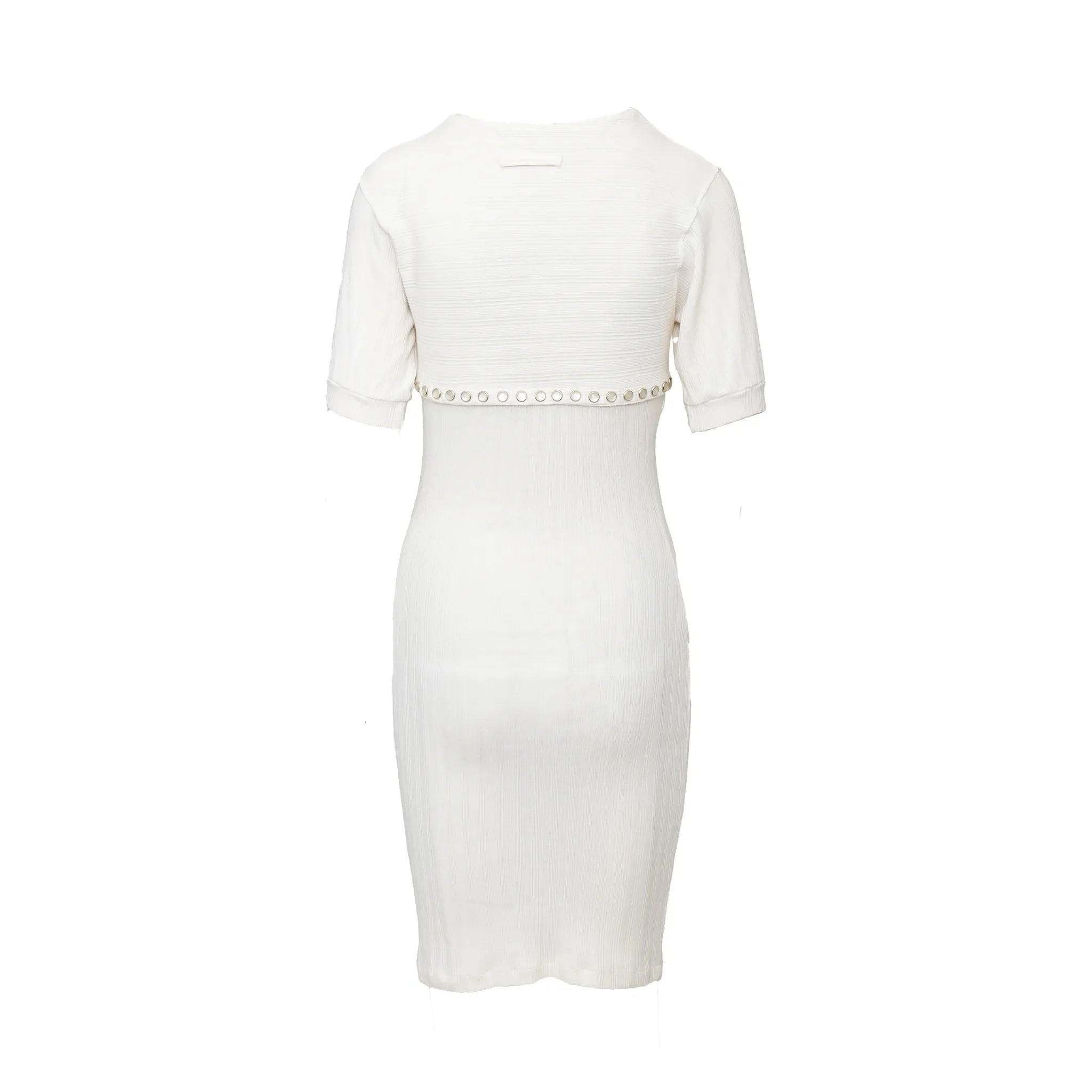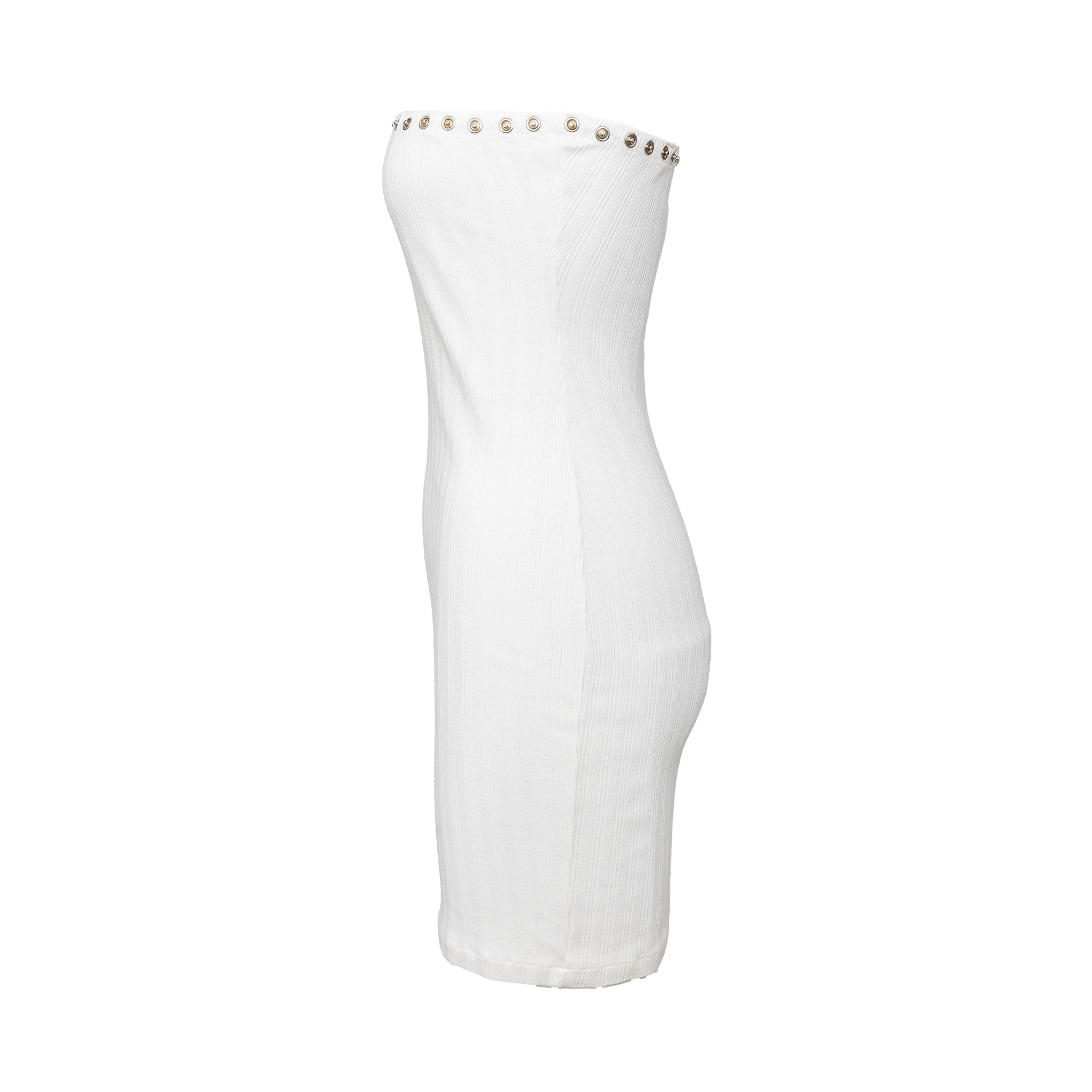 Inventive and versatile, this Gaultier cotton rib knit dress features silver snaps at the empire waist—wear it as a full dress or as a crop top and tubular dress or skirt.