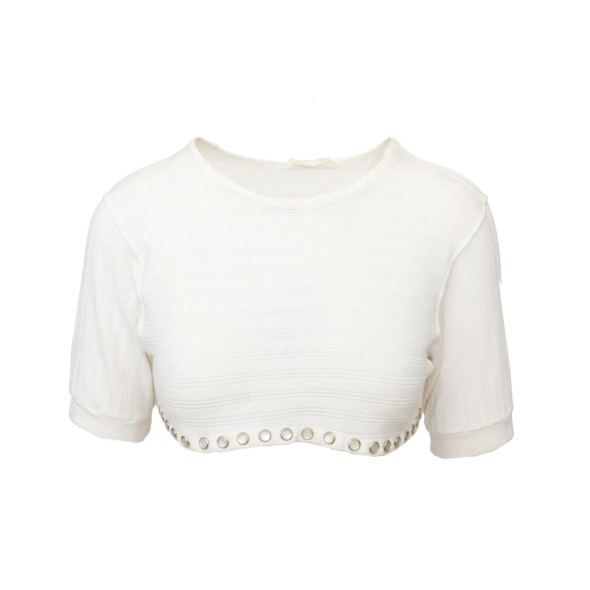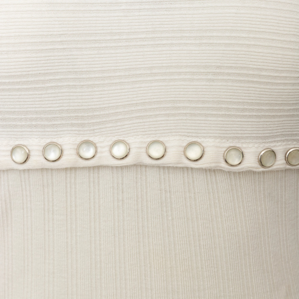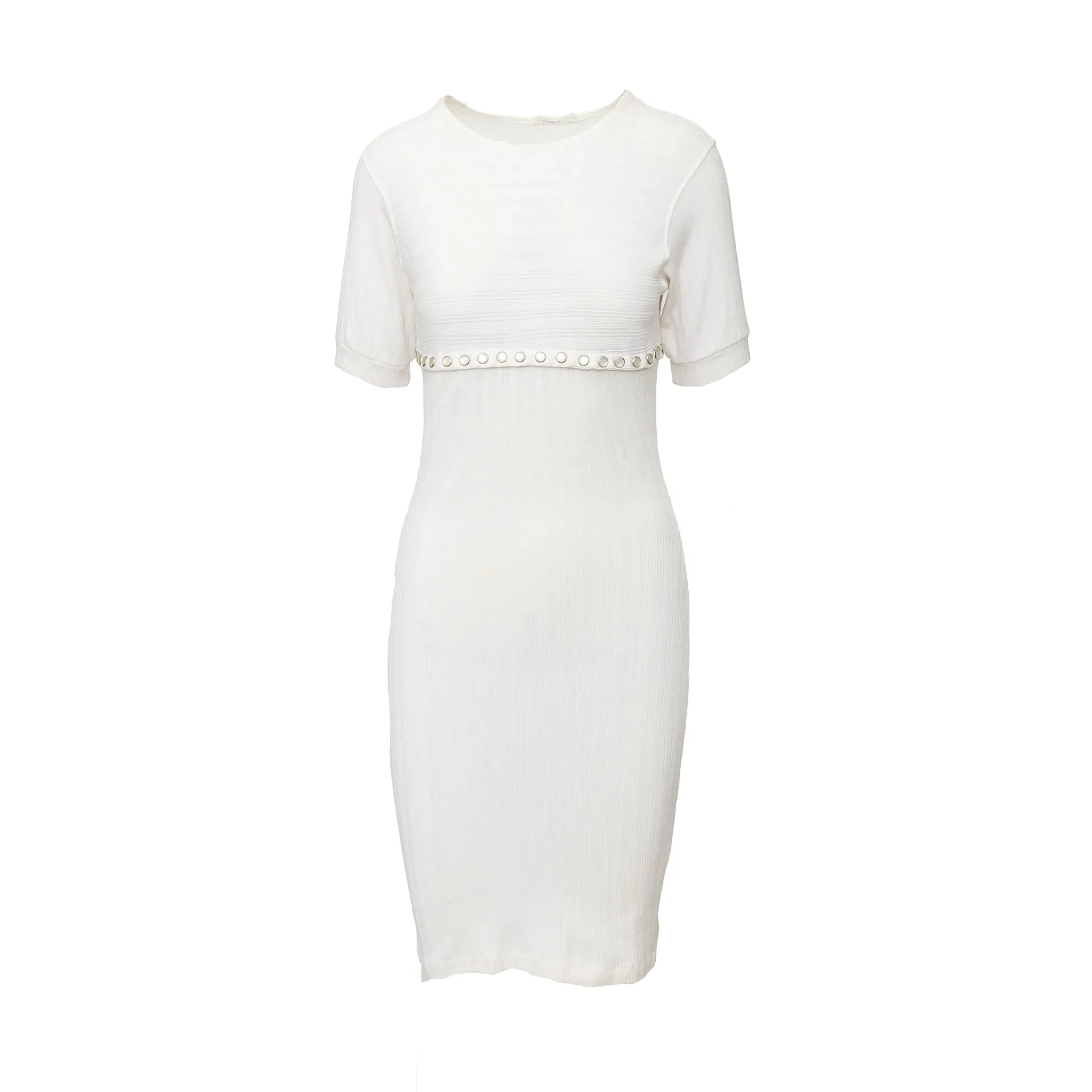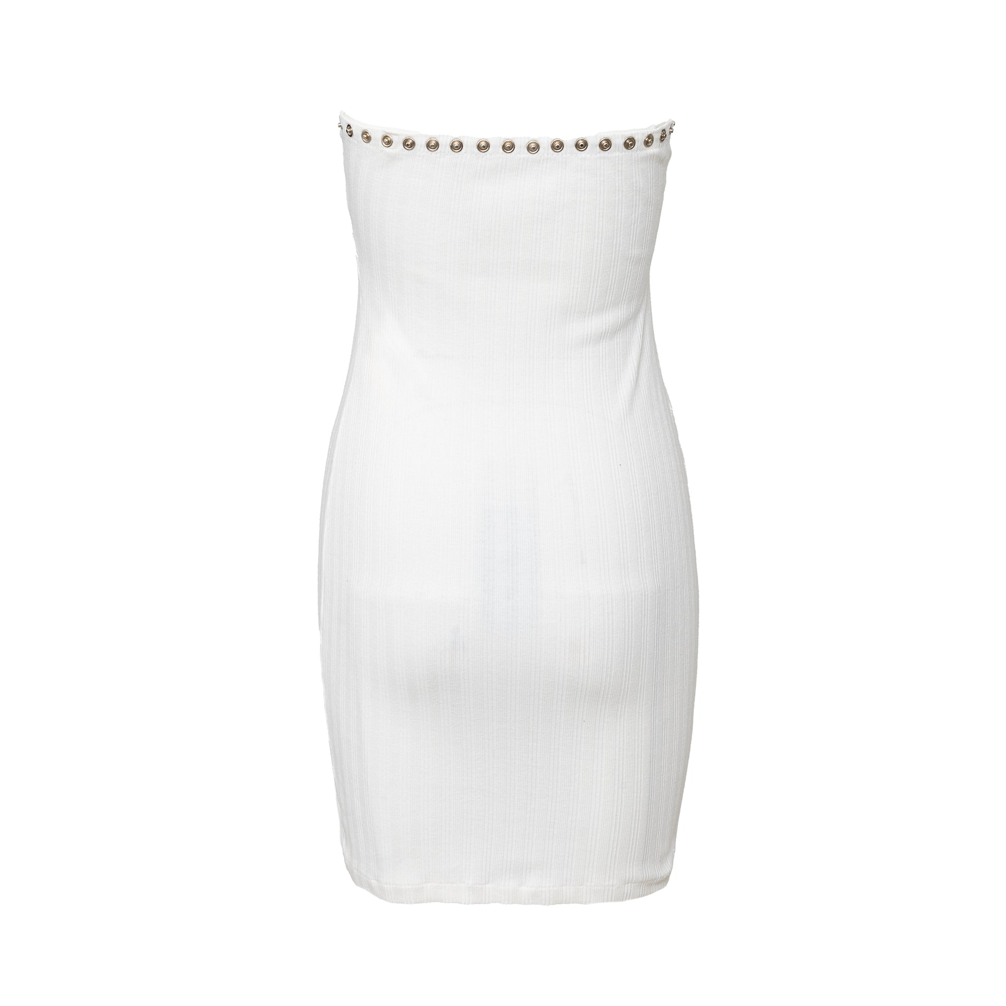 Inventive and versatile, this Gaultier cotton rib knit dress features silver snaps at the empire waist—wear it as a full dress or as a crop top and tubular dress or skirt.