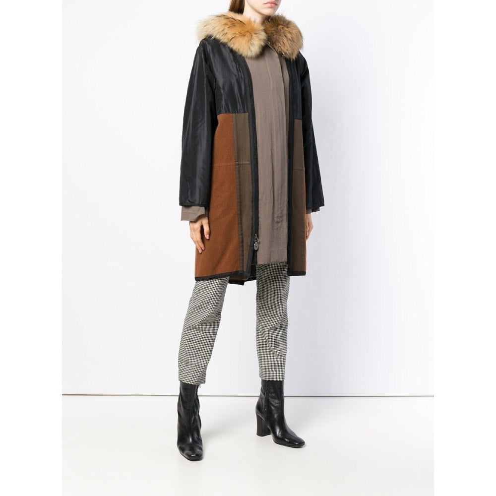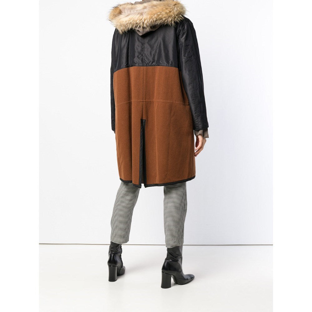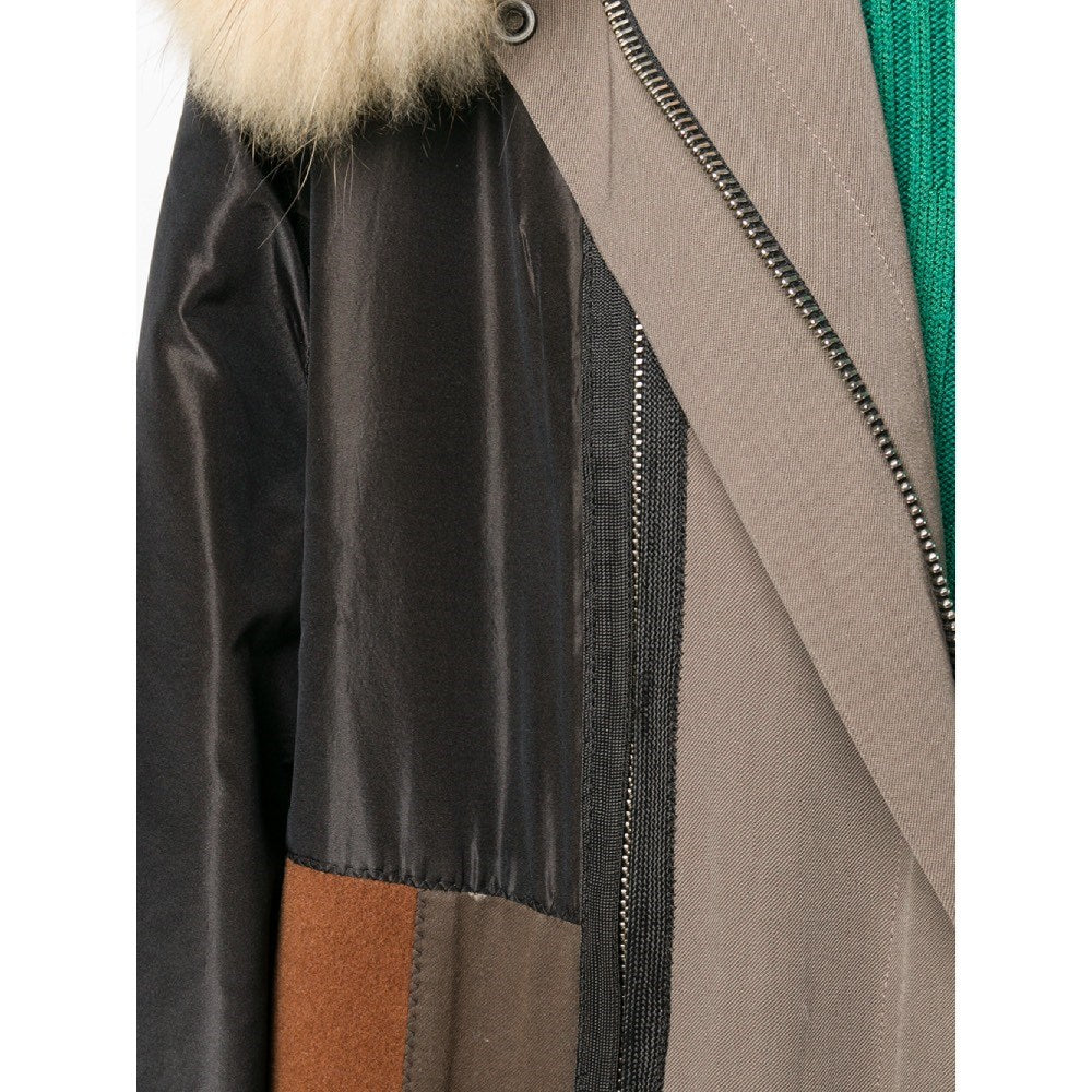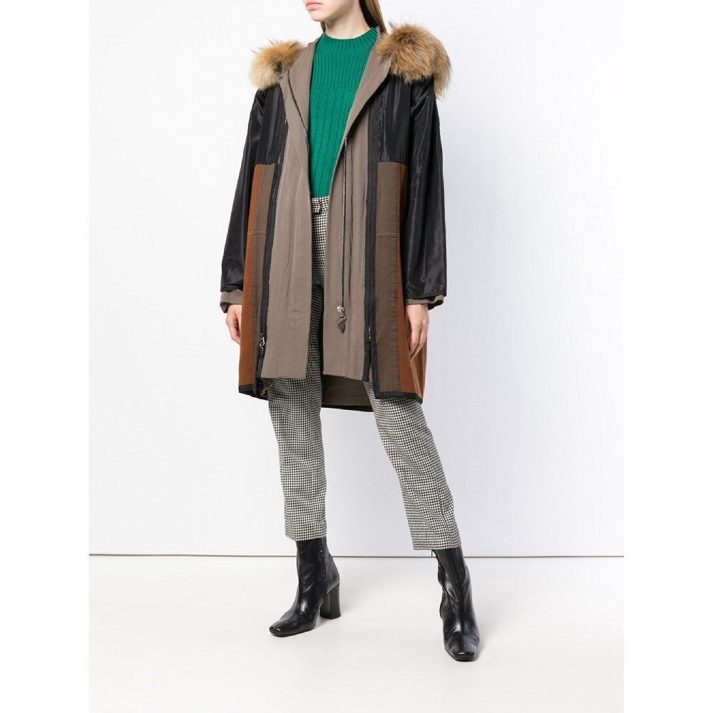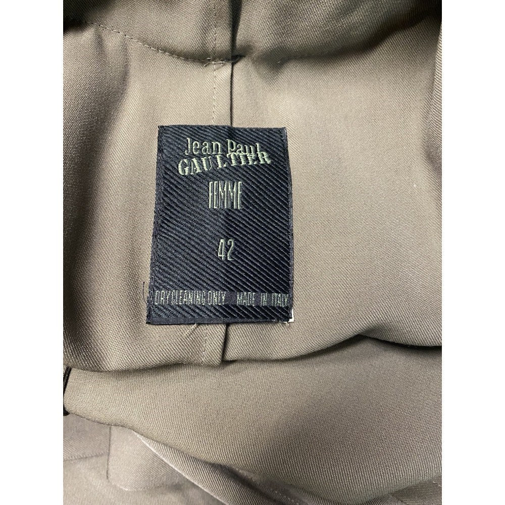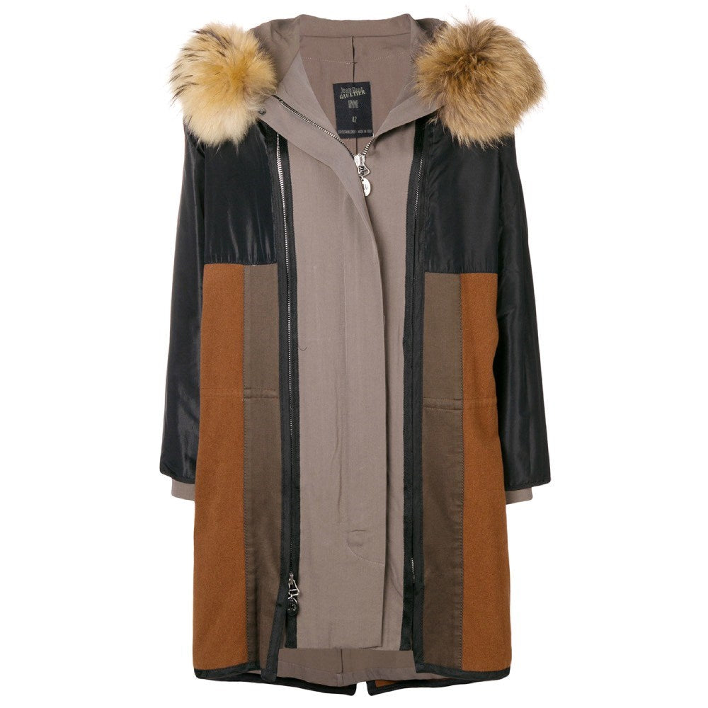 Jean Paul Gaultier khaki cotton jacket with black and brown nylon and wool detachable long vest. Front zip closure, internal drawstring at the waist, three internal pockets, two external front pockets, fox fur insert on hood. The item shows slight signs of wear as shown in the pictures.