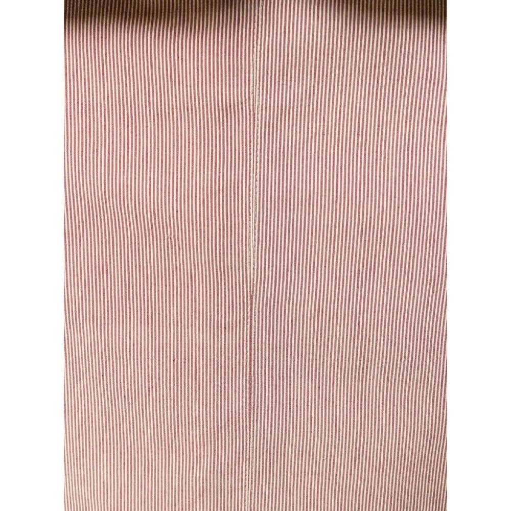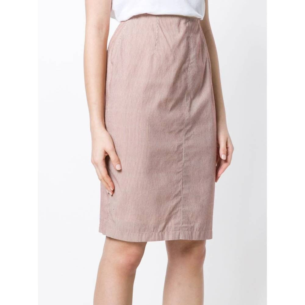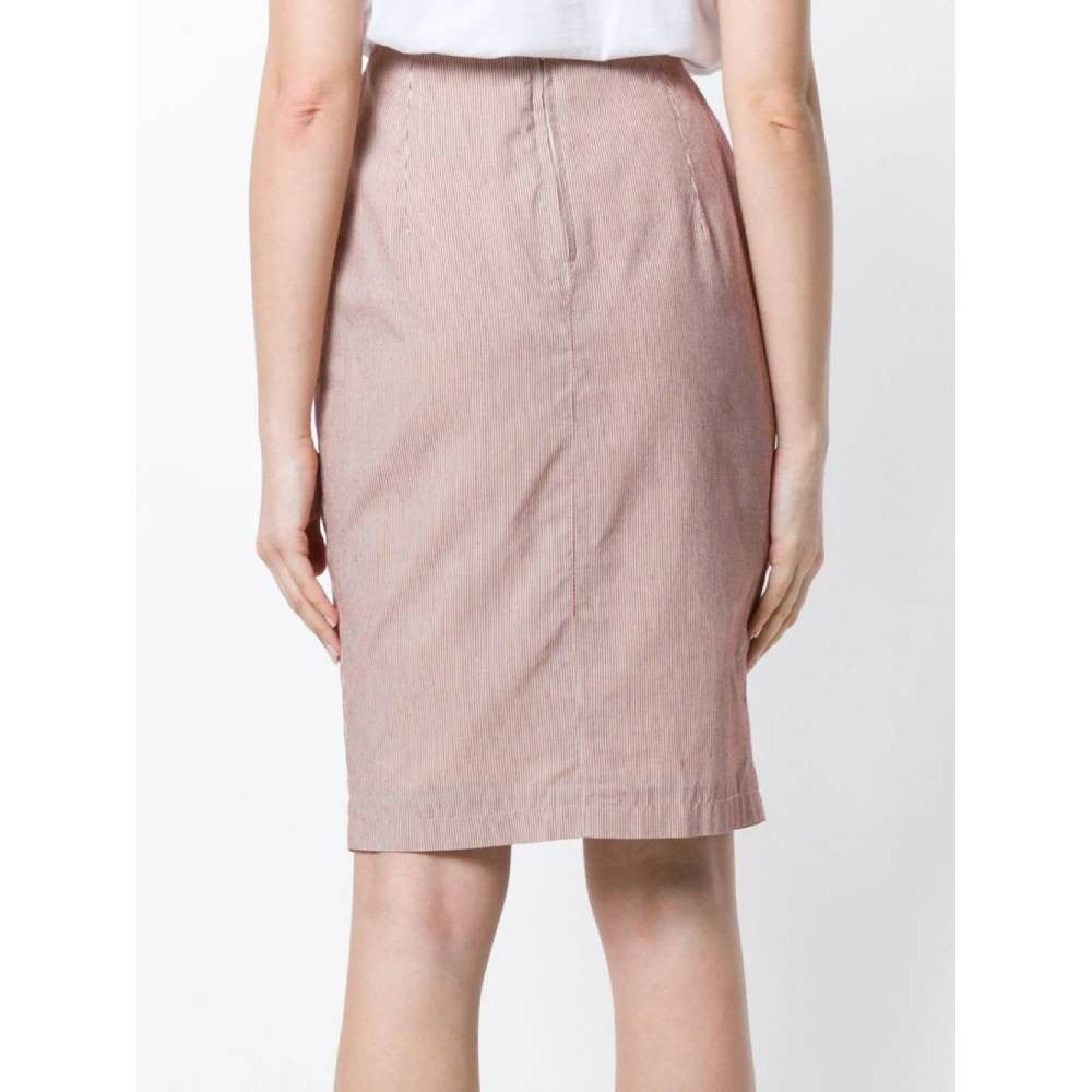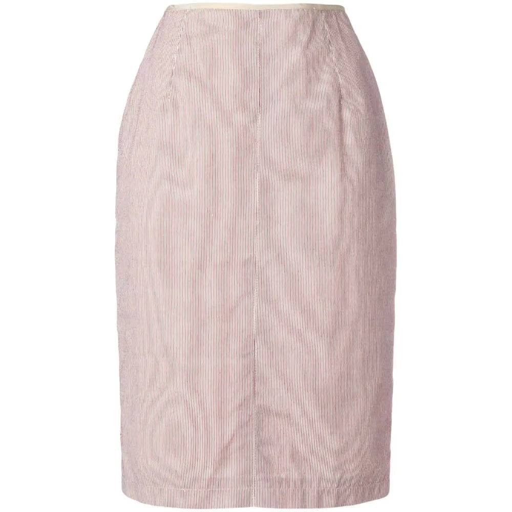 Jean Paul Gaultier cotton blend straight skirt. Burgundy and beige striped print. High waist, back zip closure, knee length and straight hem.