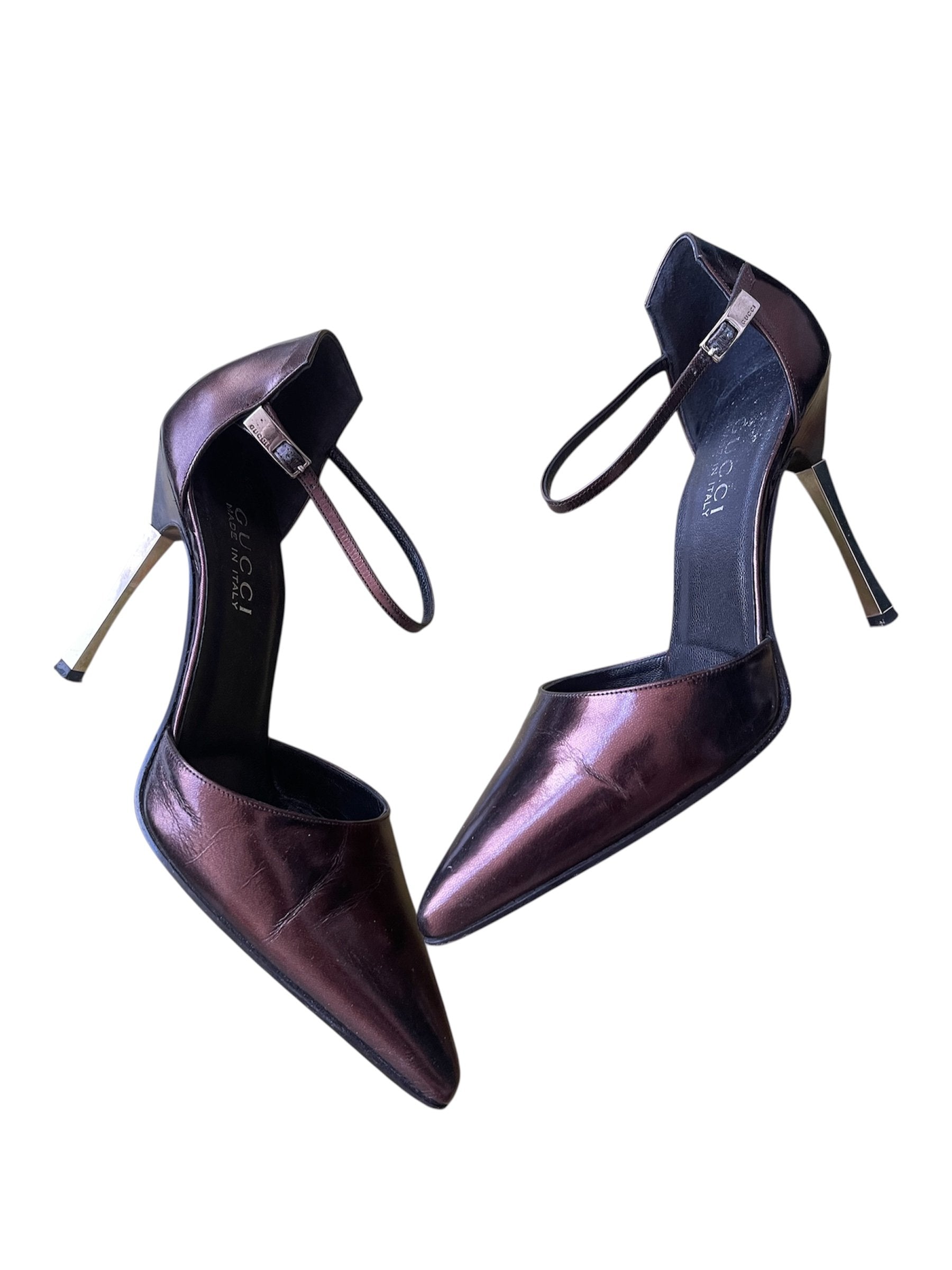 Gucci Bronze 1997 Steel Heel Pointed Ankle Strap Shoes – Size 37.5 with Original Box