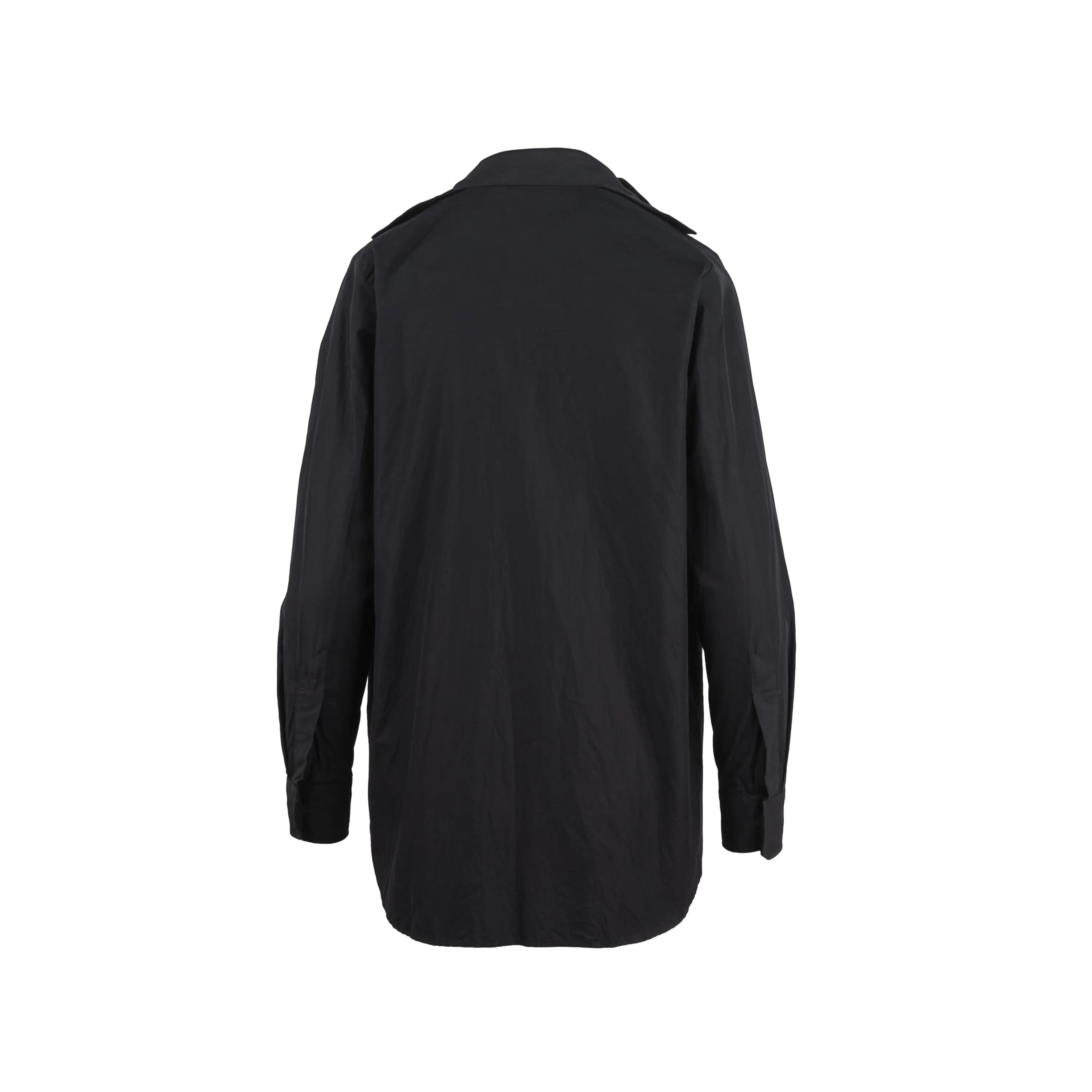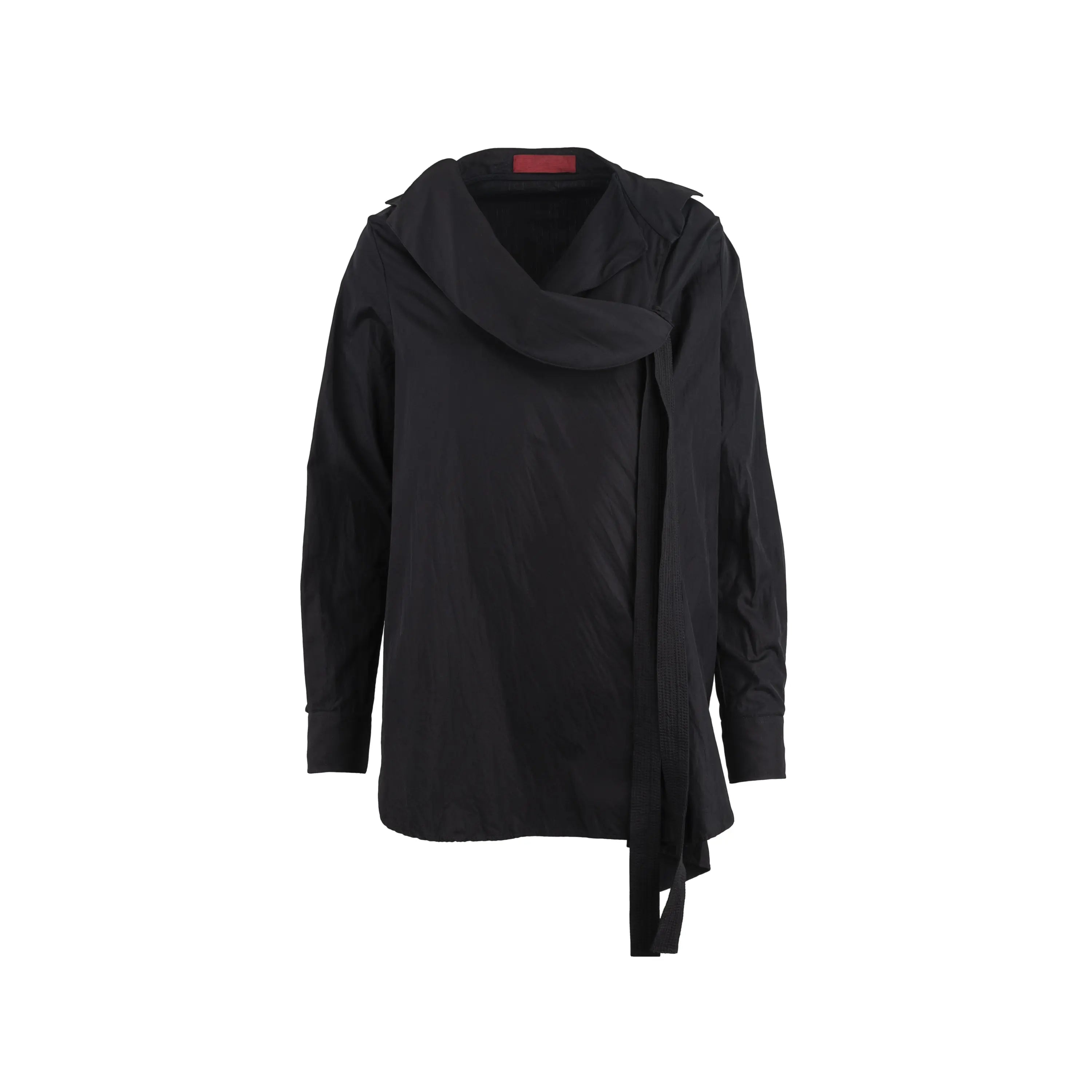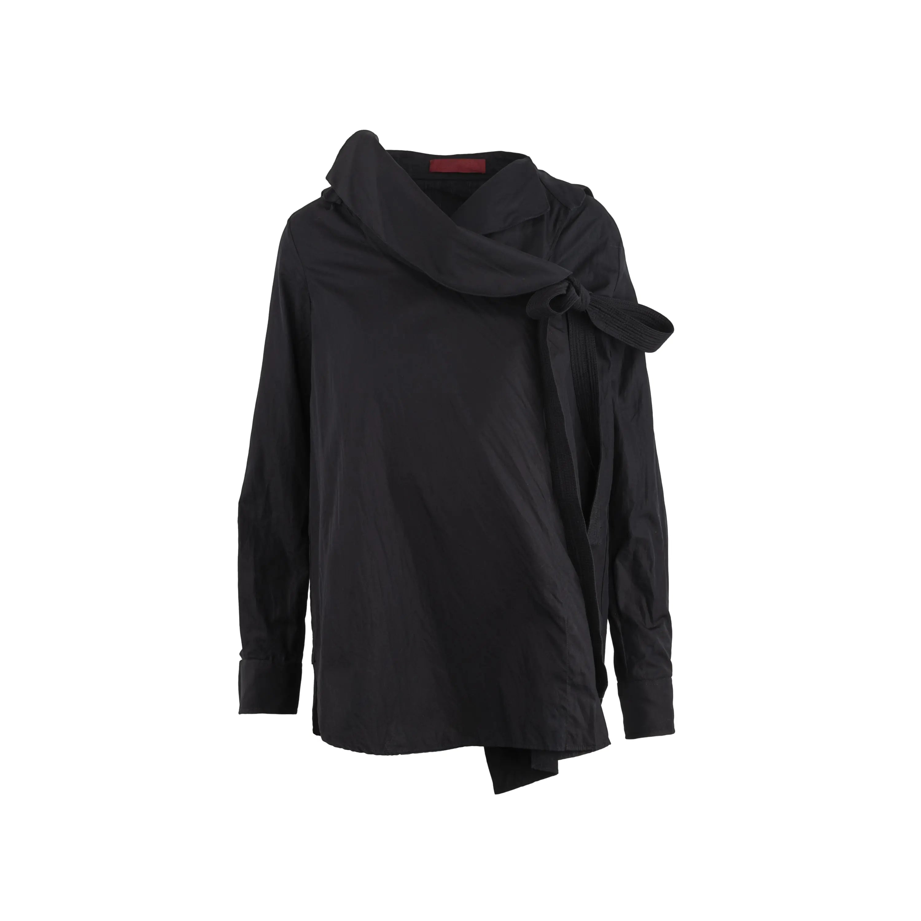 Diliborio black cotton shirt. Oversized style, long sleeves, asymmetric buttoning, wide neckline and decorated with ribbons.