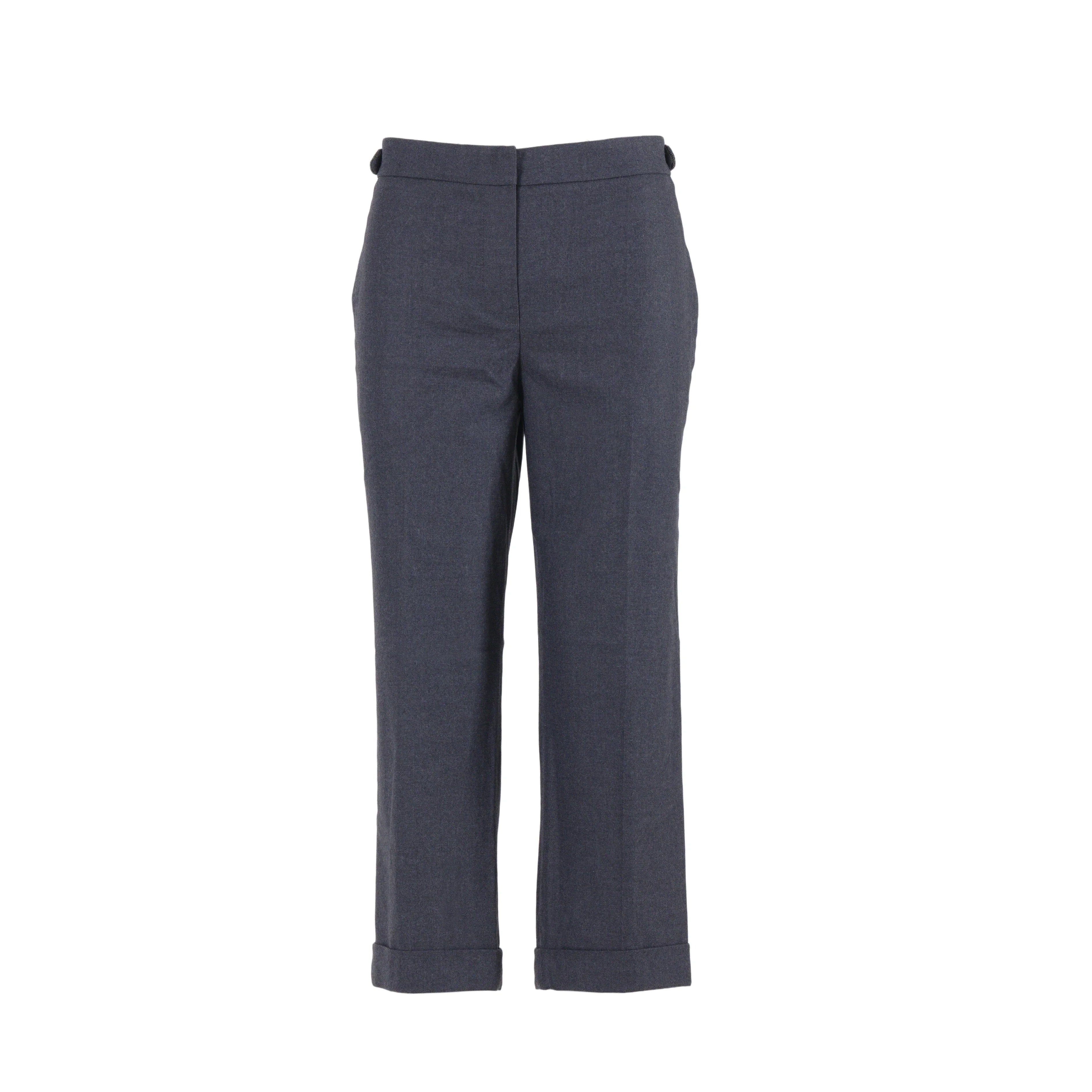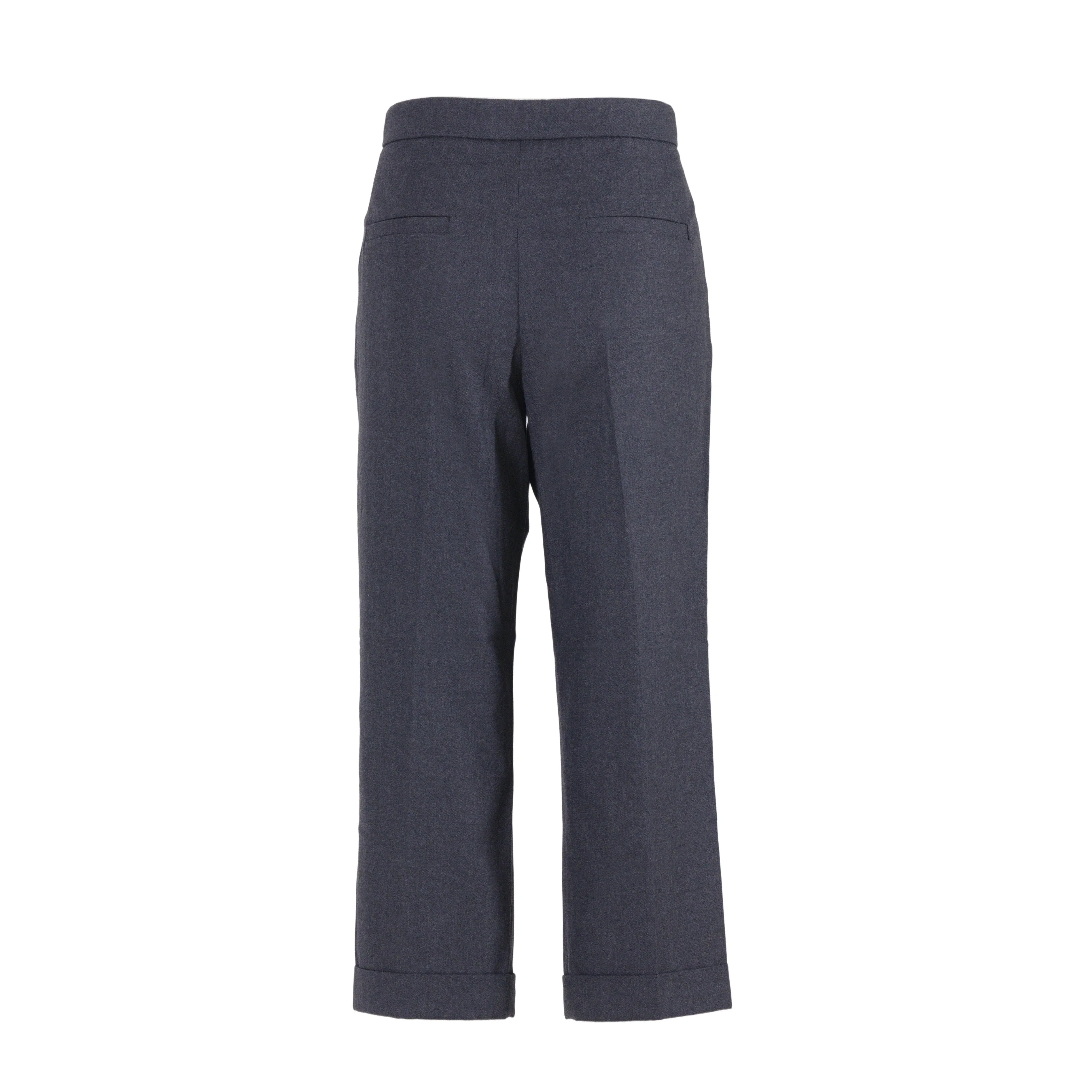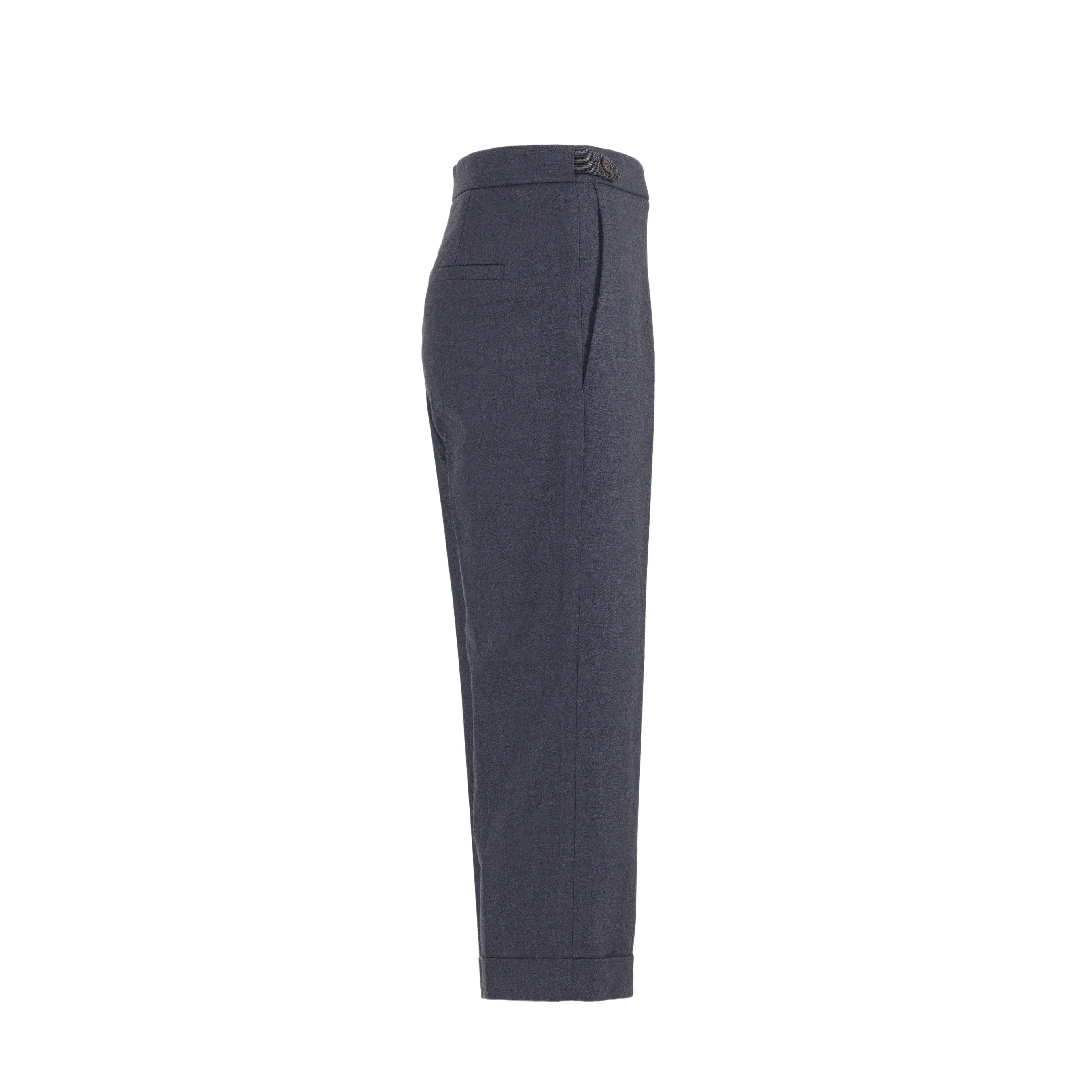 Cut from a soft wool–cotton blend, they feature a mid-rise waist, straight leg, and a deep navy tone with cuffed hems for polished versatility.