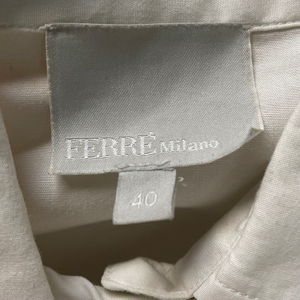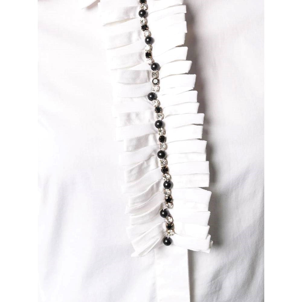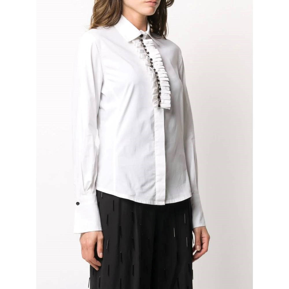 Gianfranco Ferrè white cotton shirt. Frills embellished with black stones and rhinestones. Classic collar, frontal buttons closure and black button on the cuffs.