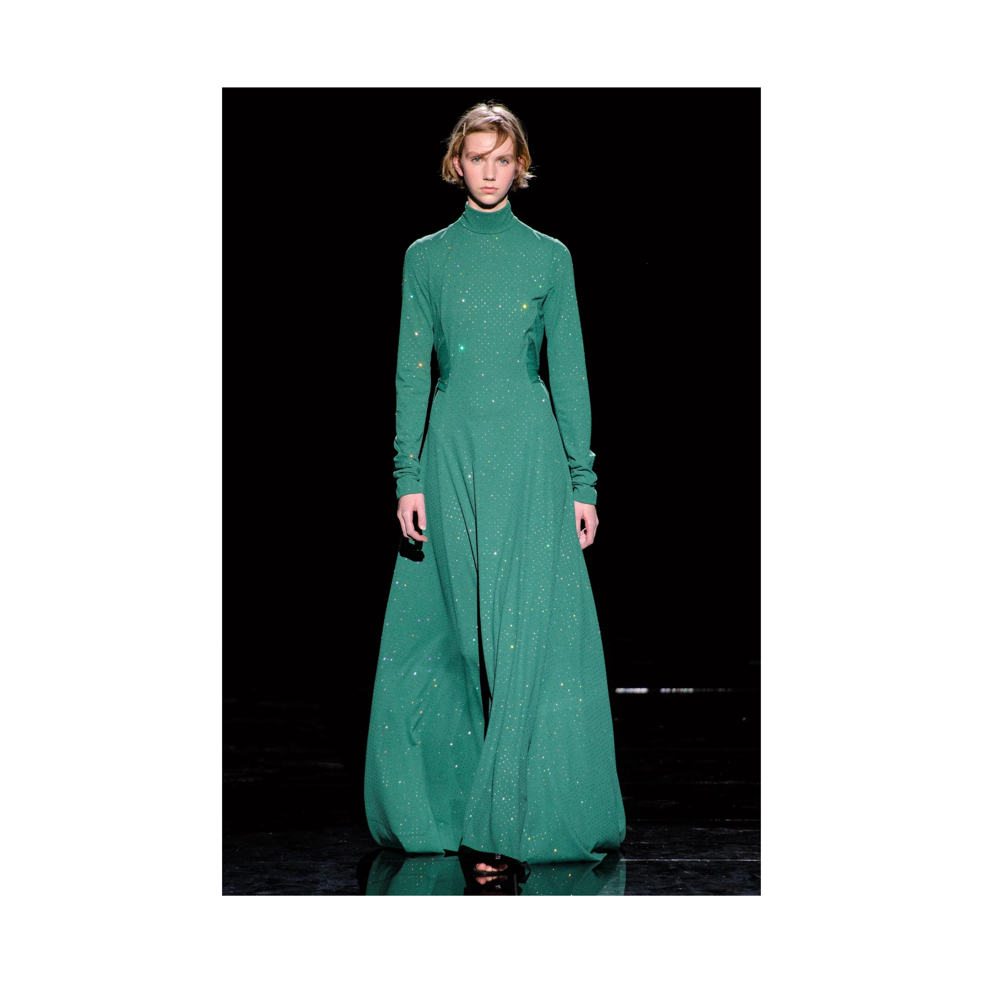 This stunning Marc Jacobs gown features a traditional long and flowy design with small crystal balls that subtly glimmer in the light. It also has an exaggerated feature of two long panels from the waist down that can be tied at the back, adding a unique flair. The high neck and long sleeves give a sleek, sophisticated look. This luxurious statement piece is from the 2019 Fall/Winter runway collection by Marc Jacobs.