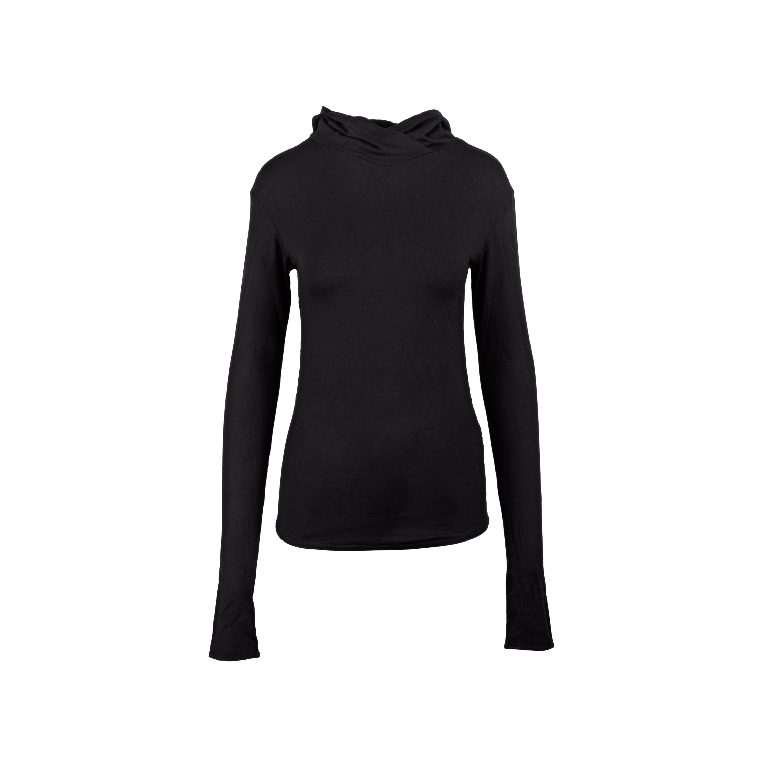 Monochrome close-fitting black hoodie.