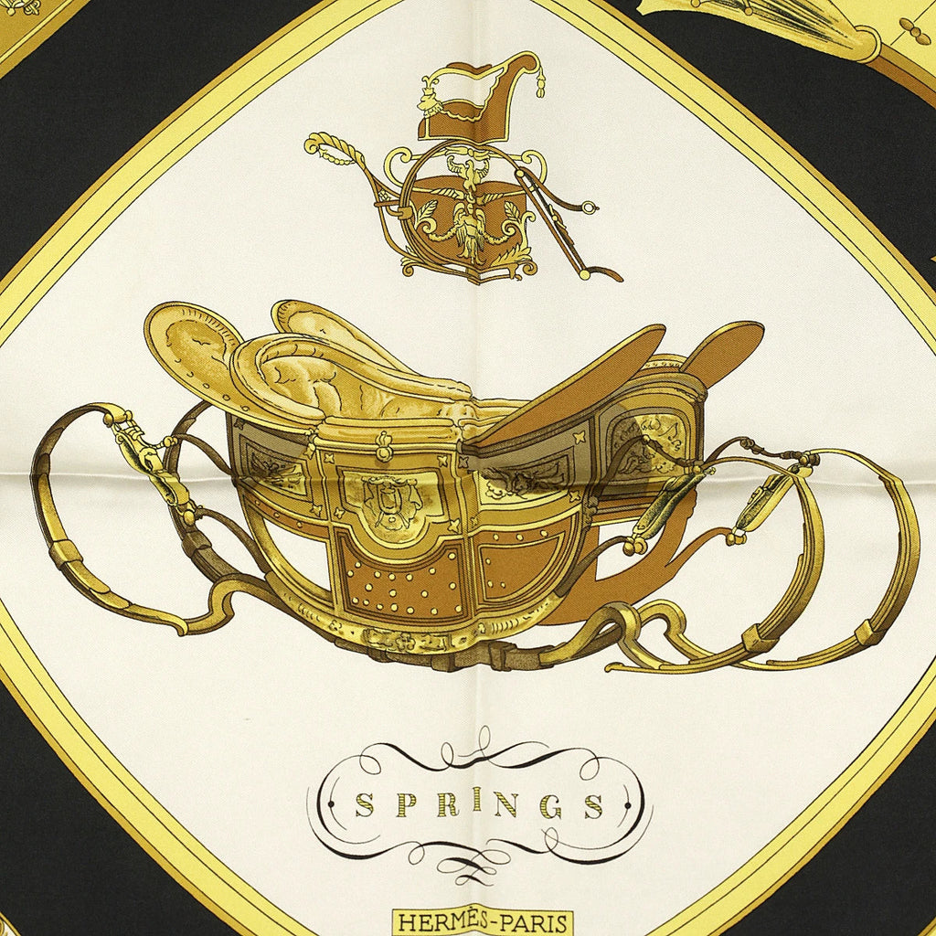 This "Springs" vintage Hermès silk twill scarf was designed by Philippe Ledoux. The scarf was first issued in 1974 and reissued countless times over the decades. This re-issue scarf in a black colourway is in excellent vintage condition with no issues. No box but can be supplied in a plain black box.