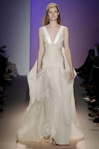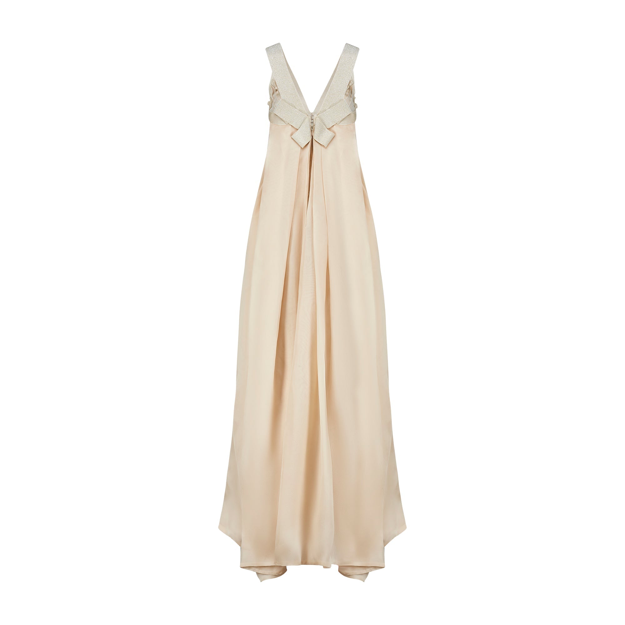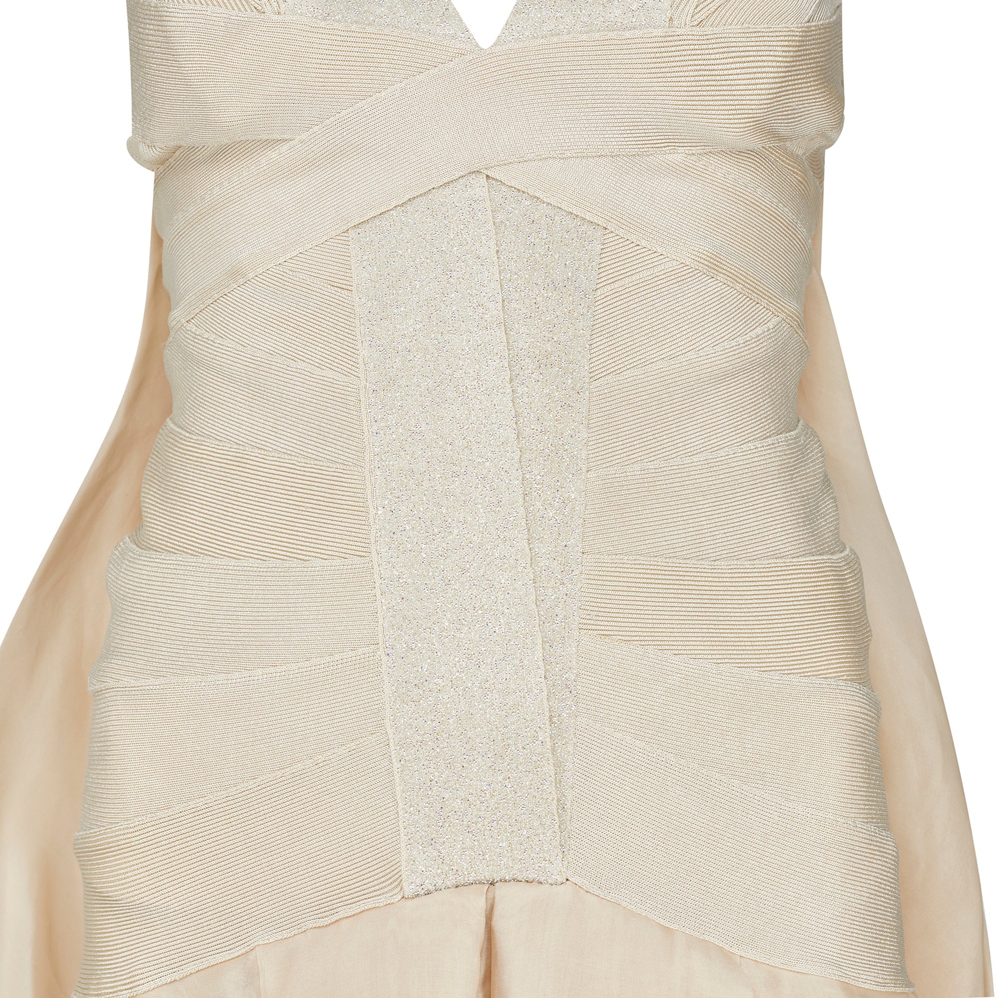 Champagne-toned maxi dress from Max Azria's debut collection for the Hervé Léger Fall 2008 runway, conceived as the house’s sculptural take on a bridal silhouette. Hervé Léger rose to prominence in the late 1980s and 1990s with his innovative bandage dresses, made from stretch panels inspired by couture techniques. The upper body is constructed in classic bandage style, tightly contouring the figure like a corset with a starburst-like arrangement of panels that converge at a glittering bandage strip that acts as an anchor. This embellished band becomes the shoulder straps, framing a V-neckline. Below the structured bodice, the dress transitions into a voluminous, softly pleated skirt crafted from substantial silk chiffon in a tonal champagne hue. From the back, the skirt appears to begin higher on the body, but this effect is created by an attached train or cape that drapes over the skirt. Falling from the shoulder blades, it descends from the same shimmering bandage that forms a V-shape at the back and is folded into a bow at the top of the train. The skirt is lined with a tonal silk slip, while the bodice remains unlined, relying on the dense bandage mesh for structure and coverage.