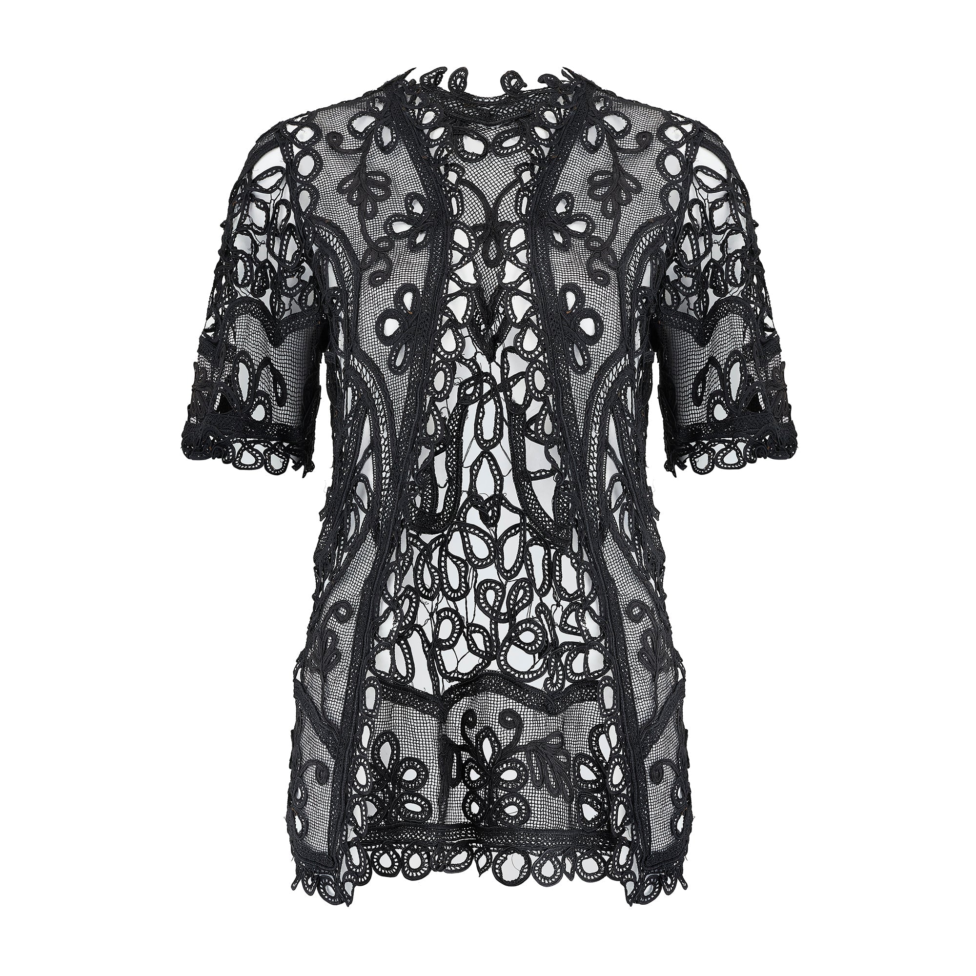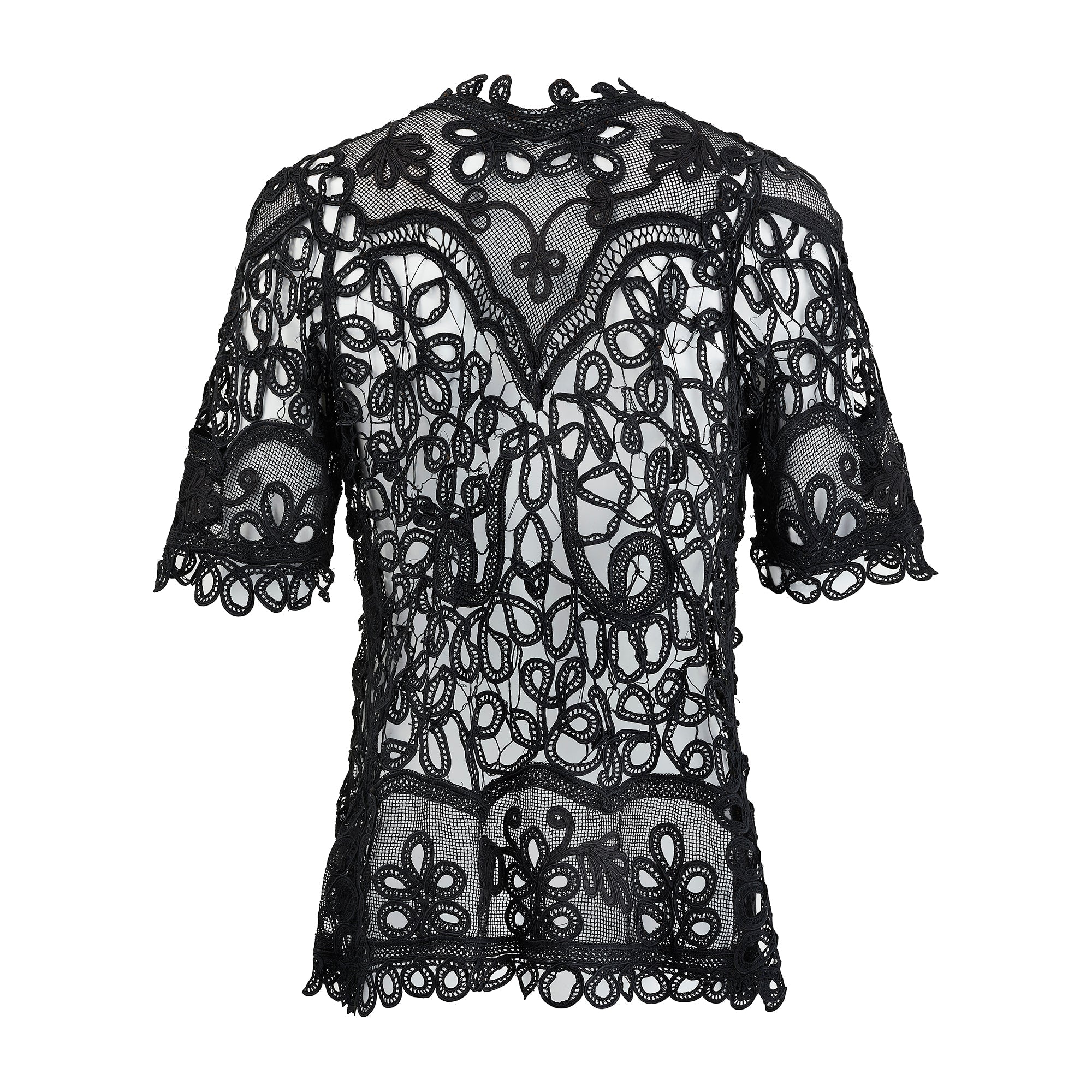 This intricately hand crafted Edwardian jacket dates back to the early 1900s and is a wonderful example of tape or Battenberg lace whereby pieces of tape are bent into the shape required and sewn into position and the gaps are filled in with hand-sewn lace. This jacket has an elongated silhouette and short, slightly flared sleeves. The hemlines follow the swirling lines and patterns in the lace. This wonderfully preserved piece of history would make a beautiful and lightweight cover-up over a piece of evening-wear or a corset top. There are no fastenings and jacket is open style.