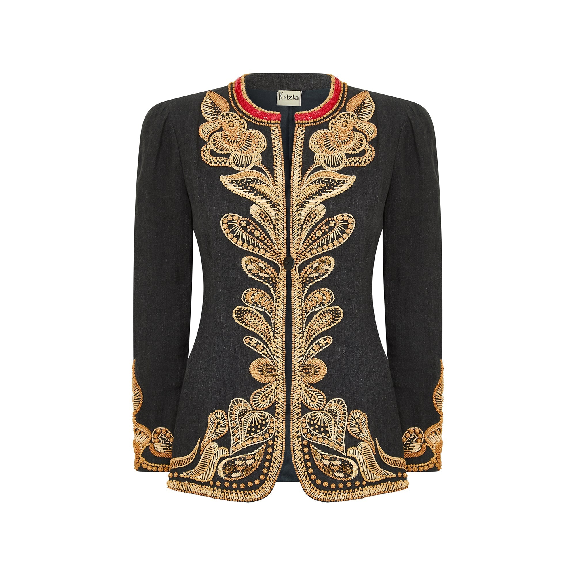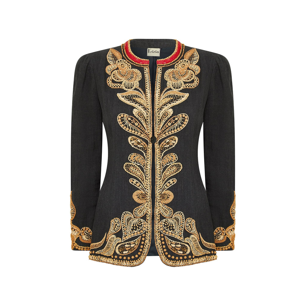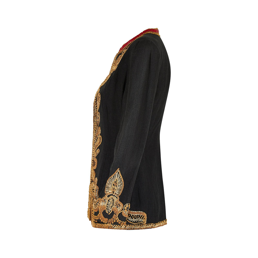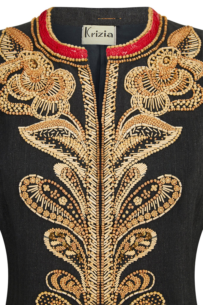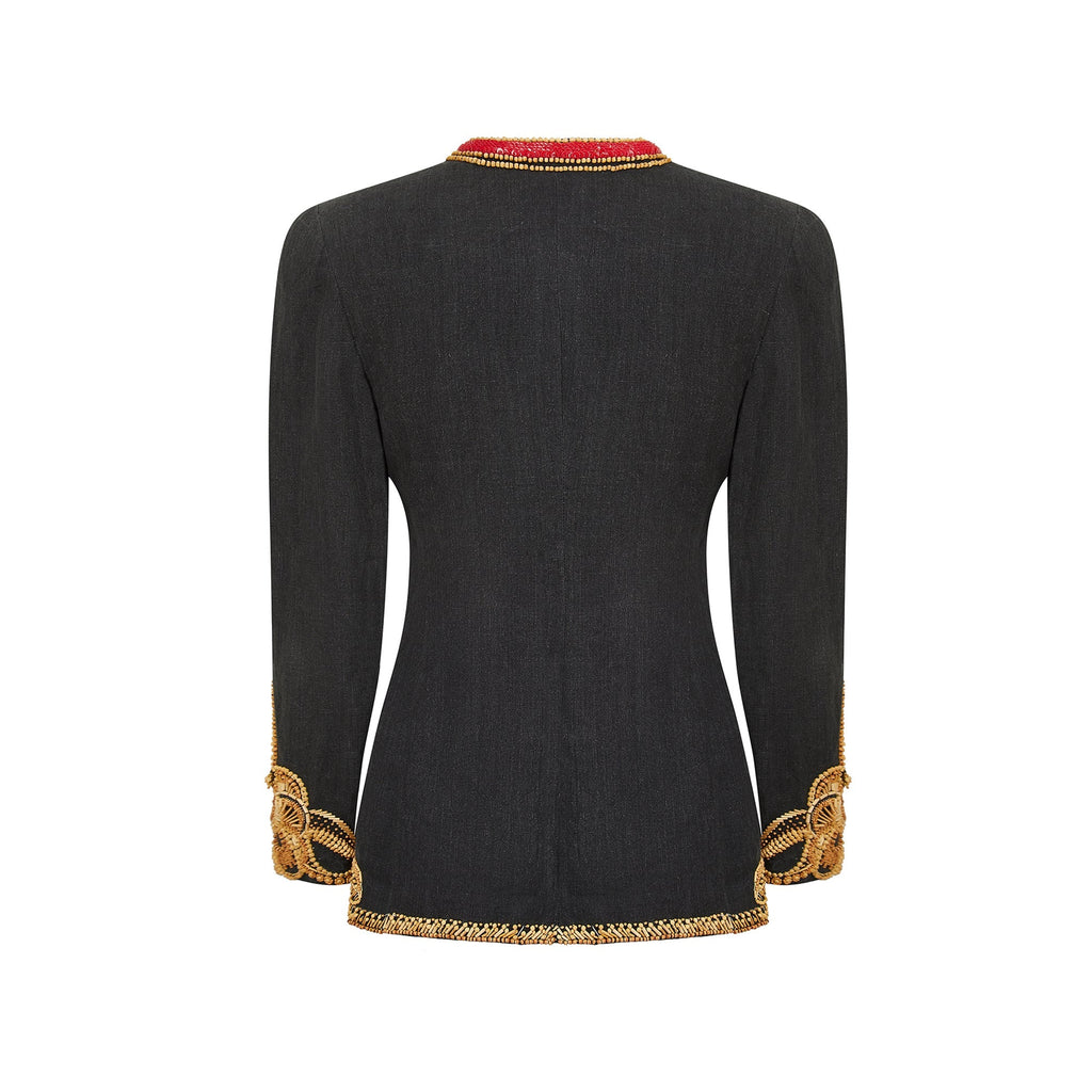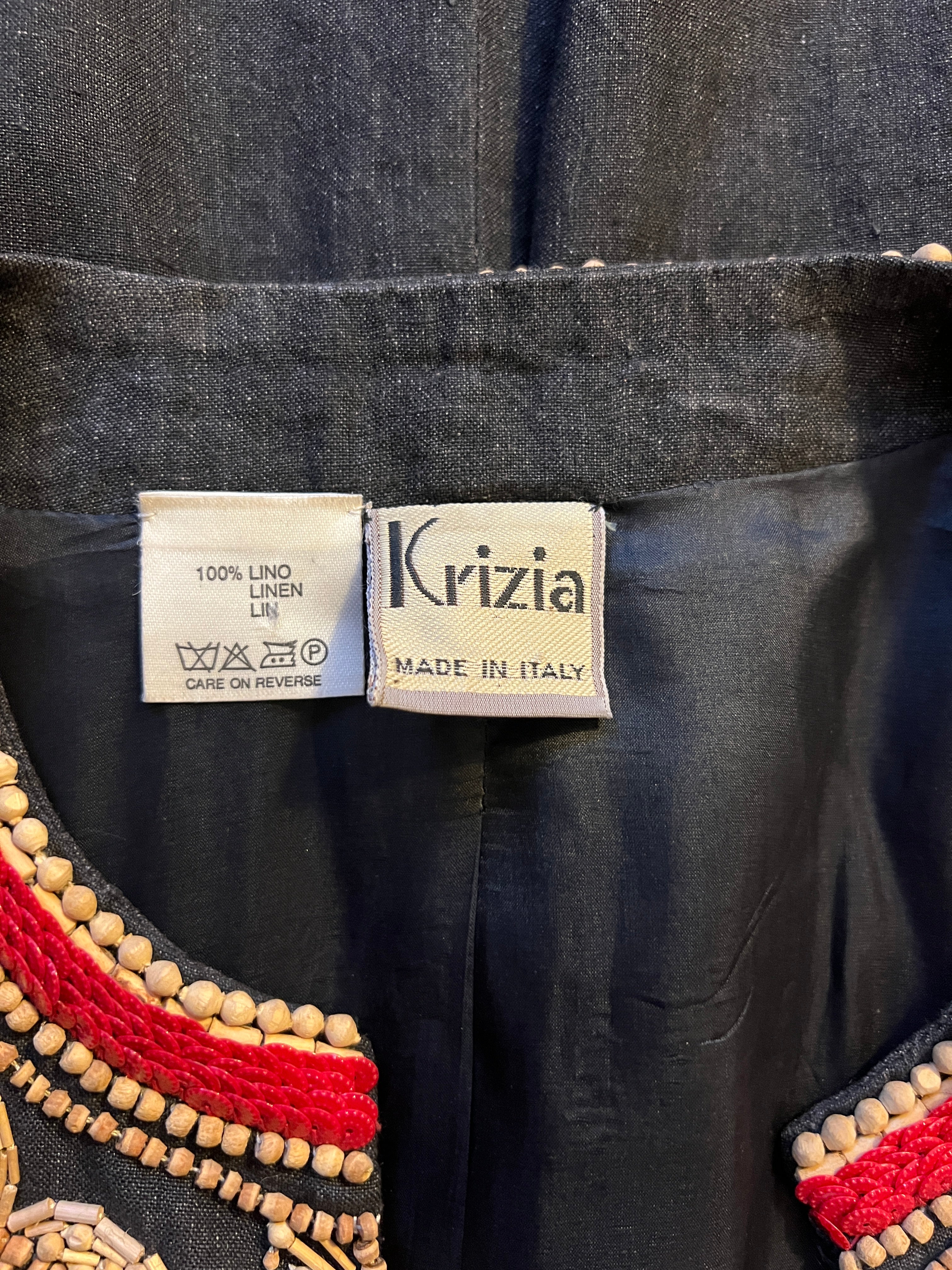 Krizia was an Italian luxury ready-to-wear label that was founded in 1954 by Mariuccia Mandelli. Wearable, eclectic and extravagant, the brand's embellished designs are now highly collectable. This military style jacket was shown on the 1993 Spring / Summer runway. Tailored from rich grey linen, it is embellished with hundreds of carved wooden beads in elaborate floral forms down the front, along the bottom hem and at the cuffs. The neckline is finished with layers of high-shine circular red beads. A hidden single button secures the front of the jacket.