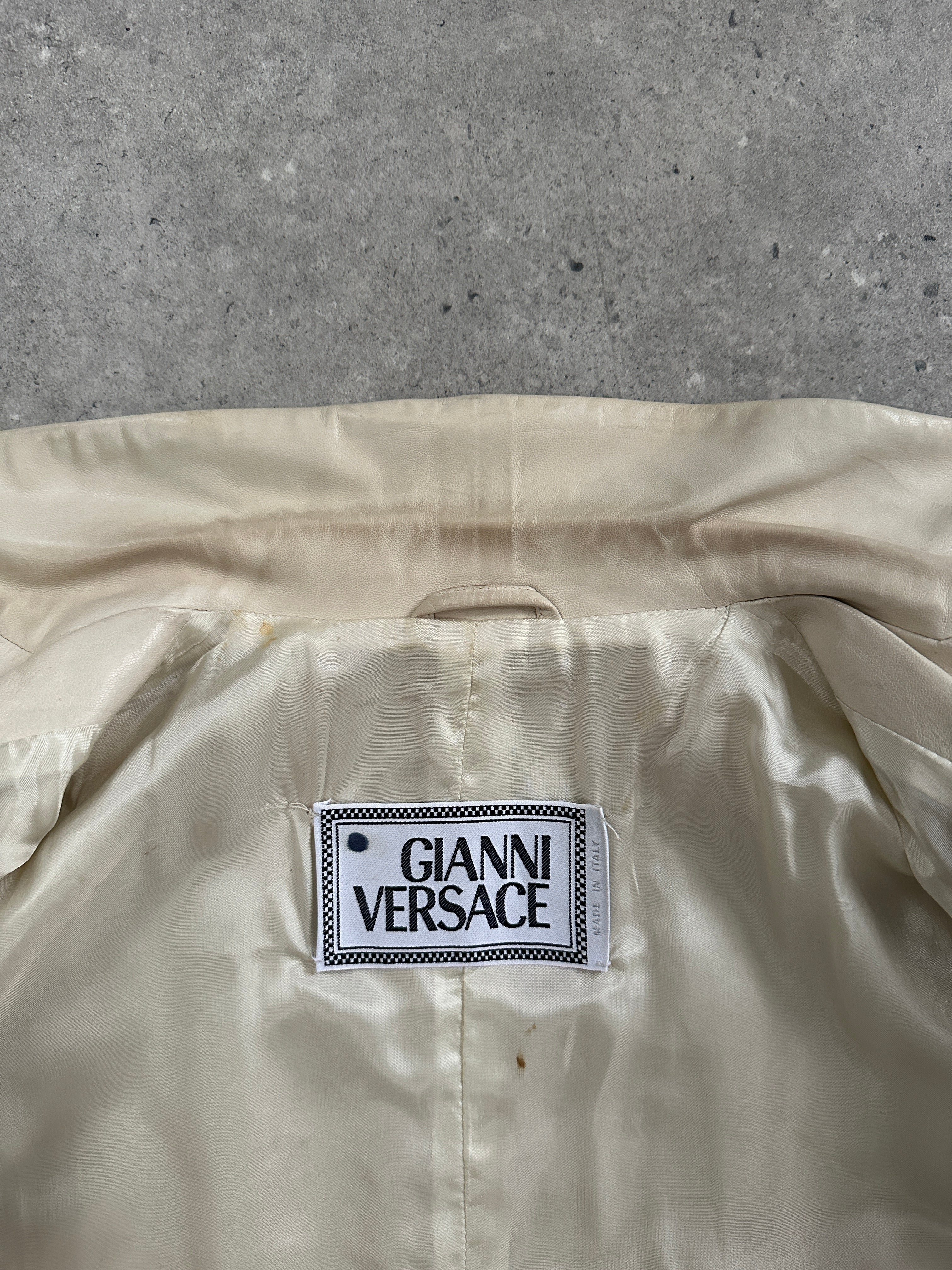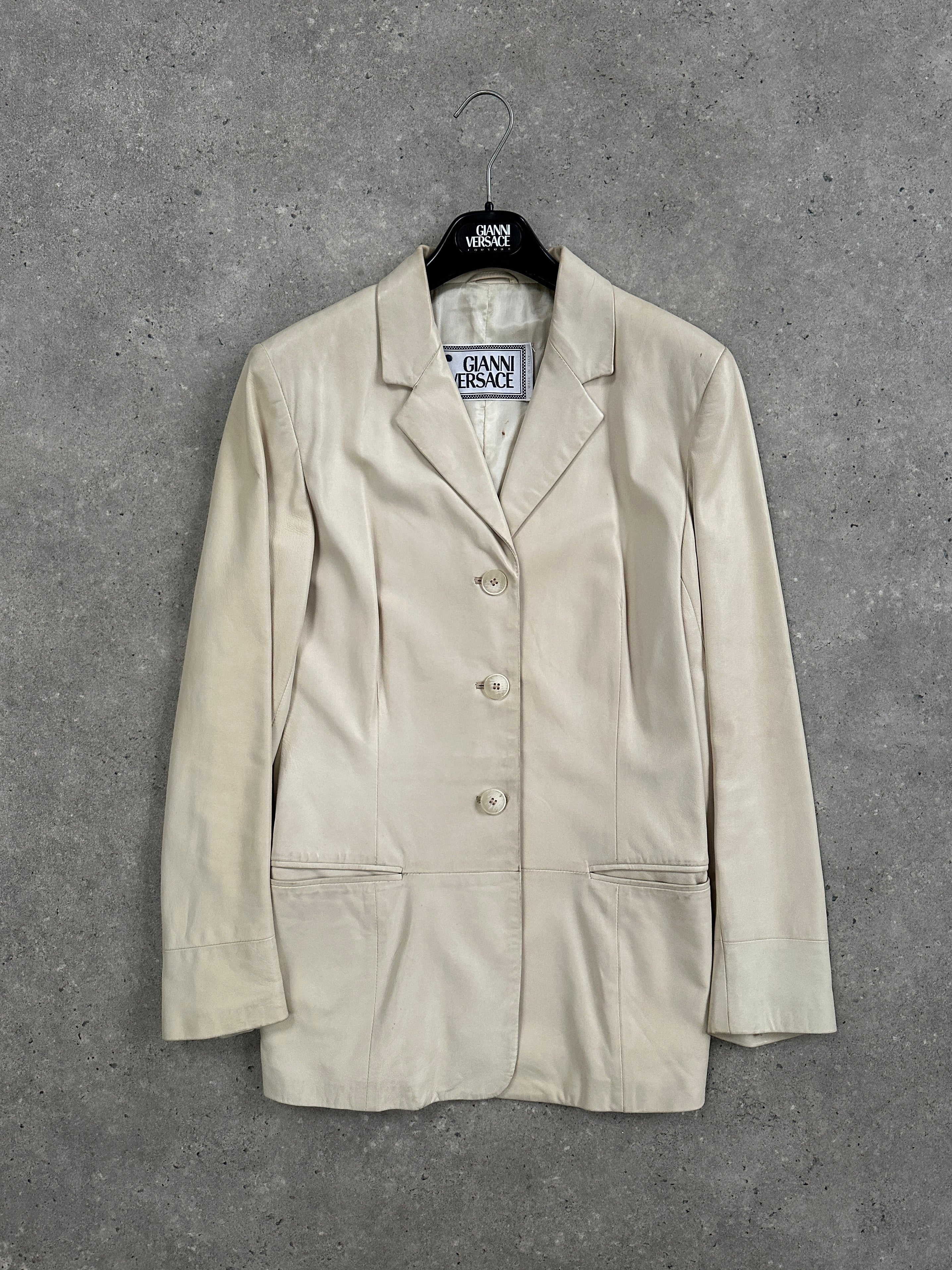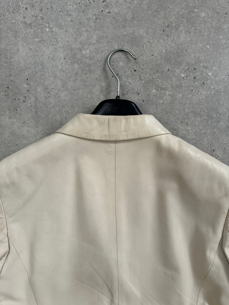 Vintage 1990s Gianni Versace cream leather jacket with a softly tailored silhouette and clean minimalist detailing. The smooth hand of the leather and the gentle shaping at the waist give this piece a quietly elevated finish.
