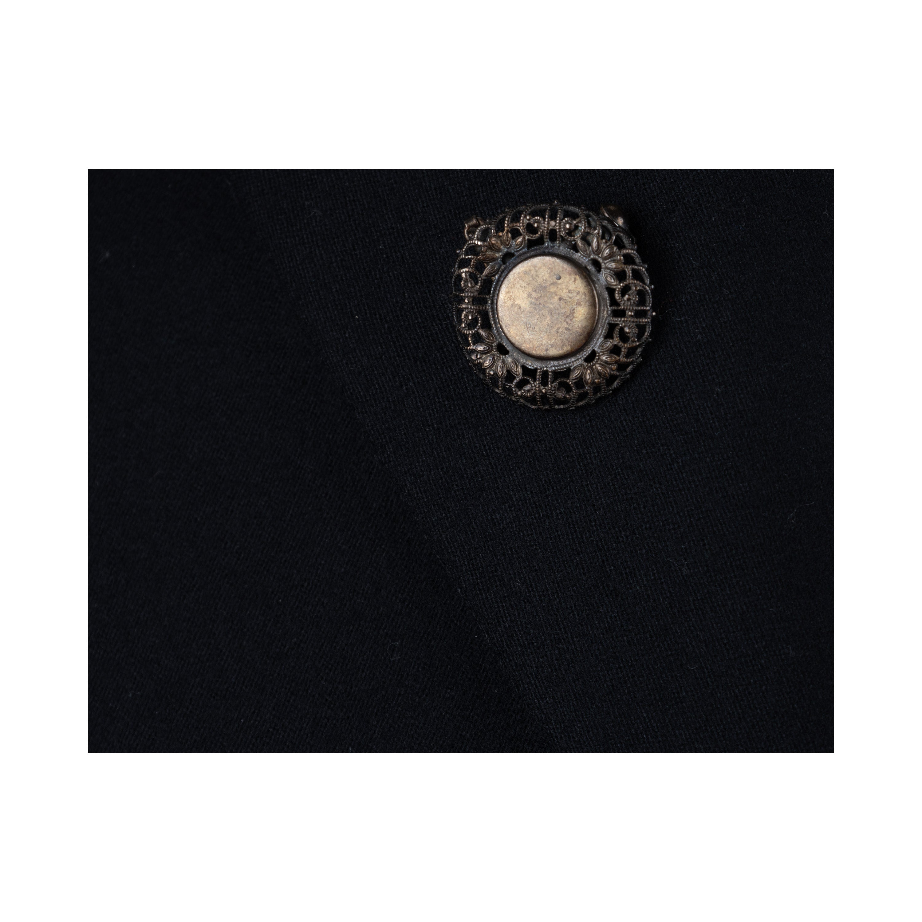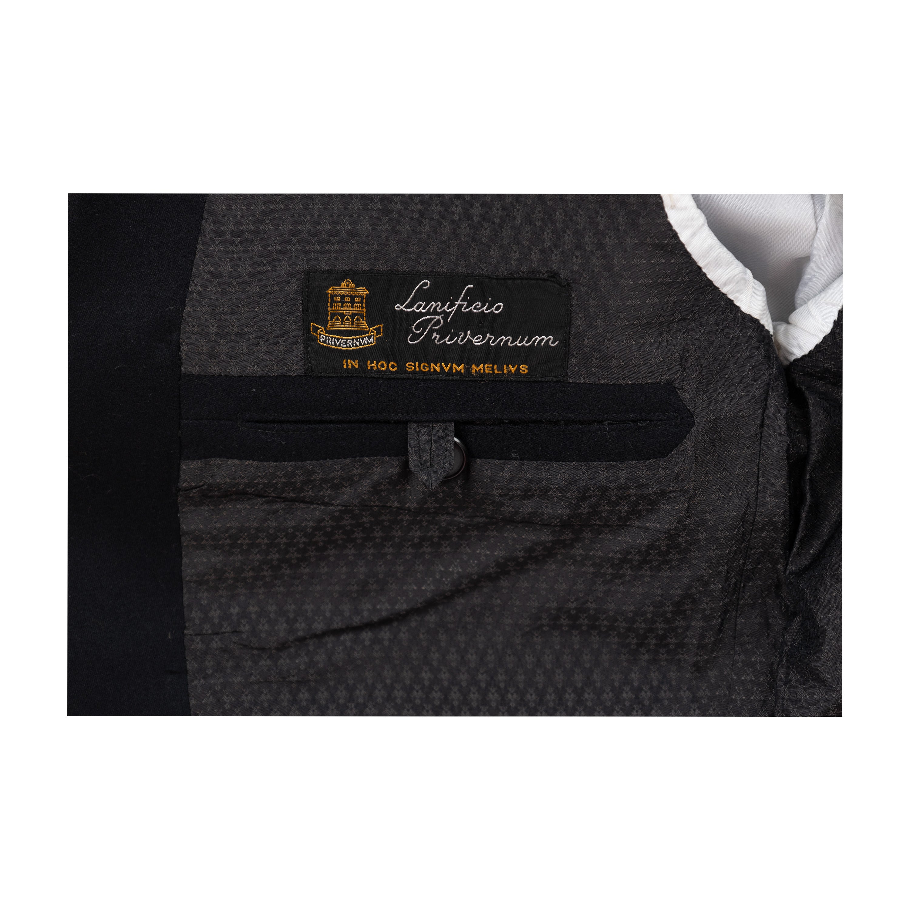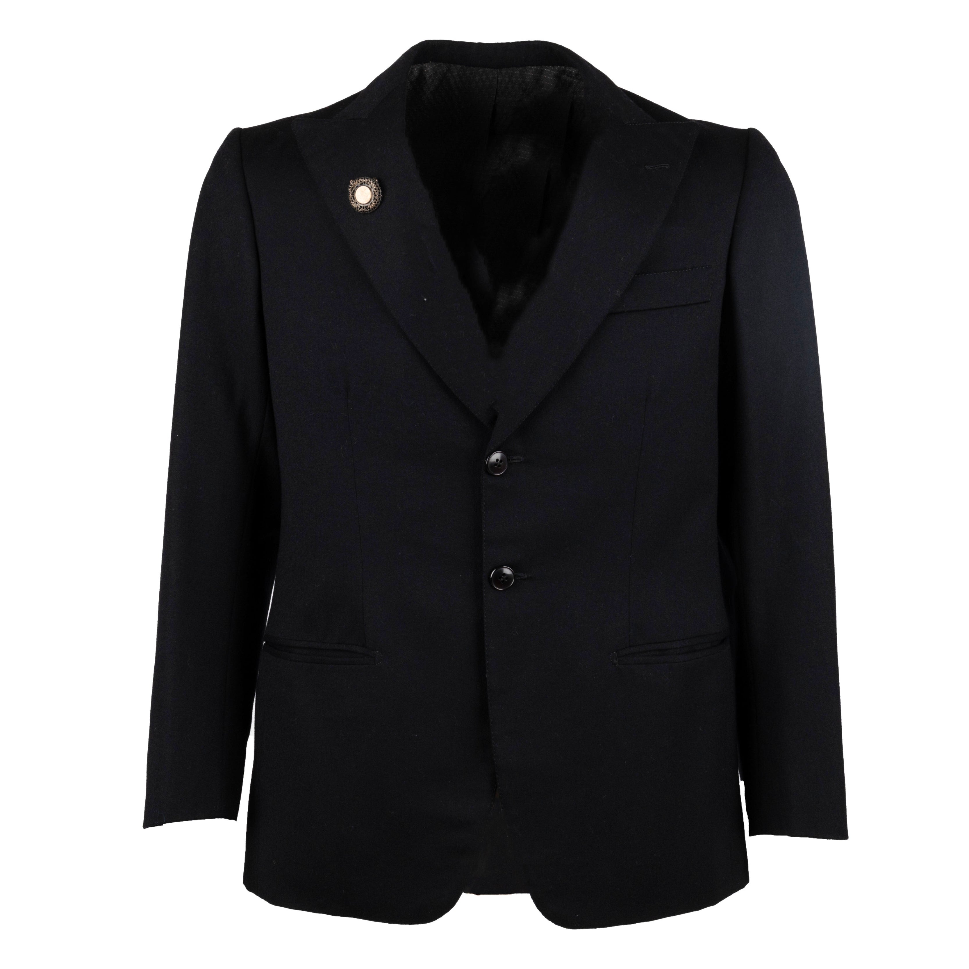 Crafted from fine wool with a fitted construction, this Lanificio Privernum blazer stands out with a lapel collar and two front buttons, finished with a decorative vintage brooch. Ideal for formal occasions with a classic touch.