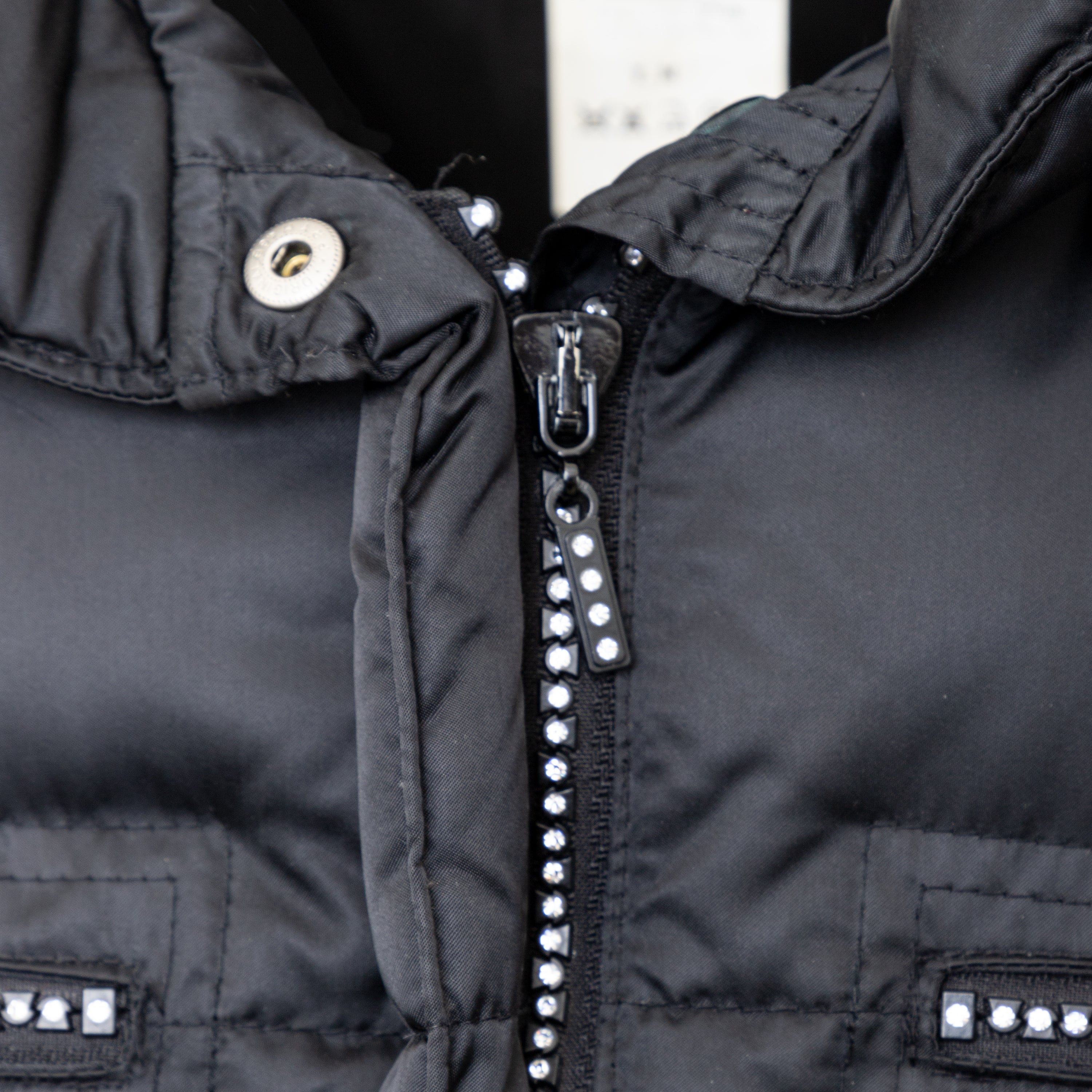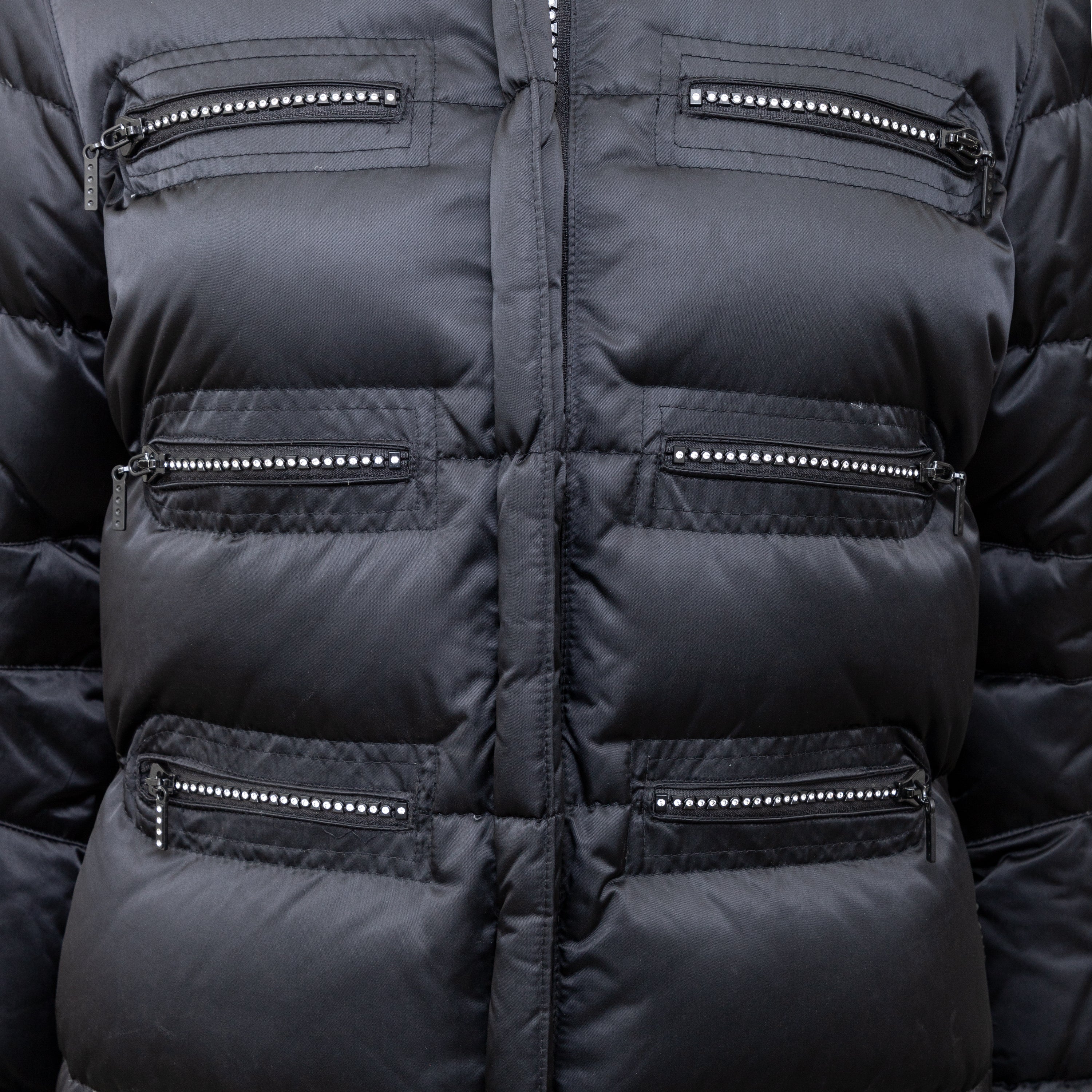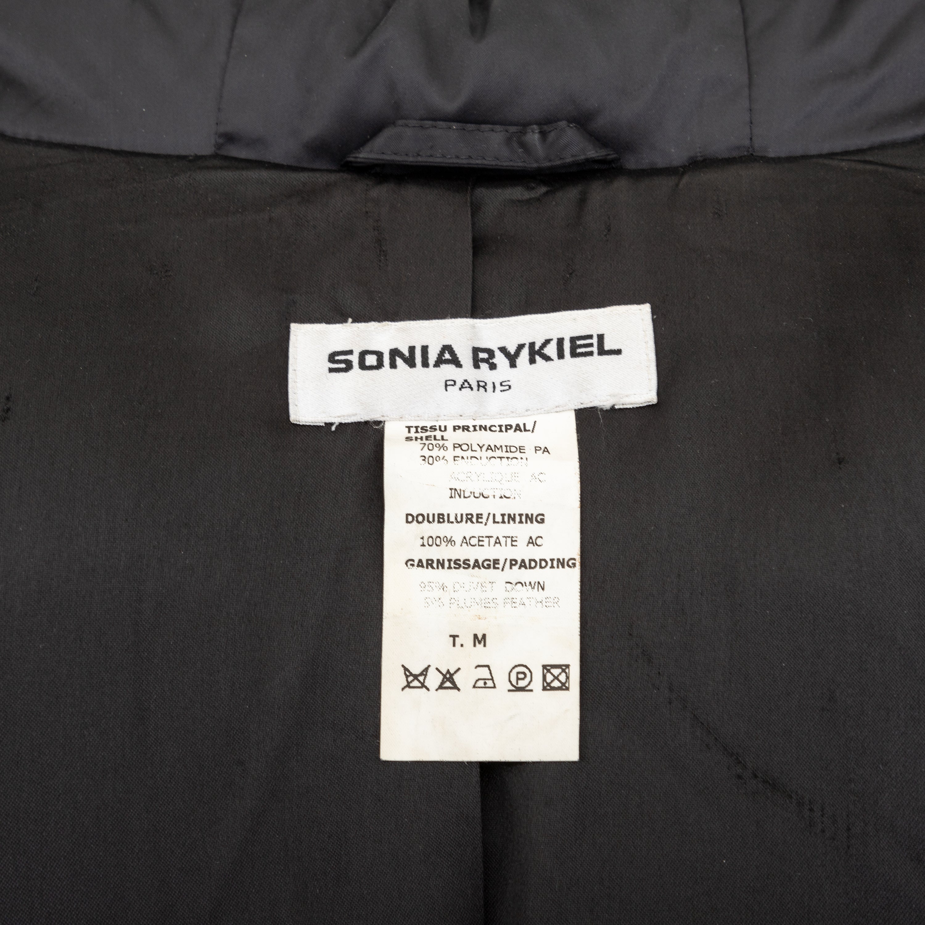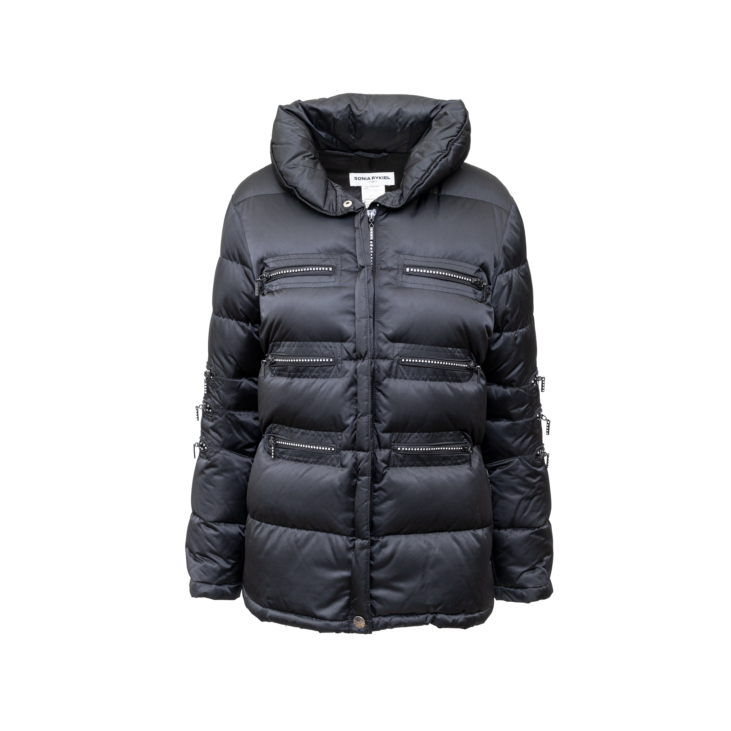 This Sonia Rykiel black down jacket is a warm and stylish addition to your closet. Featuring a front zip fastening and long sleeves, this jacket is both functional and fashionable. The rhinestone details on the pocket zips add a touch of glamour to any winter ensemble.
