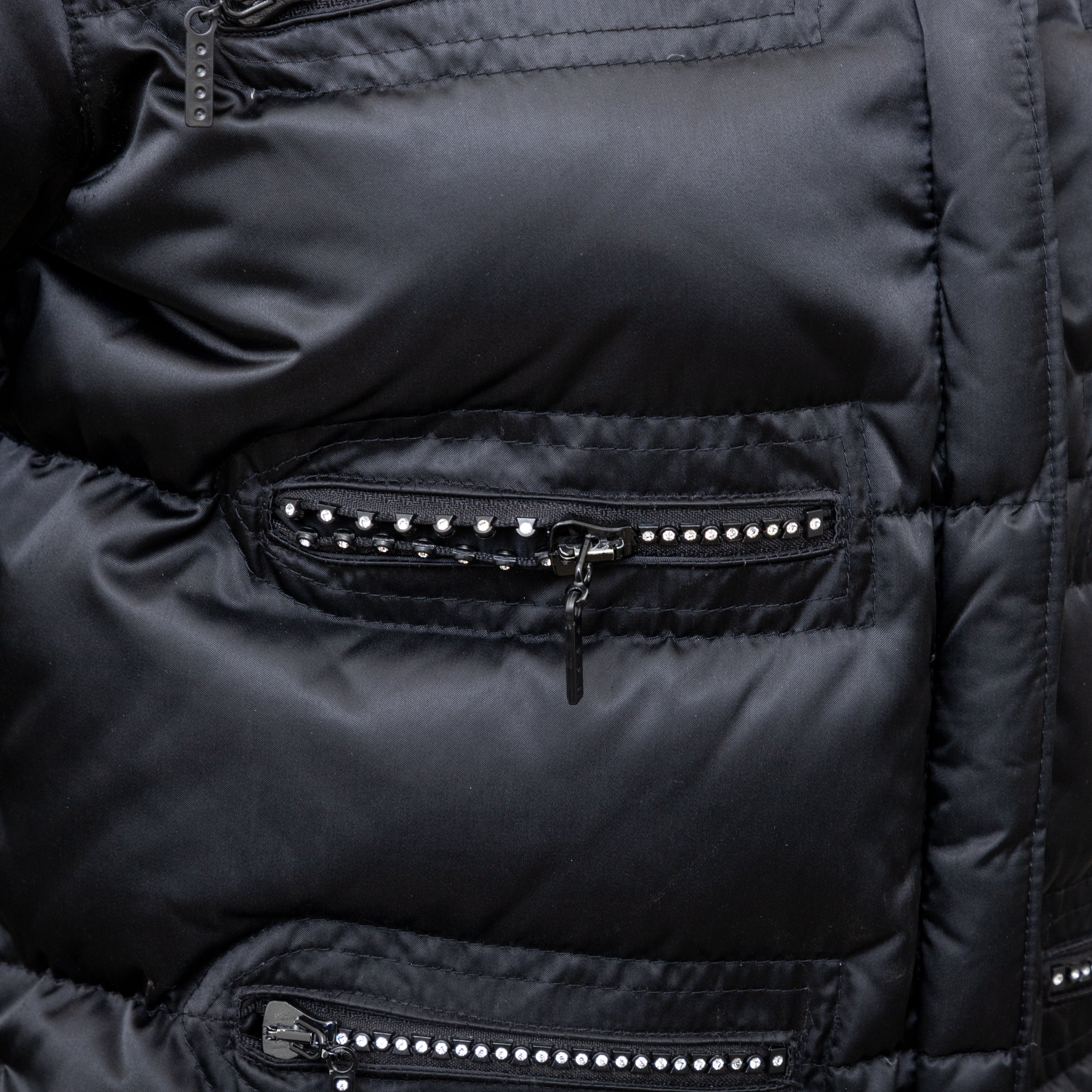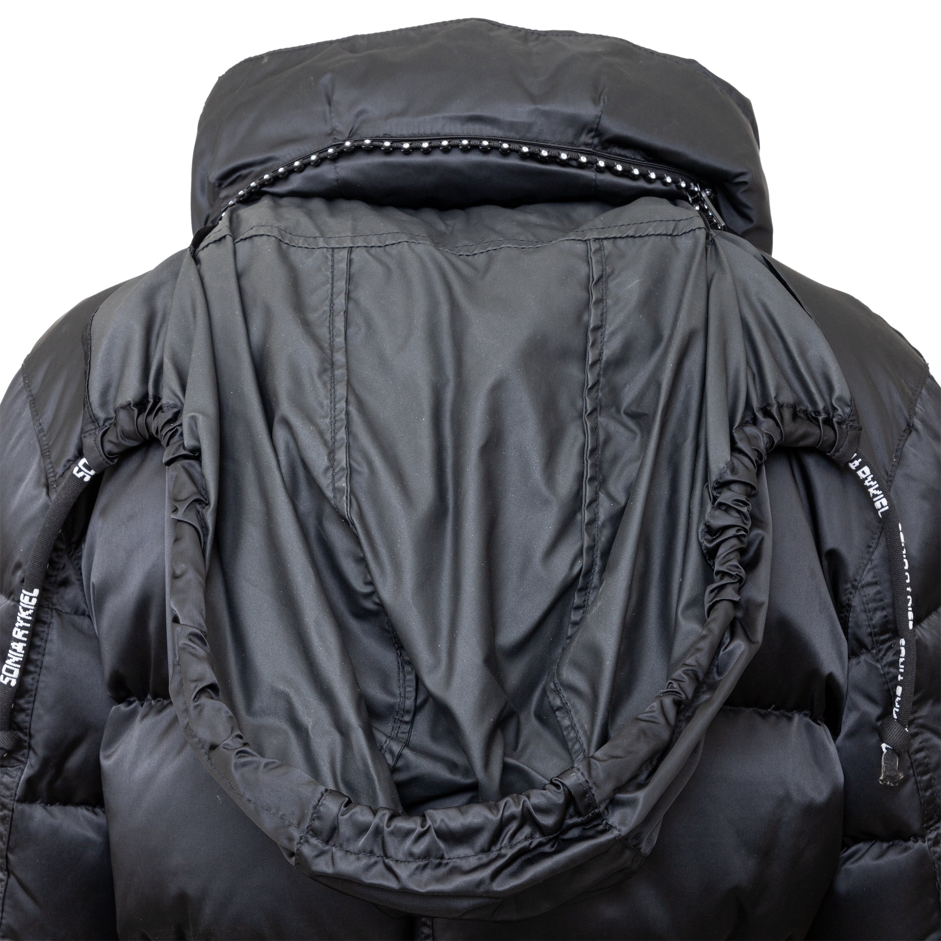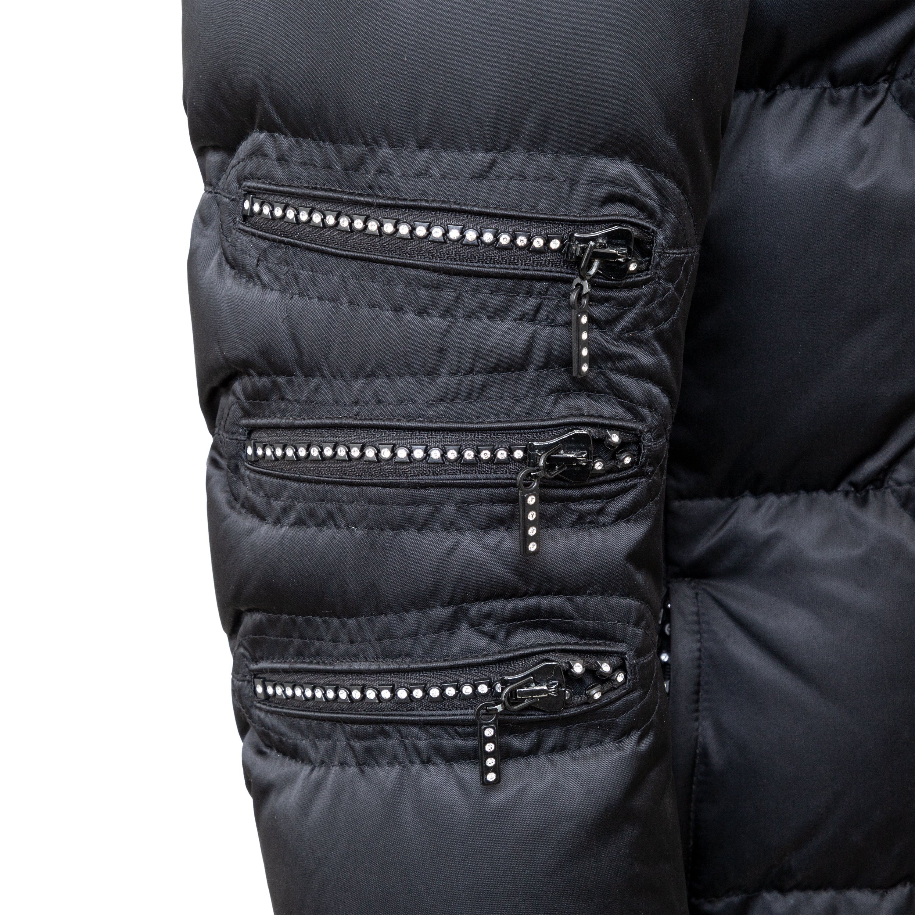 This Sonia Rykiel black down jacket is a warm and stylish addition to your closet. Featuring a front zip fastening and long sleeves, this jacket is both functional and fashionable. The rhinestone details on the pocket zips add a touch of glamour to any winter ensemble.
