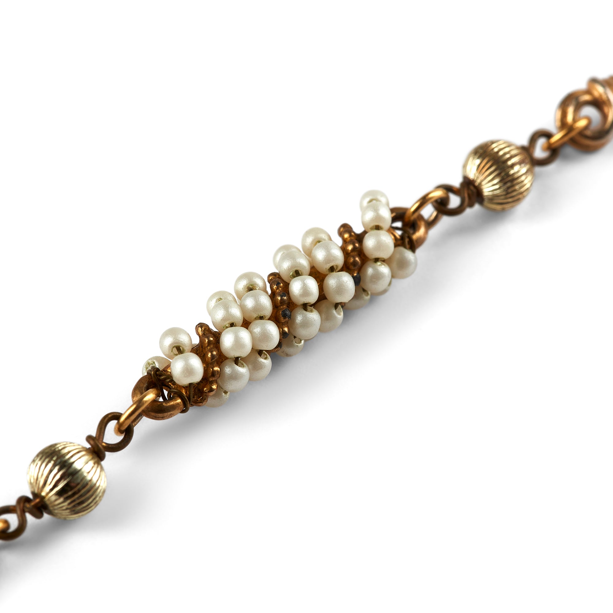 This single strand sautoir was likely crafted by Robert Goossens, a long time jewellery collaborator with Chanel after she returned to Paris in 1954; it simply slips on over the head. The necklace is made up of glistening white seed pearls, threaded in spirals around gold-plated bars. The chain is formed of gold-plated twisted pieces which look like 'barbed wire' and the final adornment is the spherical gold-toned beads which are engraved in vertical lines.