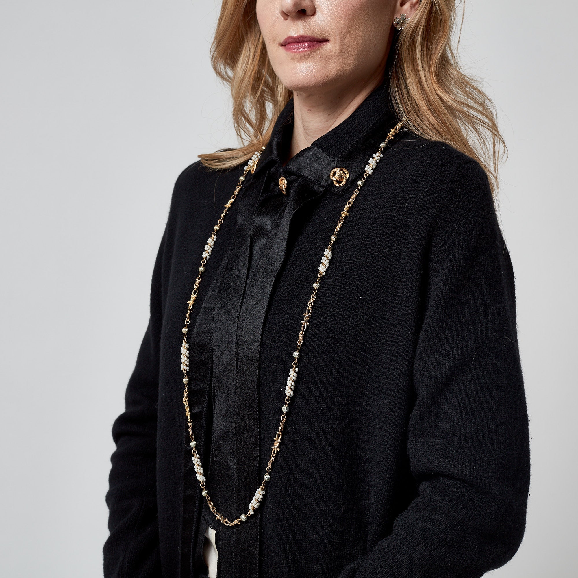 Made in France, this necklace is in good archival vintage condition. Clearly an assembly of components, each have aged separately and the gold elements are slightly different tonally. This is more noticeable with the necklace in-hand than when worn. One of the wires linking a chain element may also be a discreet repair but this is tiny and very minor. The seed pearls are holding up well with minimal nacre loss. None of these issues detract when the item is being worn and this necklace can be both enjoyed by avid Chanel collectors and wearers of fine costume jewellery or couture.