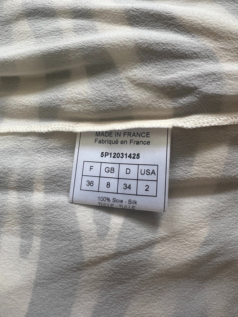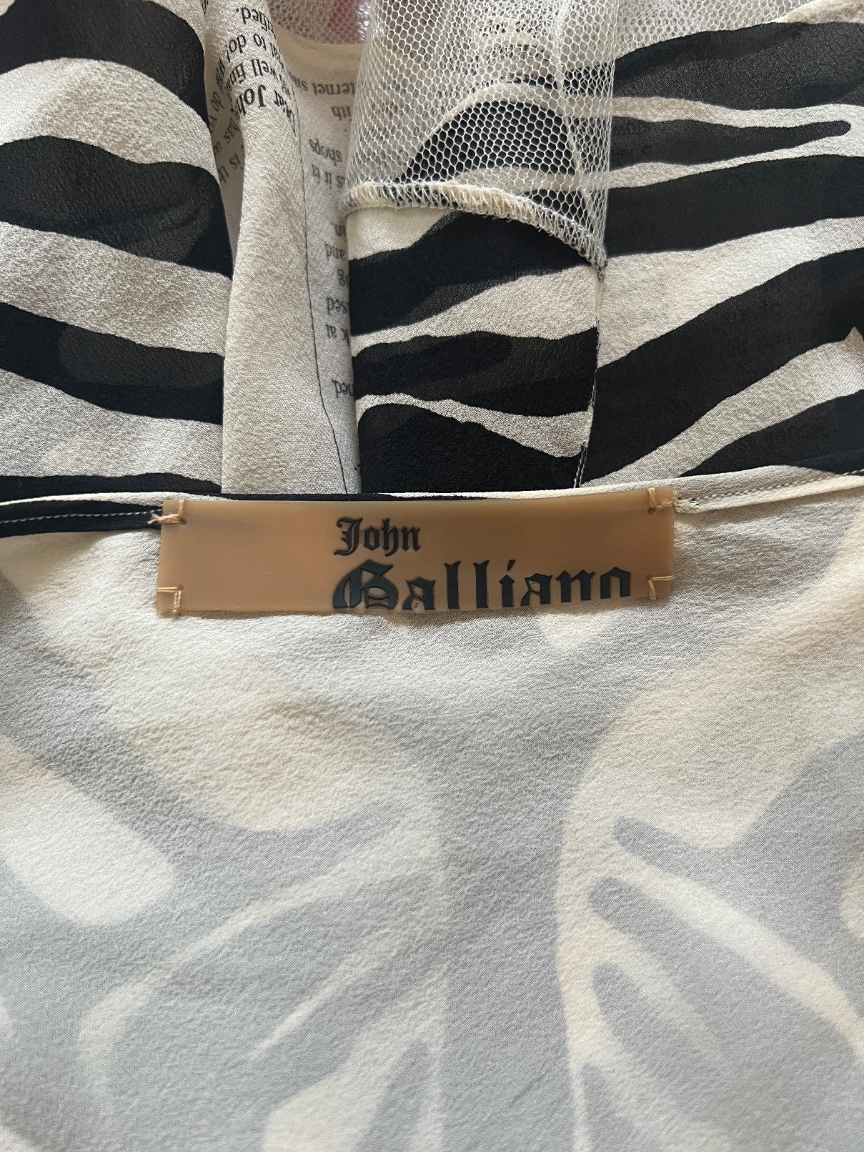 This swirling silk maxi-skirt was designed by John Galliano in his early-2000s heyday and needs no introduction. Crafted from sheer gossamer silk with silk godet panels around the hem to create fullness and movement. The panels are alternatingly patterned with a zebra hide design and the designer’s iconic newspaper print. Tailored to a high-waist cut, the waistband is secured with delicate fabric-covered buttons and fabric loops along the left hip. It is hemmed with a sheer white tulle trim and fully lined with off-white silk crepe; there are three layers overall. The nude, soft plastic brand label is present in the top of the waistband and the collection is spring / summer 2005. Labelled a UK 8 or US 2 and true to size. This sought-after piece is in excellent vintage condition with no issues of any note and worthy of the phrase 'archival vintage'. Our model (5ft 4in / 163cm) is a size UK 6-8 and this fit her well.
