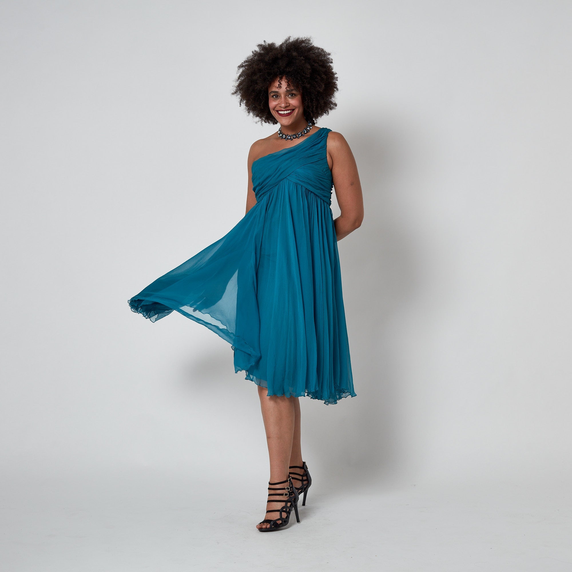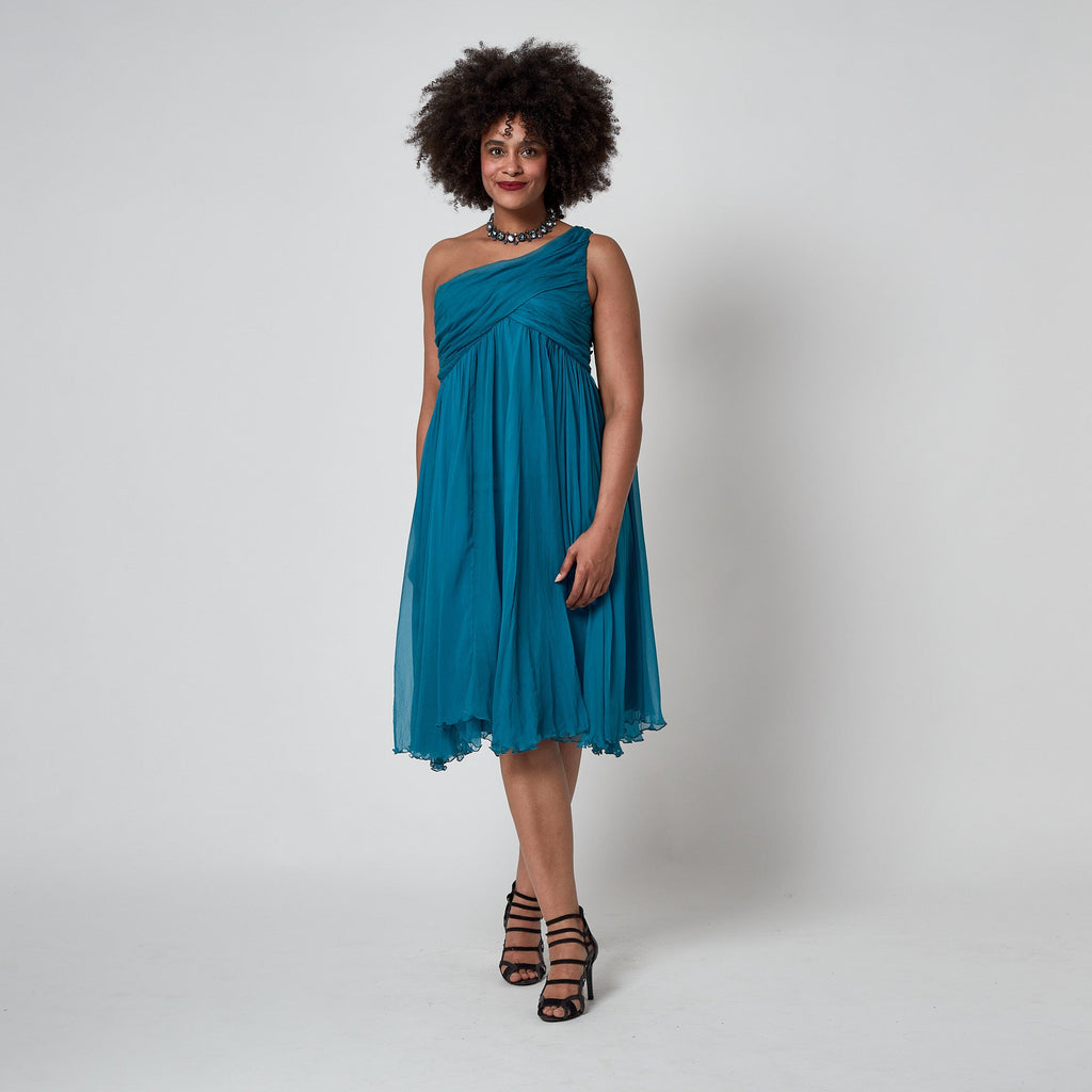 This Christian Dior teal silk dress was designed for the spring 2008 commercial collection. Created during John Galliano’s heyday at the helm of the fashion house, this vibrant blue-green silk gown showcases many of his design hallmarks. Today, pieces from Galliano’s 15 year reign at Dior are incredibly sought-after. The bodice has a one-shoulder construction, smothered in pleated teal silk chiffon which is gently ruched and ripples across down the shoulder and across the bust. The dress has an empire-line cut. The skirt flows from under the bust and falls to the calf. It is generously cut from teal silk and gently pleated, swirling around the body in a flattering, playful manner that is a Galliano signature. It has a pretty ruffled hem. The dress fastens under the left arm with nine delicate fabric-covered buttons through fabric loops, six hidden plastic snap closures and a hidden silver-tone hook-and-eye clasp. It is lined throughout with matte teal silk.