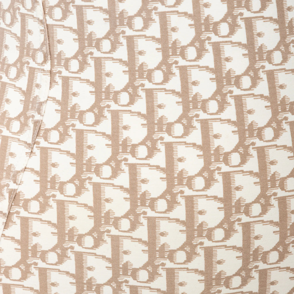 Vintage Dior monogram bodysuit by John Galliano in beige and white. Scoop neck, floral embroidery and silver “Dior” logo charm at bust. Rare early 2000s icon.