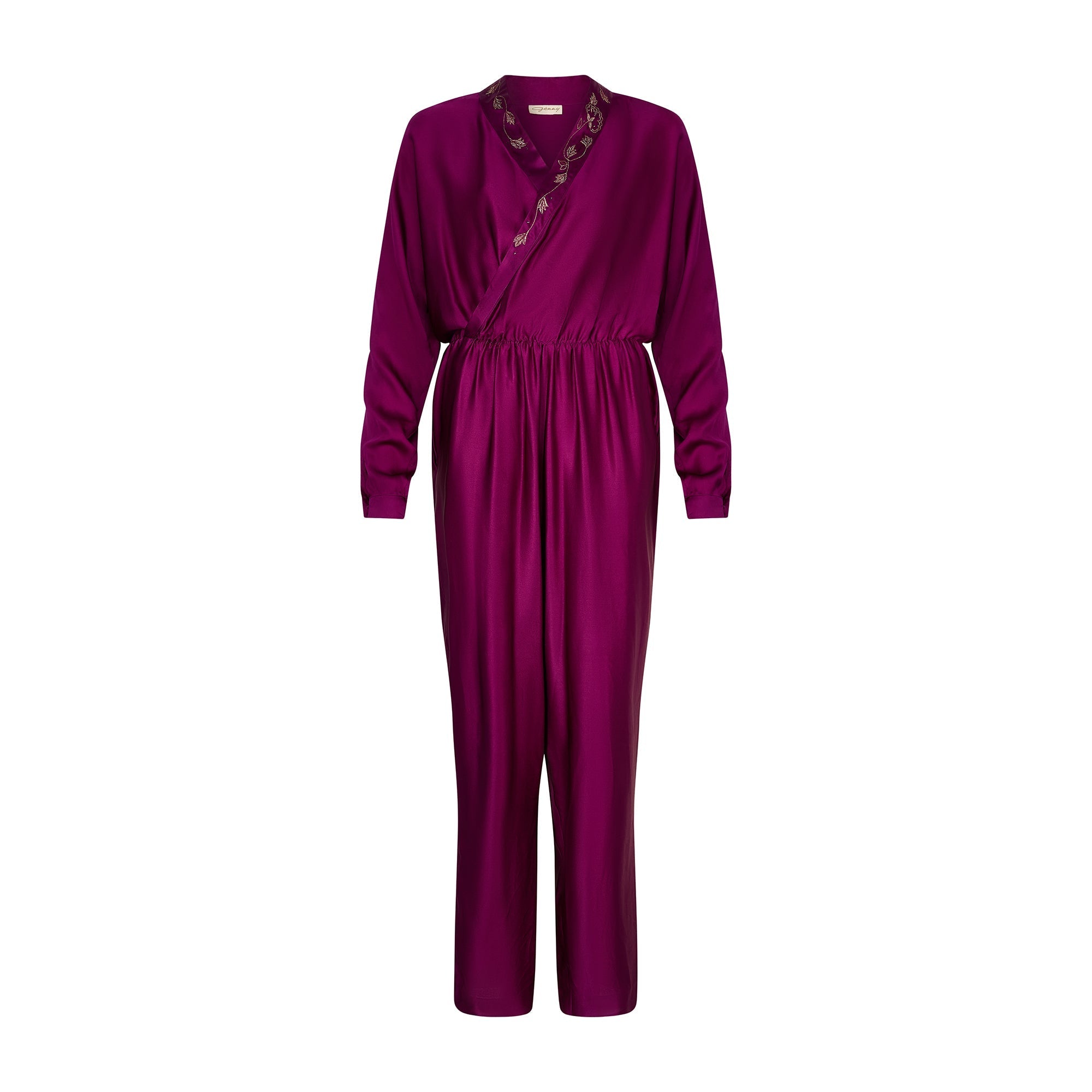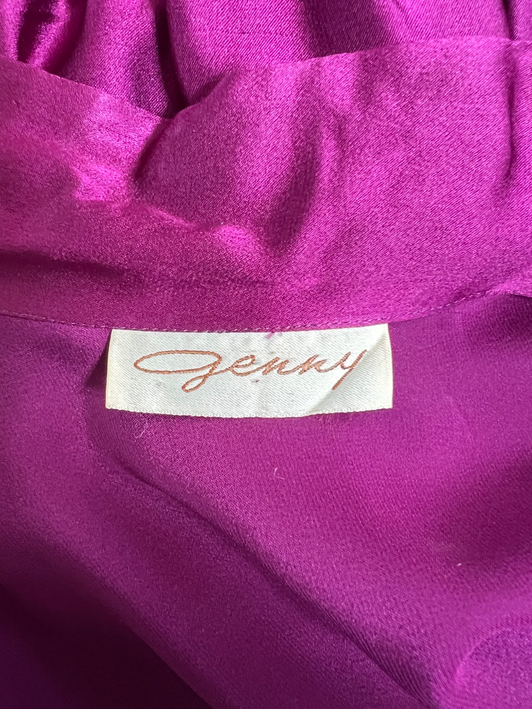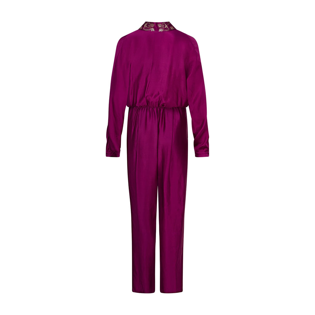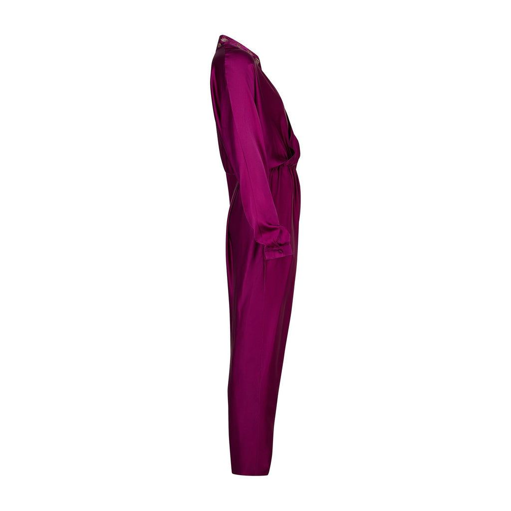 Made in Italy, this all-in-one is crafted from magnificent magenta hued silk. It has a draped, wrap front which is cut sensuously low. The waist is elasticated. The trousers are tailored to a harem style; generously cut around the hips, they narrow towards the ankles. The sleeves are long and are finished with fabric-covered button cuffs. The top is unlined but the trousers are lined with a tonal crepe. It has in-seam pockets at the hips which add to the slouchy feel. Special attention has been paid to the collar and neckline, where silver embroidery is used to embellish flowers, leaves and vines, dotted with tonal violet rhinestones - a decadent detail typical of Genny during this era.