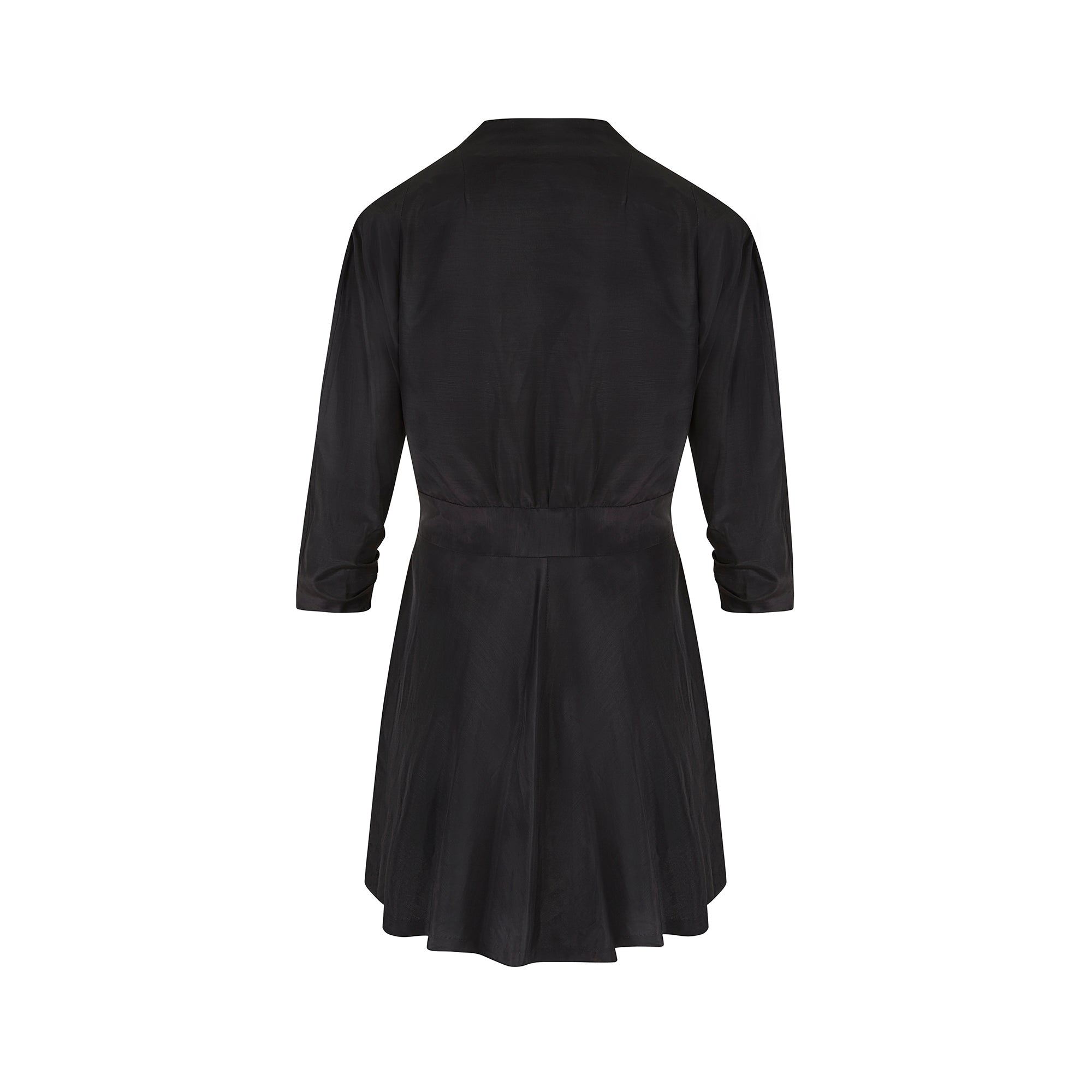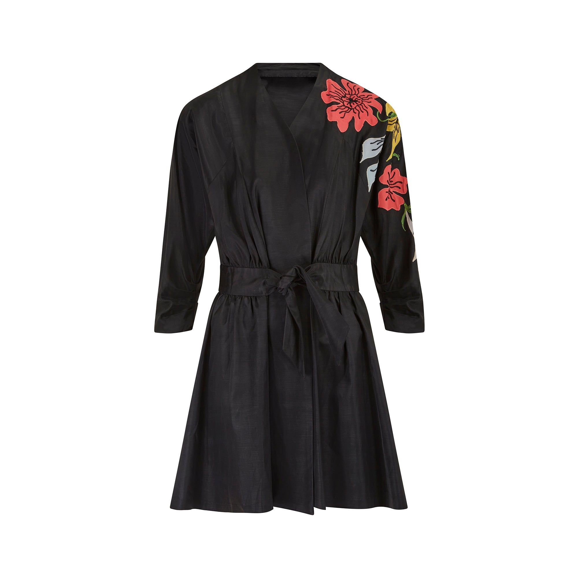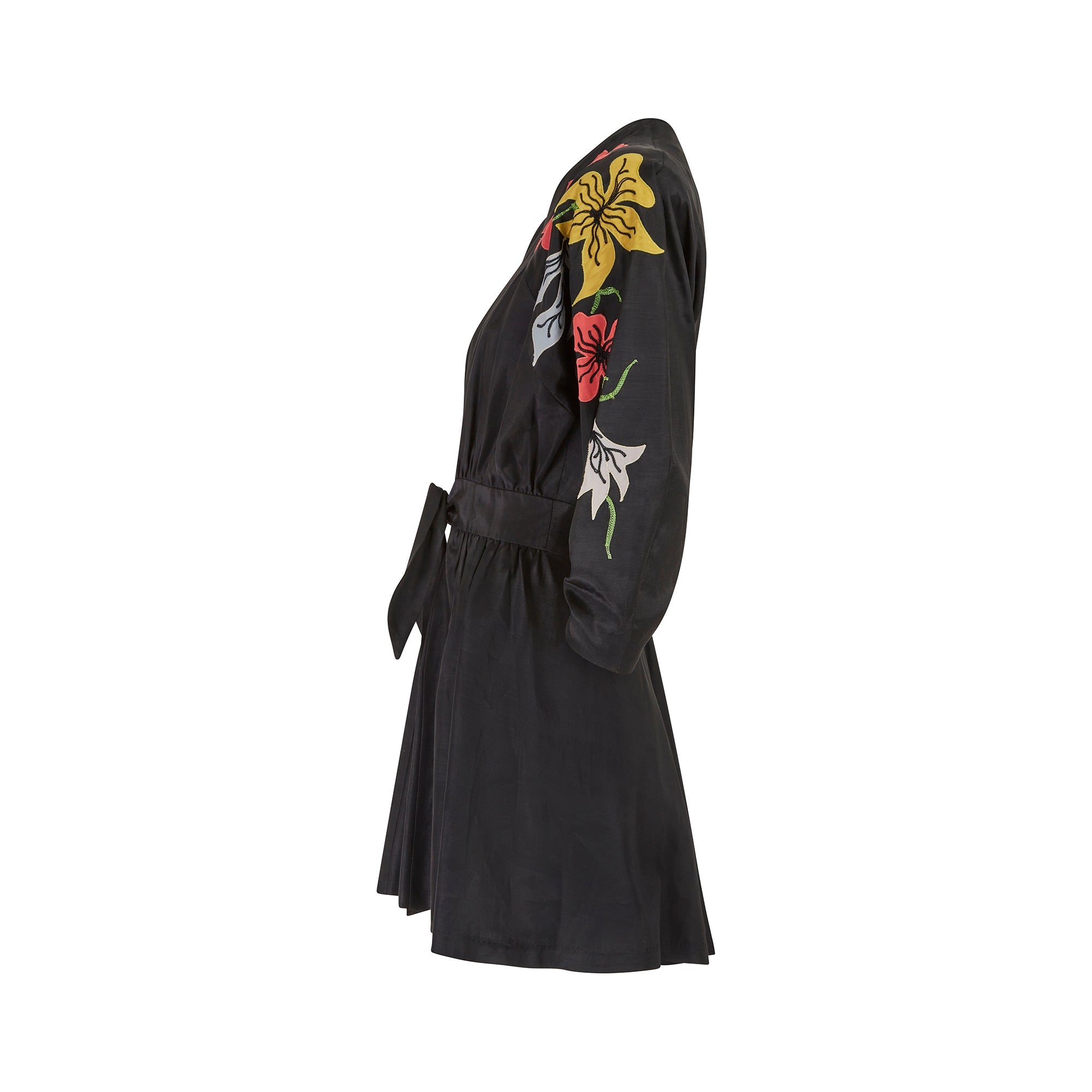 This original late 1940s kimono style jacket is tailored from a rich black, man-made grosgrain fabric which has a lovely texture and sheen. Imbued with a sense of fun, the flared cut swirls around the wearer. The left sleeve is adorned with bold appliqué flowers and foliage in coral pink, yellow and pale grey, finished with vibrant green embroidered vines. It is cut with a wrap-around silhouette which ties at the front, allowing for a flexible fit. We love it worn with black wide-leg trousers or with bare legs if you dare as it is a longer fit.